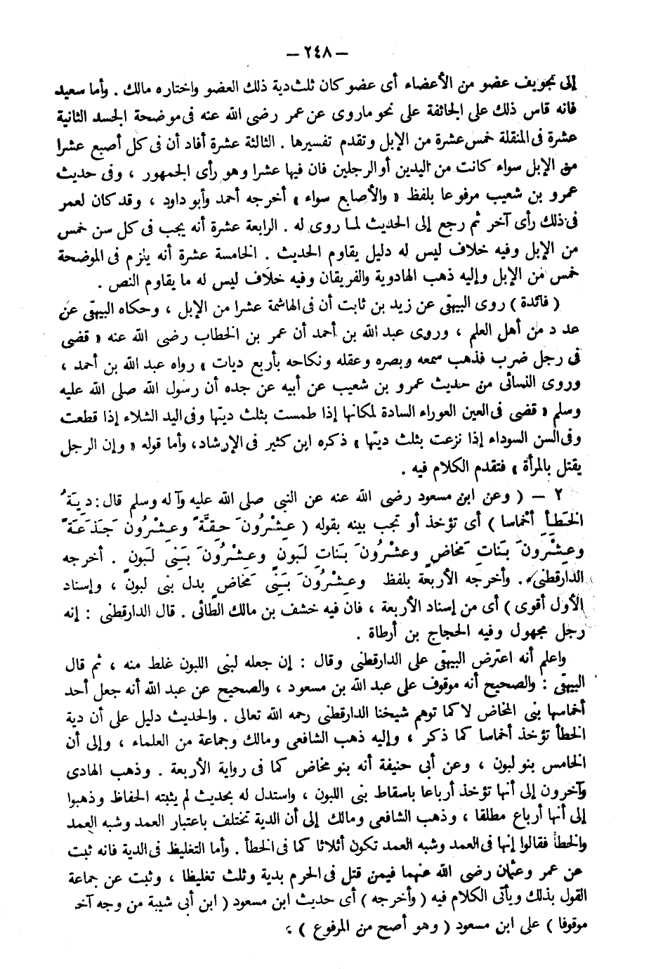 2- وعن ابن مسعود رضي الله عنه عن النبي صلى الله عليه وسلم قال "دية الخطأ أخماسا" أي تؤخذ أو تجب بينه بقوله "عشرون حقة وعشرون جذعة وعشرون بنات مخاض وعشرون بنات لبون وعشرون بني لبون" أخرجه الدارقطني وأخرجه الأربعة بلفظ وعشرون بني مخاض بدل بني لبون وإسناد الأول أقوى أي من إسناد الأربعة فإن فيه خشف بن مالك الطائي قال الدارقطني إنه رجل مجهول وفيه الحجاج بن أرطاة