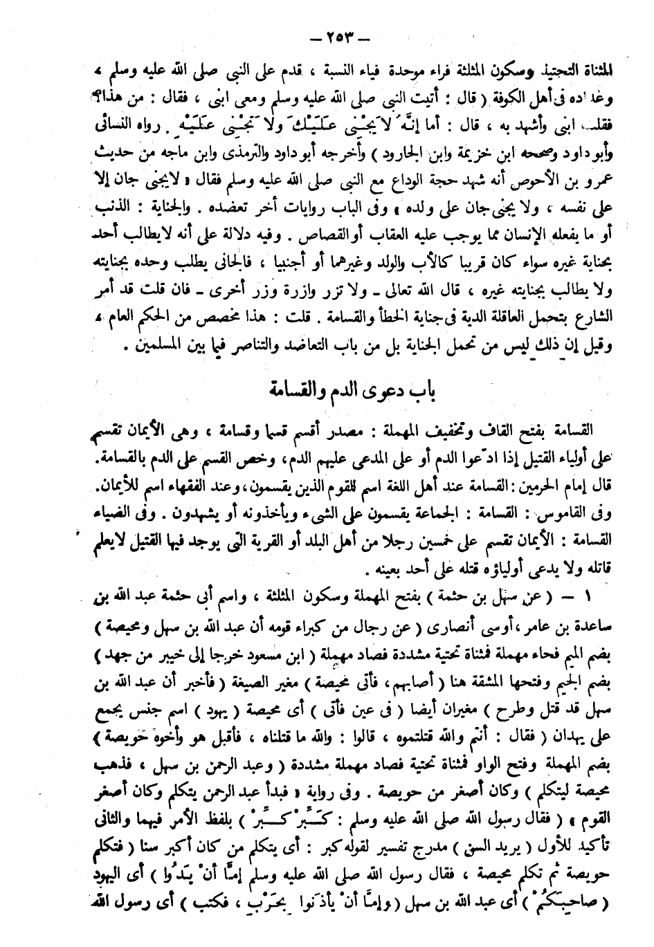 1- وعن سهل بن أبي حثمة بفتح المهملة وسكون المثلثة واسم أبي حثمة عبد الله بن ساعدة بن عامر أوسي أنصاري عن رجال من كبراء قومه أن عبد الله بن سهل ومحيصة بضم الميم فحاء مهملة فمثناة تحتية مشددة فصاد مهملة ابن مسعود خرجا إلى خيبر من جهد بضم الجيم وفتحها المشقة هنا أصابهم فأتى محيصة مغير الصيغة فأخبر أن عبد الله بن سهل قد قتل وطرح مغيران أيضا في عين فأتى أي محيصة(يهود) اسم جنس يجمع على يهدان فقال أنتم والله قتلتموه قالوا والله ما قتلناه فأقبل هو وأخوه حويصة بضم المهملة وفتح الواو فمثناة تحتية فصاد مهملة مشددة وعبد الرحمن بن سهل فذهب محيصة ليتكلم وكان أصغر من حويصة وفي رواية فبدأ عبد الرحمن يتكلم وكان أصغر القوم فقال رسول الله صلى الله وسلم: "كبر كبر" بلفظ الأمر فيهما والثاني تأكيد للأول يريد السن مدرج تفسير لقوله كبر أي يتكلم من كان أكبر سنا فتكلم حويصة ثم تكلم محيصة فقال رسول الله صلى الله عليه وسلم: "إما أن يدوا" أي اليهود "صاحبكم" أي عبد الله بن سهل "وإما أن أذنوا بحرب فكتب" أي رسول الله