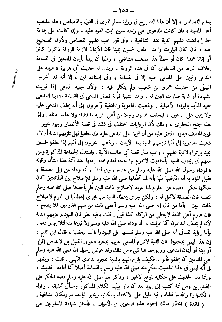 بعدم القصاص إلا أن هذا التصريح في رواية مسلم أقوى في القول بالقصاص وهذا مذهب أهل المدينة فإن كانت الدعوى على واحد معين ثبت القود عليه وإن كانت على جماعة حلفوا وثبتت عليهم الدية عند الشافعية وفي قول يجب عليهم القصاص والأول الصحيح عنه فإن كان الوارث واحدا حلف خمسين يمينا فإن الإيمان لازمة للورثة ذكورا كانوا أو إناثا عمدا كان أو خطأ هذا مذهب الشافعي ومنها أن يبدأ بأيمان المدعي في القسامة بخلاف غيرها من الدعاوى كما في هذه الرواية ويدل له حديث أبي هريرة "البينة على المدعي واليمين على المدعى عليه إلا في القسامة" وفي إسناده لين إلا أنه قد أخرجه البيهقي من حديث عمرو بن شعيب ولم يتكلم فيه قالوا ولأن جنبة المدعي إذا قويت بشهادة أو شبهة صارت اليمين له وهنا الشبهة قوية فصار المدعي في القسامة مشابها للمدعى عليه المتأيد بالبراءة الأصلية وذهبت الهادوية والحنفية وآخرون إلى أنه يحلف المدعى عليه ولا يمين على المدعين فيحلف خمسون رجلا من أهل القرية ما قتلناه ولا علمنا قاتله وإلى هذا جنح البخاري وذلك لأن الروايات اختلفت في ذلك في قصة الأنصار ويهود خيبر فيرد المختلف فيه إلى المتفق عليه من أن اليمين على المدعى عليه فإن حلفوا فهل تلزمهم الدية أم لا ذهبت الهادوية إلى أنها تلزمهم الدية بعد الأيمان وذهب آخرون إلى أنهم إذا حلفوا خمسين يمينا برئوا ولا دية عليهم وعليه تدل قصة أبي طالب الآتية واستدل الجماعة المذكورة ومن معهم في إيجاب الدية بأحاديث لا تقوم بها حجة لعدم صحة رفعها عند أئمة هذا الشأن وقوله فوداه رسول الله صلى الله عليه وسلم من عنده وفي لفظ إنه وداه من إبل الصدقة فقيل المراد به أنه اقترضها منها وأنه لما تحملها صلى الله عليه وسلم للإصلاح بين الطائفتين كان حكمها حكم القضاء عن الغارم لما غرمه لإصلاح ذات البين فلم يأخذها صلى الله عليه وسلم لنفسه فإن الصدقة لا تحل له ولكن جرى إعطاء الدية منها مجرى إعطائها في الغرم لإصلاح ذات البين وأما من قال إنه صلى الله عليه وسلم أعطى ذلك من سهم الغارمين فلا يصح فإن غارم أهل الذمة لا يعطى من الزكاة كذا قيل قلت وفيه نظر فإن اليهود لم تلزمهم الدية لأنه لم يحلف المدعون كما عرفت فما وداه صلى الله عليه وسلم إلا تبرعا منه لئلا يهدر دمه وأما رواية النسائي أنه صلى الله عليه وسلم قسمها على اليهود وأعانهم ببعضها فقال ابن القيم إن هذا ليس بمحفوظ فإنه الدية لا أفطر المدعى عليهم بمجرد دعوى القتيل بل لا بد من إقرار أو بينة أو أيمان لمدعين ولم يوجد هنا شيء من ذلك وقد عرض رسول الله صلى الله عليه وسلم على المدعين أن يحلفوا فأبوا فكيف يلزم اليهود بالدية بمجرد الدعوى انتهى قلت ويظهر لي أنه ليس في هذا الحديث حكم منه صلى الله عليه وسلم بالقسامة أصلا كما أفاده الحديث وإنما دل الحديث على حكاية للواقع لا غير وذكر لهم صلى الله عليه وسلم قصة الحكم على التقديرين ومن ثمة كتب إلى يهود بعد أن دار بينهم الكلام المذكور وسيأتي تحقيقه وقوله فكتبوا إنا والله ما قتلناه فيه دليل على الاكتفاء بالمكاتبة وبخبر الواحد مع إمكان المشافهة