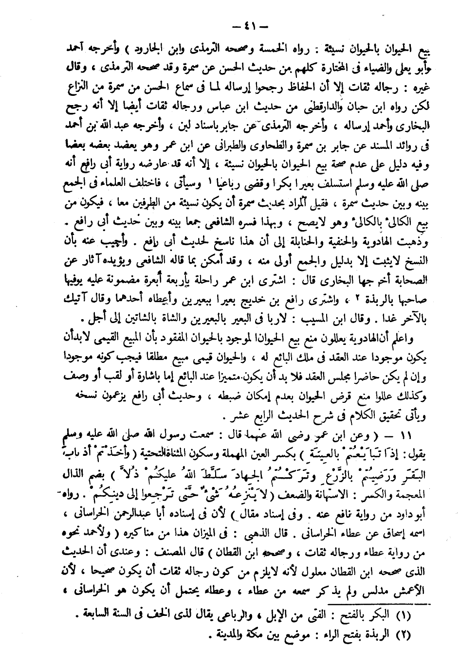 بيع الحيوان بالحيوان نسيئة" رواه الخمسة وصححه الترمذي وابن الجارود وأخرجه أحمد وأبو يعلى والضياء في المختارة كلهم من حديث الحسن عن سمرة وقد صححه الترمذي وقال غيره رجاله ثقات إلا أن الحفاظ رجحوا إرساله لما في سماع الحسن من سمرة من النزاع لكن رواه ابن حبان والدارقطني من حديث ابن عباس ورجاله ثقات أيضا إلا أنه رجح البخاري وأحمد إرساله وأخرجه الترمذي عن جابر بإسناد لين وأخرجه عبد الله بن أحمد في زوائد المسند عن جابر بن سمرة والطحاوي والطبراني عن ابن عمر وهو يعضد بعضه بعضا وفيه دليل على عدم صحة بيع الحيوان بالحيوان نسيئة إلا أنه قد عارضه رواية أبي رافع أنه صلى الله عليه وسلم استسلف بعيرا بكرا وقضى رباعيا وسيأتي فاختلف العلماء في الجمع بينه وبين حديث سمرة فقيل المراد بحديث سمرة أن يكون نسيئة من الطرفين معا فيكون من بيع الكالىء بالكالىء وهو لا يصح وبهذا فسره الشافعي جمعا بينه وبين حديث أبي رافع وذهبت الهادوية والحنفية والحنابلة إلى أن هذا ناسخ لحديث أبي رافع وأجيب عنه بأن النسخ لا يثبت إلا بدليل والجمع أولى منه وقد أمكن بما قاله الشافعي ويؤيده آثار عن الصحابة أخرجها البخاري قال اشترى ابن عمر راحلة بأربعة أبعرة مضمونة عليه يوفيها صاحبها بالربذة واشترى رافع بن خديج بعيرا ببعيرين وأعطاه أحدهما وقال آتيك وصله غدا وقال ابن المسيب لا ربا في البعير بالبعيرين والمثناة بالشاتين إلى أجل واعلم أن الهادوية يعللون منع بيع الحيوان الموجود بالحيوان المفقود بأن المبيع القيمي لا بد أن يكون موجودا عند العقد في ملك البائع له والحيوان قيمي مبيع مطلقا فيجب كونه موجودا وإن لم يكن حاضرا مجلس العقد فلا بد أن يكون متميزا عند البائع إما بإشارة أو لقب أو وصف وكذلك عللوا منع قرض الحيوان بعدم إمكان ضبطه وحديث أبي رافع يزعمون نسخه ويأتي تحقيق الكلام في شرح الحديث الرابع عشر