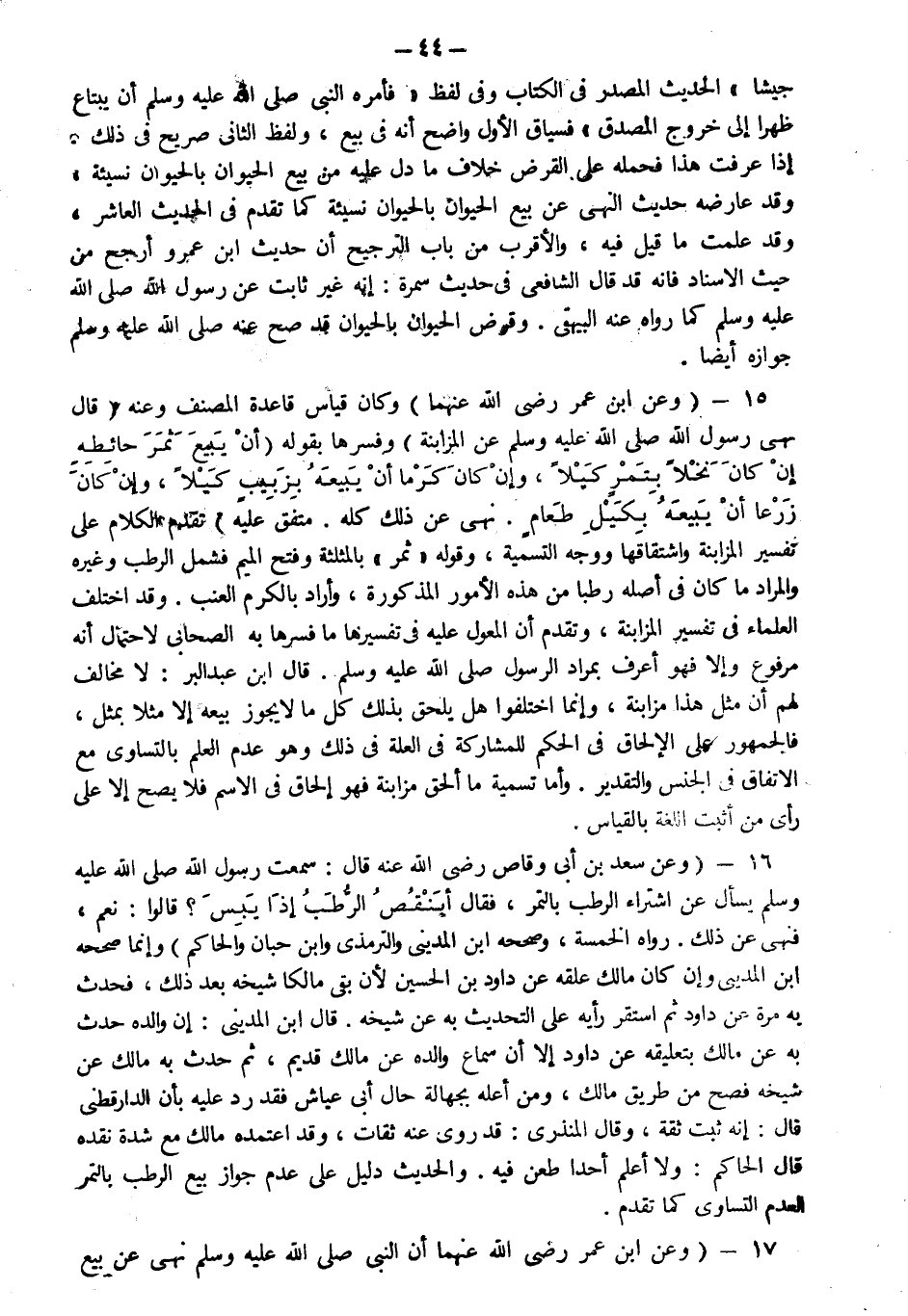 16- وعن سعد بن أبي وقاص رضي الله عنه قال "سمعت رسول الله صلى الله عليه وسلم يسأل عن اشتراء الرطب بالتمر فقال: "أينقص الرطب إذا يبس؟" قالوا نعم فنهى عن ذلك" رواه الخمسة وصححه ابن المديني والترمذي وابن حبان والحاكم وإنما صححه ابن المديني وإن كان مالك علقه عن داود بن الحصين لأن مالكا لقي شيخه بعد ذلك فحدث به مرة عن داود ثم استقر رأيه على التحديث به عن شيخه قال ابن المديني إن والده حدث به عن مالك بتعليقه عن داود إلا أن سماع والده عن مالك قديم ثم حدث به مالك عن شيخه فصح من طريق مالك ومن أعله بجهالة حال أبي عياش فقد رد عليه بأن الدارقطني قال إنه ثبت ثقة وقال المنذري قد روى عنه ثقات وقد اعتمده مالك مع شدة نقده قال الحاكم ولا أعلم أحدا طعن فيه والحديث دليل على عدم جواز بيع الرطب بالتمر لعدم التساوي كما تقدم