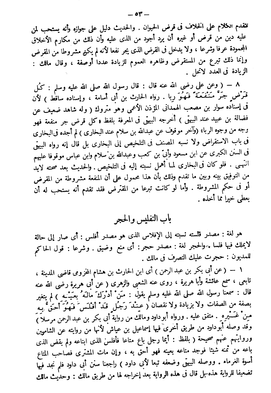 8- وعن علي رضي الله عنه قال قال رسول الله صلى الله عليه وسلم: "كل قرض جر منفعة فهو ربا" رواه الحارث بن أبي أسامة وإسناده ساقط لأن في إسناده سوار بن مصعب الهمداني المؤذن الأعمى وهو متروك وله شاهد ضعيف عن فضالة بن عبيد عند البيهقي أخرجه البيهقي في المعرفة بلفظ كل قرض جر منفعة فهو وجه من وجوه الربا وآخر موقوف عن عبد الله بن سلام عند البخاري لم أجده في البخاري في باب الاستقراض ولا نسبه المصنف في التلخيص إلى البخاري بل قال إنه رواه البيهقي في السنن الكبرى عن ابن مسعود وأبي بن كعب وعبد الله بن سلام وابن عباس موقوفا عليهم انتهى فلو كان في البخاري لما أهمل نسبته إليه في التلخيص والحديث بعد صحته لا بد من التوفيق بينه وبن ما تقدم وذلك بأن هذا محمول على أن المنفعة مشروطة من المقرض أو في حكم المشروطة وأما لو كانت تبرعا من المقترض فقد تقدم أنه يستحب له أن يعطي خيرا مما أخذه