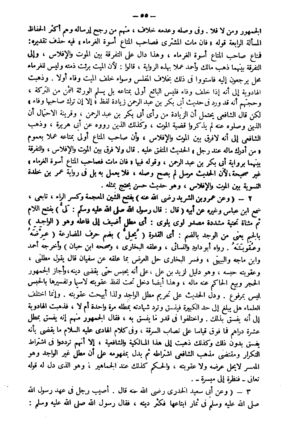 2- وعن عمرو بن الشريد رضي الله عنه بفتح الشين المعجمة وكسر الراء تابعي سمع ابن عباس وغيره عن أبيه قال "قال رسول الله صلى الله عليه وسلم لي" : بفتح اللام ثم مثناة تحتية مشددة مصدر لوى يلوي أي مطل أضيف إلى فاعله "وهو الواجد" بالجيم يعني من الوجد بالضم أي القدرة "يحل" بضم حرف المضارعة "عرضه وعقوبته " رواه أبو داود والنسائي وعلقه البخاري وصححه ابن حبان وأخرجه أحمد وابن ماجه والبيهقي وفسر البخاري حل العرض بما علقه عن سفيان قال يقول مطلني وعقوبته حبسه وهو دليل لزيد بن علي أنه يحبس حتى يقضي دينه وأجاز الجمهور الحجر وبيع الحاكم عنه ماله وهذا أيضا داخل تحت لفظ عقوبته لا سيما وتفسيرها بالحبس ليس بمرفوع ودل الحديث على تحريم مطل الواجد ولذا أبيحت عقوبته وإنما اختلف العلماء هل يبلغ إلى حد الكبيرة فيفسق وترد شهادته بمطله مرة واحدة أم لا فذهبت الهادوية إلى أنه يفسق بذلك واختلفوا في قدر ما يفسق به فقال الجمهور منهم إنه يفسق بمطل عشرة دراهم فما فوق قياسا على نصاب السرقة وفي كلام الهادي عليه السلام ما يقضي بأنه يفسق بدون ذلك وكذلك ذهبت إلى هذا المالكية والشافعية إلا أنهم ترددوا في اشتراط التكرار فأتى مذهب الشافعي اشتراطه ثم يدل بمفهومه على أن الواجد وهو المعسر لا يحل عرضه ولا عقوبته والحكم كذلك عند الجماهير وهو الذي دل على قوله تعالى :{فَنَظِرَةٌ إِلَى مَيْسَرَةٍ}