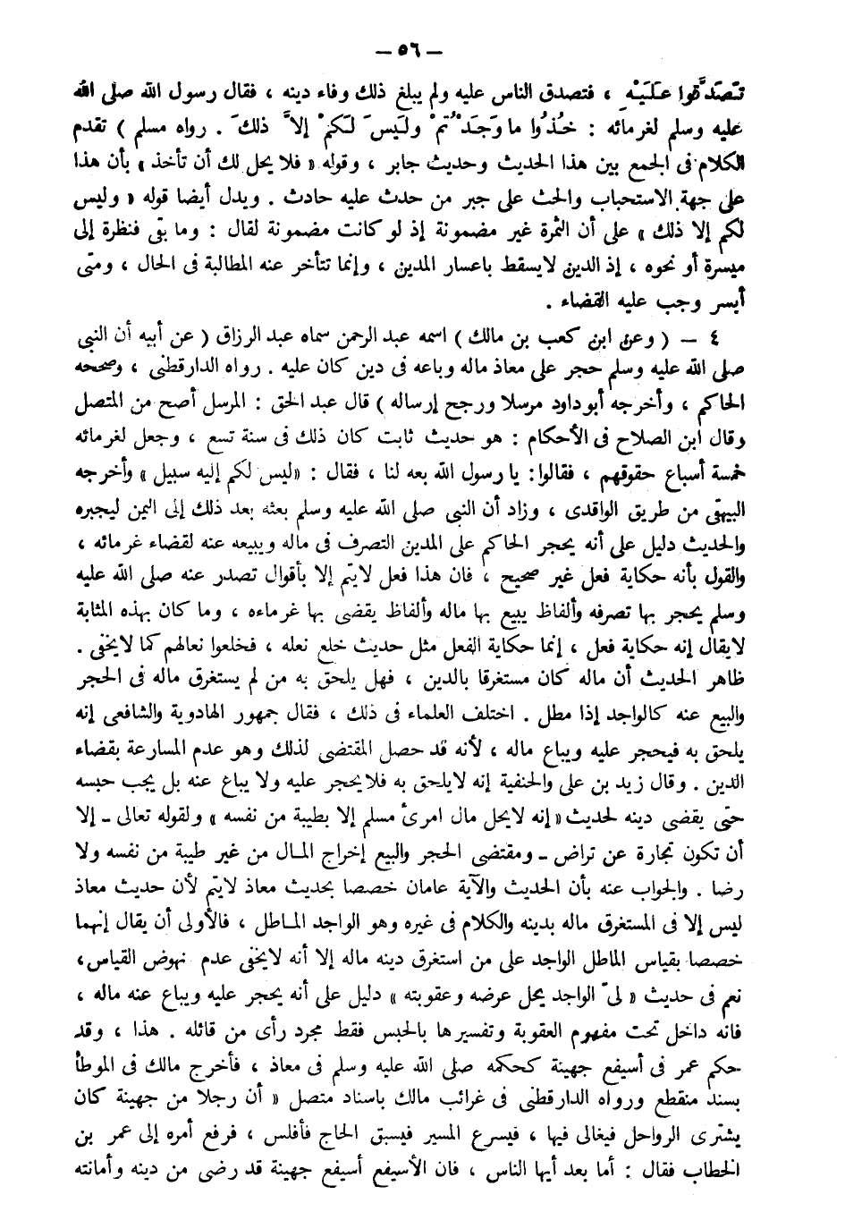 4- وعن ابن كعب بن مالك اسمه عبد الرحمن سماه عبد الرزاق عن أبيه "أن النبي صلى الله عليه وسلم حجر على معاذ ماله وباعه في دين كان عليه" رواه الدارقطني وصححه الحاكم وأخرجه أبو داود مرسلا ورجح إرساله قال عبد الحق المرسل أصح من المتصل وقال ابن الصلاح في الأحكام هو حديث ثابت كان ذلك في سنة تسع وجعل لغرمائه خمسة أسباع حقوقهم فقالوا يا رسول الله بعه لنا فقال: "ليس لكم إليه سبيل" وأخرجه البيهقي من طريق الواقدي وزاد أن النبي صلى الله عليه وسلم بعثه بعد ذلك إلى اليمن ليجبره والحديث دليل على أنه يحجر الحاكم على المدين التصرف في ماله ويبيعه عنه لقضاء غرمائه والقول بأنه حكاية فعل غير صحيح فإن هذا فعل لا يتم إلا بأقوال تصدر عنه صلى الله عليه وسلم يحجر بها تصرفه وألفاظ يبيع بها ماله وألفاظ يقضي بها غرماءه وما كان بهذه المثابة لا يقال إنه حكاية فعل إنما حكاية الفعل مثل حديث خلع نعله فخلعوا نعالهم كما لا يخفى ظاهر الحديث أن ماله كان مستغرقا بالدين فهل يلحق به من لم يستغرق ماله في الحجر والبيع عنه كالواجد إذا مطل اختلف العلماء في ذلك فقال جمهور الهادوية و الشافعي إنه يلحق به فيحجر عليه ويباع ماله لأنه قد حصل المقتضي لذلك وهو عدم المسارعة بقضاء الدين وقال زيد بن علي والحنفية إنه لا يلحق به فلا يحجر عليه ولا يباع عنه بل يجب حبسه حتى يقضي دينه لحديث إنه "لا يحل مال امرىء مسلم إلا بطيبة من نفسه" ولقوله تعالى {إِلَّا أَنْ تَكُونَ تِجَارَةً عَنْ تَرَاضٍ} ومقتضى الحجر والبيع إخراج المال من غير طيبة من نفسه ولا رضاه والجواب عنه بأن الحديث والآية عامان خصصا بحديث معاذ لا يتم لأن حديث معاذ ليس إلا في المستغرق ماله بدينه والكلام في غيره وهو الواجد الماطل فالأولى أن يقال أنهما خصصا بقياس الماطل الواجد على من استغرق دينه ماله إلا أنه لا يخفى عدم نهوض القياس نعم في حديث "لي الواجد يحل عرضه وعقوبته" دليل على أنه يحجر عليه ويباع عنه ماله فإنه داخل تحت مفهوم العقوبة وتفسيرها بالحبس فقط مجرد رأي من قائله هذا وقد حكم عمر في أسيفع جهينة كحكمه صلى الله عليه وسلم في معاذ فأخرج مالك في الموطأ بسند منقطع ورواه الدارقطني في غرائب مالك بإسناد متصل أن رجلا من جهينة كان يشتري الرواحل فيغالي فيها فيسرع المسير فيسبق الحاج فأفلس فرفع أمره إلى عمر بن الخطاب فقال أما بعد أيها الناس فإن الأسيفع أسيفع جهينة قد رضي من دينه وأمانته
