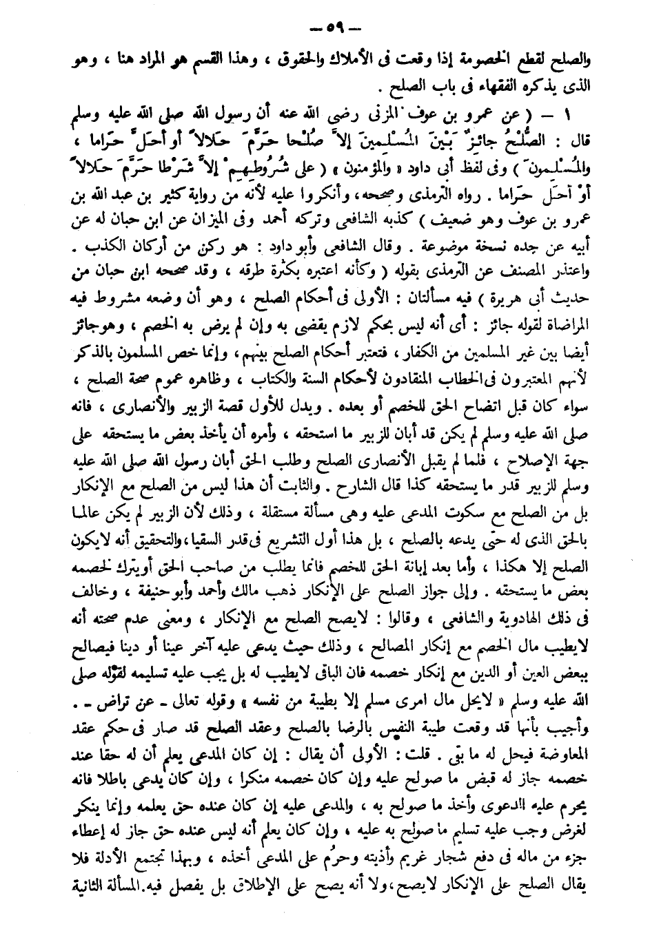 1- عن عمرو بن عوف المزني رضي الله عنه أن رسول الله صلى الله عليه وسلم قال: "الصلح جائز بين المسلمين إلا صلحا حرم حلالا أو أحل حراما والمسلمون" وفي لفظ أبي داود "والمؤمنون على شروطهم إلا شرطا حرم حلالا أو أحل حراما" رواه الترمذي وصححه وأنكروا عليه لأنه من رواية كثير بن عبد الله بن عمرو بن عوف وهو ضعيف كذبه الشافعي وتركه أحمد وفي الميزان عن ابن حبان له عن أبيه عن جده نسخة موضوعة وقال الشافعي وأبو داود هو ركن من أركان الكذب واعتذر المصنف عن الترمذي بقوله وكأنه اعتبره بكثرة الإشارة وقد صححه ابن حبان من حديث أبي هريرة فيه مسألتان الأولى في أحكام الصلح وهو أن وضعه مشروط فيه المراضاة لقوله جائز أي أنه ليس بحكم لازم يقضى به وإن لم يرض به الخصم وهو جائز أيضا بين غير المسلمين من الكفار فتعتبر أحكام الصلح بينهم وإنما خص المسلمون بالذكر لأنهم المعتبرون في الخطاب المنقادون لأحكام السنة والكتاب وظاهره عموم صحة الصلح سواء كان قبل اتضاح الحق للخصم أو بعده ويدل للأول قصة الزبير والأنصاري فإنه صلى الله عليه وسلم لم يكن قد أبان للزبير ما استحقه وأمره أن يأخذ بعض ما يستحقه على جهة الإصلاح فلما لم يقبل الأنصاري الصلح وطلب الحق أبان رسول الله صلى الله عليه وسلم للزبير قدر ما يستحقه كذا قال الشارح والثابت أن هذا ليس من الصلح مع الإنكار بل من الصلح مع سكوت المدعى عليه وهي مسألة مستقلة وذلك لأن الزبير لم يكن عالما الفراش الذي له حتى يدعه بالصلح بل هذا أول التشريع في قدر السقيا والتحقيق أنه لا يكون الصلح إلا هكذا وأما بعد إبانة الحق للخصم فإنما يطلب من صاحب الحق أن يترك لخصمه بعض ما يستحق وإلى جواز الصلح على الإنكار ذهب مالك وأحمد وأبو حنيفة عدا في ذلك الهادوية والشافعي وقالوا لا يصح الصلح مع الإنكار ومعنى عدم صحته أنه لا يطيب مال الخصم مع إنكار المصالح وذلك حيث يدعي عليه آخر عينا أو دينا فيصالح ببعض العين أو الدين مع إنكار خصمه فإن الباقي لا يطيب له بل يجب عليه تسليمه لقوله صلى الله عليه وسلم لا يحل مال امرىء مسلم إلا بطيبة من نفسه وقوله تعالى {عَنْ تَرَاضٍ} وأجيب بأنها قد وقعت طيبة النفس بالرضا بالصلح وعقد الصلح قد صار في حكم عقد المعاوضة فيحل له ما بقي قلت الأولى أن يقال إن كان المدعي يعلم أن له حقا عند خصمه جاز له قبض ما صولح عليه وإن كان خصمه منكراً وإن كان يدعي باطلا فإنه يحرم عليه الدعوى وأخذ ما صولح به والمدعى عليه إن كان عنده حق يعلمه وإنما ينكر لغرض عليه تسليم ما صولح به عليه وإن كان يعلم أنه ليس عنده حق جاز له إعطاء جزء من ماله في دفع شجار غريم وأذيته وحرم على المدعي أخذه وبهذا تجتمع الأدلة فلا يقال الصلح على الإنكار لا يصح ولا أنه يصح على الإطلاق بل يفصل فيه المسألة الثانية