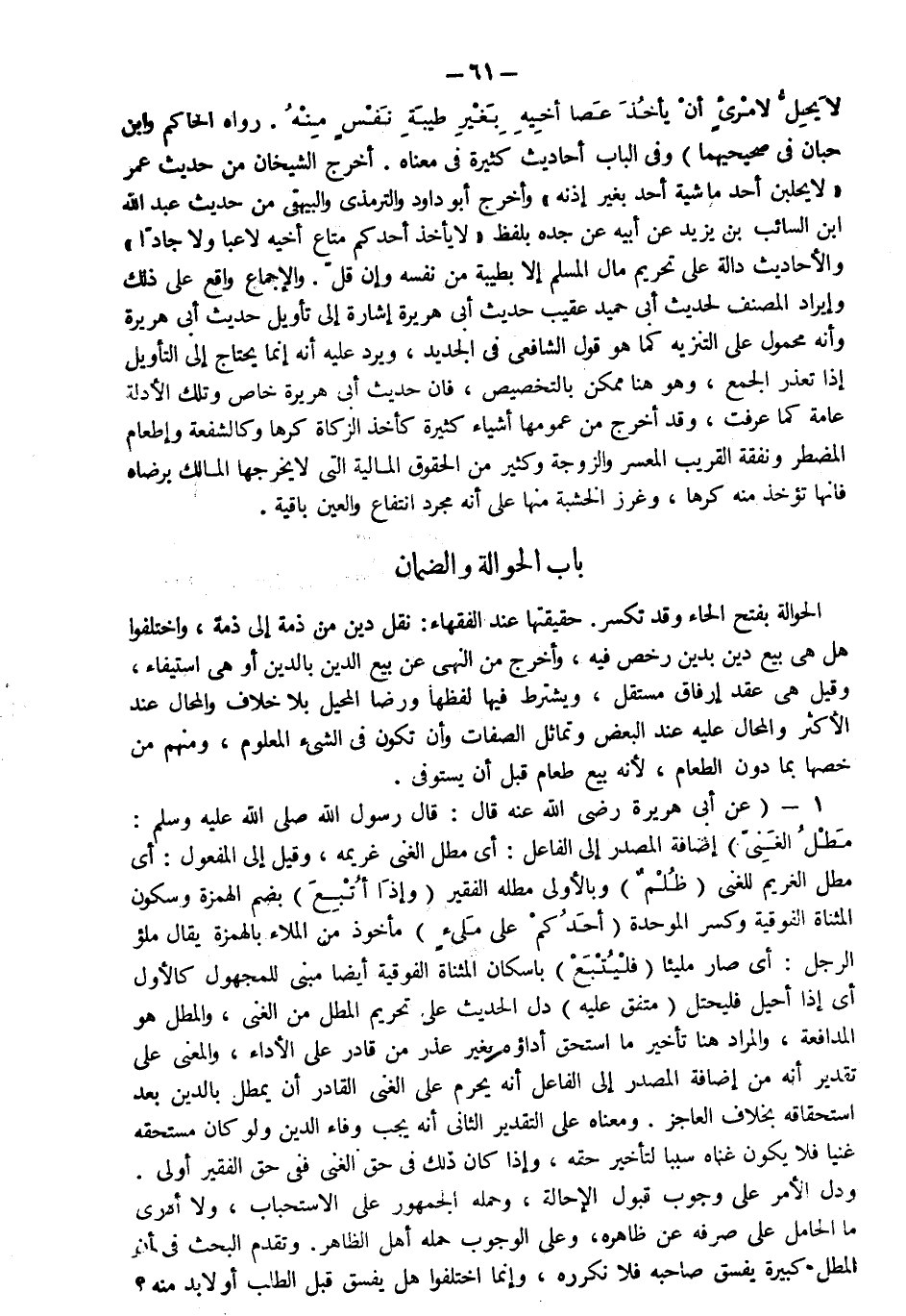 1- عن أبي هريرة رضي الله عنه قال قال رسول الله صلى الله عليه وسلم: "مطل الغني " إضافة للمصدر إلى الفاعل أي مطل الغني غريمه وقيل إلى المفعول أي مطل الغريم للغني "ظلم" وبالأولى مطله الفقير "وإذا أتبع" بضم الهمزة وسكون المثناة الفوقية وكسر والموحدة "أحدكم على مليء" مأخوذ من الملاء بالهمزة يقال ملؤ الرجل أي صار مليئا "فليتبع" بإسكان المثناة الفوقية أيضا مبني للمجهول كالأول أي إذا أحيل فليحتل متفق عليه دل الحديث على تحريم المطل من الغني والمطل هو المدافعة والمراد هنا تأخير ما استحق أداؤه بغير عذر من قادر على الأداء والمعنى على تقدير أنه من إلى الفاعل أنه يحرم على الغني القادر أن يمطل بالدين بعد استحقاقه بخلاف العاجز ومعناه على التقدير الثاني أنه يجب وفاء الدين ولو كان مستحقه غنيا فلا يكون غناه سببا لتأخير حقه وإذا كان ذلك في حق الغني ففي حق الفقير أولى ودل الأمر على وجوب قبول الإحالة وحمله الجمهور على الاستحباب ولا أدري ما الحامل على صرفه عن ظاهره وعلى الوجوب حمله أهل الظاهر وتقدم البحث في أن المطل كبيرة يفسق صاحبه فلا نكرره وإنما اختلفوا هل يفسق قبل الطلب أو لا بد منه