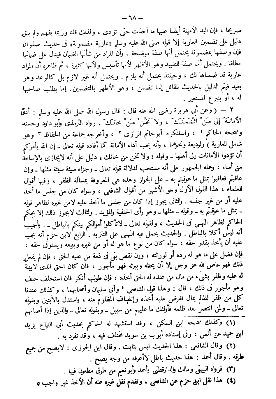 2- وعن أبي هريرة رضي الله عنه قال قال رسول الله صلى الله عليه وسلم: "أدِّ الأمانة إلى من ائتمنك ولا تخن من خانك" رواه والترمذي أبو داود وحسنه وصححه الحاكم واستنكره أبو حاتم الرازي وأخرجه جماعة من الحفاظ وهو شامل للعارية والوديعة ونحوهما وأنه يجب أداء الأمانة كما أفاده قوله تعالى: {إِنَّ اللَّهَ يَأْمُرُكُمْ أَنْ تُؤَدُّوا الْأَمَانَاتِ إِلَى أَهْلِهَا} وقوله "لا تخن من خانك " دليل على أنه لا يجازي بالإساءة من أساء وحمله الجمهور على أنه مستحب لدلالة قوله تعالى :{وَجَزَاءُ سَيِّئَةٍ سَيِّئَةٌ مِثْلُهَا} {وَإِنْ عَاقَبْتُمْ فَعَاقِبُوا بِمِثْلِ مَا عُوقِبْتُمْ بِهِ} على الجواز وهذه هي المعروفة بمسألة الظفر وفيها أقوال للعلماء هذا القول الأول وهو الأشهر من أقوال الشافعي وسواء كان من جنس ما أخذ عليه أو من غيره جنسه والثاني يجوز إذا كان من جنس ما أخذ عليه لا من غيره لظاهر قوله بمثل ما عوقبتم به وقوله مثلها وهو رأي الحنفية و المؤيد والثالث لا يجوز ذلك إلا بحكم لظاهر النهي في الحديث ولقوله تعالى: {لا تَأْكُلُوا أَمْوَالَكُمْ بَيْنَكُمْ بِالْبَاطِلِ} وأجيب أنه ليس أكلا بالباطل والحديث يحمل فيه النهي على التنزيه الرابع لابن حزم أنه يجب عليه أن يأخذ بقدر حقه سواء كان من نوع ما هو له أو من غيره ويعينه ويستوفي حقه فإن فضل على ما هو له رده أو لورثته وإن نقص بقي في ذمة من عليه الحق فإن لم يفعل ذلك فهو عاص لله عز وجل إلا أن يحلله ويبرئه فهو مأجور فإن كان الحق الذي له لا بينة له عليه وظفر بشيء من مال من عنده له الحق أخذه فإن طولب أنكر فإن استحلف حلف وهو مأجور في ذلك قال وهذا هو قول الشافعي وأبي سليمان وأصحابهما وكذلك ثمنا كل من ظفر لظالم بمال ففرض عليه أخذه وإنصاف المظلوم منه واستدل بالآيتين بقوله تعالى: {وَلَمَنِ انْتَصَرَ بَعْدَ ظُلْمِهِ فَأُولَئِكَ مَا عَلَيْهِمْ مِنْ سَبِيلٍ} وبقوله تعالى :{وَالَّذِينَ إِذَا أَصَابَهُمُ