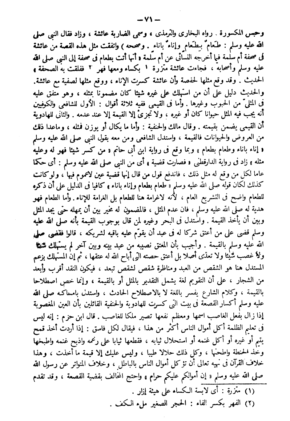 وحبس المكسورة" رواه البخاري والترمذي وسمى الضاربة عائشة وزاد "فقال النبي صلى الله عليه وسلم طعام بطعام وإناء بإناء " وصححه واتفقت مثل هذه القصة من عائشة في صحفة أم سلمة فيما أخرجه النسائي عن أم سلمة "أنها أتت بطعام في صحفة إلى النبي صلى الله عليه وسلم وأصحابه فجاءت عائشة متزرة بكساء ومعها فهر ففلقت به الصحفة" الحديث وقد وقع مثلها لحفصة وأن عائشة كسرت الإناء ووقع مثلها لصفية مع عائشة والحديث دليل على أن من استهلك على غيره شيئا كان مضمونا بمثله وهو متفق عليه في المثلى من الحبوب وغيرها وأما في القيمي ففيه ثلاثة أقوال الأول للشافعي والكوفيين أنه يجب فيه المثل حيوانا كان أو غيره ولا تجزئ القيمة إلا عند عدمه والثاني للهادوية أن القيمي يضمن بقيمته وقال مالك والحنفية أما ما يكال أو يوزن فمثله وما عدا ذلك من العروض والحيوانات فالقيمة واستدل الشافعي ومن معه بقول النبي صلى الله عليه وسلم "إناء بإناء وطعام بطعام" وبما وقع في رواية ابن أبي حاتم "من كسر شيئا فهو له وعليه مثله" زاد في رواية الدارقطني فصارت قضية أي من النبي صلى الله عليه وسلم أي حكما عاما لكل من وقع له مثل ذلك فاندفع قول من قال إنها قضية عين لا عموم فيها ولو كانت كذلك لكان قوله صلى الله عليه وسلم "طعام بطعام وإناء بإناء" كافيا في الدليل على أن ذكره للطعام واضح في التشريع العام لأنه لا غرامة هنا للطعام بل الغرامة للإناء وأما الطعام فهو هدية له صلى الله عليه وسلم فإن عدم المثل فالمضمون له مخير بين أن يمهله حتى يجد المثل وبين أن يأخذ القيمة واستدل في البحر وغيره لمن قال بوجوب القيمة بأنه صلى الله عليه وسلم قضى على من أعتق شركا له في عبد أن يقوم عليه باقيه لشريكه قالوا فقضى صلى الله عليه وسلم بالقيمة وأجيب بأن المعتق نصيبه من عبد بينه وبين آخر لم يستهلك شيئا ولا غصب شيئا ولا تعدى أصلا بل أعتق حصته التي أباح الله له عتقها ثم إن المستهلك بزعم المستدل هنا هو الشقص من العبد ومناظرة شقص لشقص تبعد فيكون النقد أقرب وأبعد من الشجار على أن التقويم لغة يشمل التقدير بالمثل أو بالقيمة وإنما خص اصطلاحا بالقيمة وكلام الشارع يفسر باللغة لا بالاصطلاح الحادث واستدل بإمساكه صلى الله عليه وسلم أكسار القصعة في بيت التي كسرت الهادوية والحنفية القائلين بأن العين المغصوبة إذا زال بفعل الغاصب أسمها ومعظم نفعها تصير ملكا للغاصب قال ابن حزم إنه ليس في تعليم الظلمة أكل أموال الناس أكثر من هذا فيقال لكل فاسق إذا أردت أخذ قمح يتيم أو غيره أو أكل غنمه أو استحلال ثيابه فقطعها ثيابا على رغمه واذبح غنمه واطبخها وخذ الحنطة واطحنها وكل ذلك حلالا طيبا وليس عليك إلا قيمة ما أخذت وهذا خلاف القرآن في نهيه تعالى أن يؤكل أموال الناس بالباطل وخلاف المتواتر عن رسول الله صلى الله عليه وسلم "إن أموالكم عليك حرام" واحتج المخالف بقضية القصعة وقد تقدم