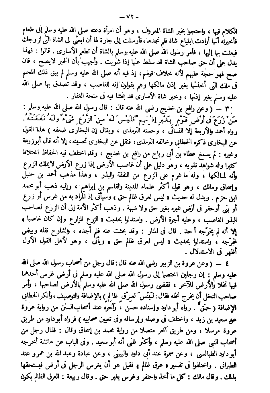3- وعن رافع بن خديج رضي الله عنه قال قال رسول الله صلى الله عليه وسلم: "من زرع في أرض قوم بغير إذنهم فليس له من الزرع شيء وله نفقته" رواه أحمد والأربعة إلا النسائي وحسنه الترمذي ويقال إن البخاري ضعفه هذا القول عن البخاري ذكره الخطابي وخالفه الترمذي فنقل عن البخاري تحسينه إلا أنه قال أبو زرعة وغيره لم يسمع عطاء بن أبي رباح من رافع بن خديج وقد اختلف فيه الحفاظ اختلافا كثيرا وله شواهد تقويه وهو دليل على أن غاصب الأرض إذا زرع الأرض لا يملك الزرع وأنه لمالكها وله ما غرم على الزرع من النفقة والبذر وهذا مذهب أحمد بن حنبل وإسحاق و مالك وهو قول أكثر علماء المدينة والقاسم بن إبراهيم وإليه ذهب أبو محمد بن حزم ويدل له حديث "ليس لعرق ظالم حق" وسيأتي إذ المراد به من غرس أو زرع أو حفر في أرض غيره بغير حق ولا شبهة وذهب أكثر الأمة إلى أن الزرع لصاحب البذر الغاصب وعليه أجرة الأرض واستدلوا بحديث الزرع للزارع وإن كان غاصبا إلا أنه لم يخرجه أحد قال في المنار وقد بحثت عنه فلم أجده والشارح نقله وبيض لمخرجه واستدلوا بحديث ليس لعرق ظالم حق ويأتي وهو لأهل القول الأول أظهر في الاستدلال