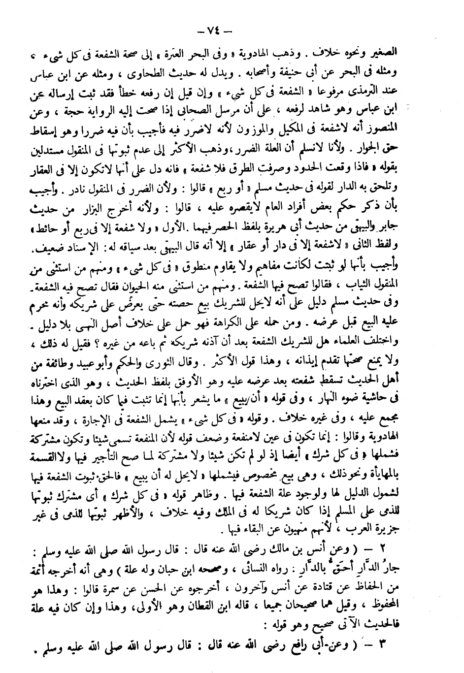 الصغير ونحوه خلاف وذهب الهادوية وفي البحر العترة إلى صحة الشفعة في كل شيء ومثله في البحر عن أبي حنيفة وأصحابه ويدل له حديث الطحاوي ومثله عند ابن عباس عند الترمذي مرفوعا "الشفعة في كل شيء" وإن قيل إن رفعه خطأ فقد ثبت إرساله عن ابن عباس وهو شاهد لرفعه على أن مرسل الصحابي إذا صحت إليه الرواية حجة وعن المنصور أنه لا شفعة في المكيل والموزون لأنه لا ضرر فيه فأجيب بأن فيه ضررا وهو إسقاط حق الجوار ولأنا لا نسلم أن العلة الضرر وذهب الأكثر على عدم ثبوتها في المنقول مستدلين بقوله "فإذا وقعت الحدود وصرفت الطرق فلا شفعة" فإنه دل على أنها لا تكون إلا في العقار وتلحق به الدار لقوله في حديث مسلم أو ربع قالوا ولأن الضرر في المنقول نادر وأجيب بأن ذكر حكم بعض أفراد العام لا يقصره عليه قالوا:ولأنه أخرج البزار من حديث جابر والبيهقي من حديث أبي هريرة بلفظ الحصر فيهما الأول "و لا شفعة إلا في ربع أو حائط" ولفظ الثاني "لا شفعة إلا في دار أو عقار" إلا أنه قال البيهقي بعد سياقه له الإسناد ضعيف وأجيب بأنها لو ثبتت لكانت مفاهيم ولا تقاوم منطوق في كل شيء ومنهم من استثنى من المنقول الثياب فقال تصح فيها الشفعة ومنهم من استثنى منه الحيوان فقال تصح فيه الشفعة وفي حديث مسلم دليل على أنه لا يحل للشريك بيع حصته حتى يعرض على شريكه وأنه محرم عليه البيع قبل عرضه ومن حمله على الكراهة فهو حمل على خلاف أصل النهي بلا دليل واختلف العلماء هل للشريك الشفعة بعد أن آذنه شريكه ثم باعه من غيره فقيل له ذلك ولا يمنع صحتها تقدم إيذانه وهذا قول الأكثر وقال الثوري والحكم وأبو عبيد وطائفة من أهل الحديث تسقط شفعته بعد عرضه عليه وهو الأوفق بلفظ الحديث وهو الذي اخترناه في حاشية ضوء النهار وفي قوله أن يبيع ما يشعر بأنها إنما تثبت فيما كان بعقد البيع وهذا مجمع عليه وفي غيره خلاف وقوله في كل شيء يشمل الشفعة في الإجارة وقد منعها الهادوية وقالوا إنما تكون في عين لا منفعة وضعف قولهم لأن المنفعة تسمى شيئا وتكون مشتركة فشملها في كل شرك أيضا إذ لو لم تكن شيئا ولا مشتركة لما صح التأجير فيها ولا القسمة بالمهايأة ونحو ذلك وهي بيع مخصوص فيشملها لا يحل له أن يبيع فالحق ثبوت الشفعة فيها لشمول الدليل لها ولوجود علة الشفعة فيها وظاهر قوله في كل شرك أي مشترك ثبوتها للذمي على المسلم إذا كان شريكا له في الملك وفيه خلاف والأظهر ثبوتها للذمي في غير جزيرة العرب لأنهم منهيون عن البقاء فيها