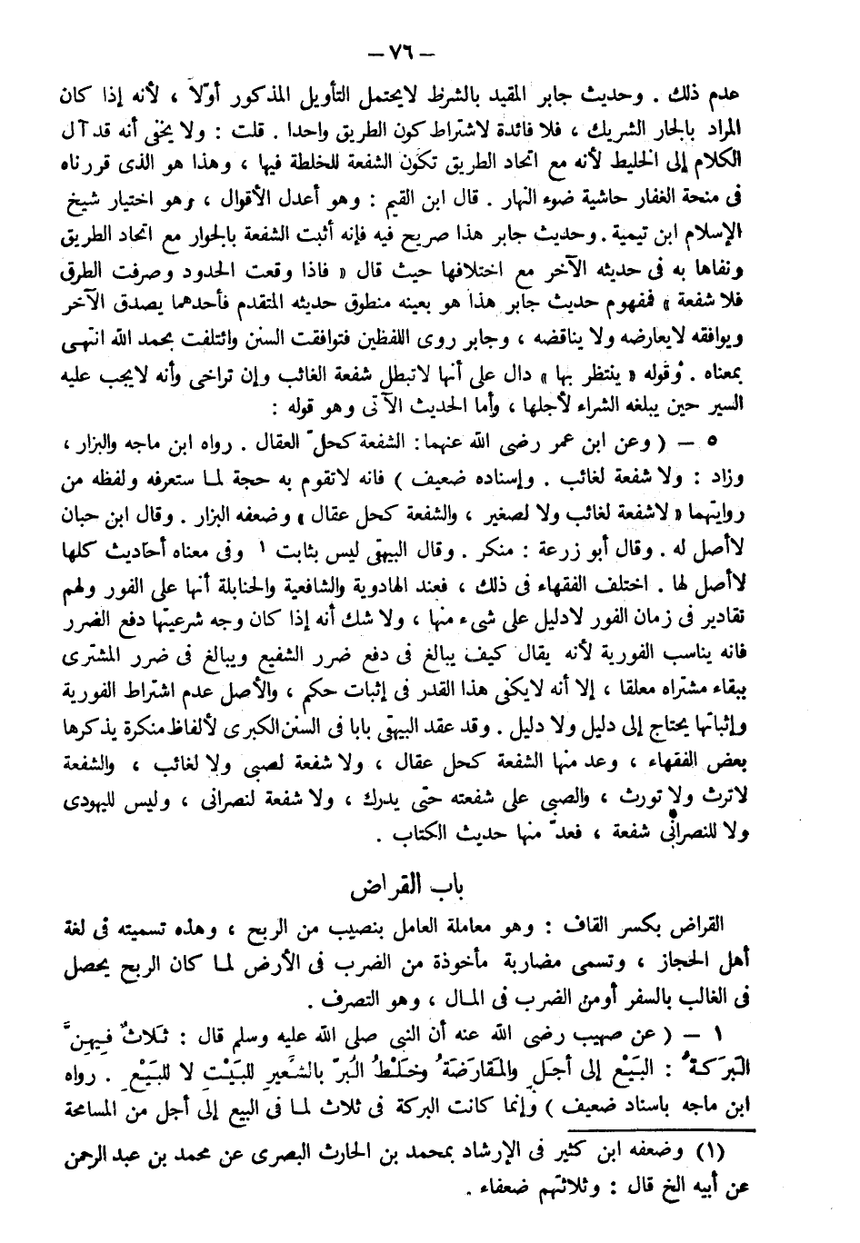 5- وعن ابن عمر رضي الله عنه الشفعة كحل عقال رواه ابن ماجه والبزار وزاد ولا شفعة لغائب وإسناده ضعيف فإنه لا تقوم به حجة لما ستعرفه ولفظه من روايتهما لا شفعة لغائب ولا لصغير والشفعة كحل عقال وضعفه البزار وقال ابن حبان لا أصل له وقال أبو زرعة منكر وقال البيهقي ليس بثابت وفي معناه أحاديث كلها لا أصل لها اختلف الفقهاء في ذلك فعند الهادوية والشافعية والحنابلة أنها على الفور ولهم تقادير في زمان الفور لا دليل على شيء منها ولا شك أنه إذا كان وجه شرعيتها دفع الضرر فإنه يناسب الفورية لأنه يقال كيف يبالغ في دفع ضرر الشفيع ويبالغ في ضرر المشتري ببقاء مشتراه معلقا إلا أنه لا يكفي هذا القدر في إثبات حكم والأصل عدم اشتراط الفورية وإثباتها يحتاج إلى دليل ولا دليل وقد عقد البيهقي بابا في السنن الكبرى لألفاظ منكرة يذكرها بعض الفقهاء وعد منها الشفعة كحل عقال ولا شفعة لصبي ولا لغائب والشفعة لا ترث ولا تورث والصبي على شفعته حتى يدرك ولا شفعة لنصراني وليس لليهودي ولا للنصراني شفعة فعد منها حديث الكتاب