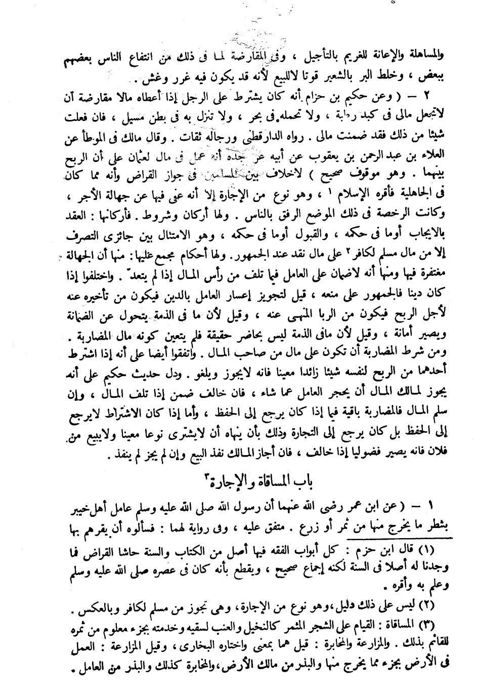 2- وعن حكيم بن حزام أنه كان يشترط على الرجل إذا أعطاه مالا مقارضة أن لا تجعل مالي في كبد رطبة ولا تحمله في بحر ولا تنزل به في بطن مسيل فإن فعلت شيئا من ذلك فقد ضمنت مالي رواه الدارقطني ورجاله ثقات وقال مالك في الموطأ عن العلاء بن عبد الرحمن بن يعقوب عن أبيه عن جده إنه عمل في مال لعثمان على أن الربح بينهما وهو موقوف صحيح لا خلاف بين المسلمين في جواز القراض وأنه مما كان في الجاهلية فأقره الإسلام وهو نوع من الإجارة إلا أنه عفى فيها عن جهالة الأجر وكانت الرخصة في ذلك الموضع الرفق بالناس ولها أركان وشروط فأركانها العقد بالإيجاب أو ما في حكمه والقبول أو ما في حكمه وهو الامتثال بين جائزي التصرف إلا من مال مسلم لكافر على مال نقد عند الجمهور ولها أحكام مجمع عليها منها أن الجهالة مغتفرة فيها ومنها أنه لا ضمان على العامل فيما تلف من رأس المال إذا لم يتعد واختلفوا إذا كان دينا فالجمهور على منعه قيل لتجويز إعسار العامل بالدين فيكون من تأخيره عنه لأجل الربح فيكون من الربا المنهي عنه وقيل لأن ما في الذمة يتحول عن الضمانة ويصير أمانة وقيل لأن ما في الذمة ليس بحاضر حقيقة فلم يتعين كونه مال المضاربة ومن شرط المضاربة أن تكون على مال من صاحب المال واتفقوا أيضا على أنه إذا اشترط أحدهما من الربح لنفسه شيئا زائدا معينا فإنه لا يجوز ويلغو ودل حديث حكيم على أنه يجوز لمالك المال أن يحجر العامل عما شاء فإن خالف ضمن إذا تلف المال وإن سلم المال فالمضاربة باقية فيما إذا كان يرجع إلى الحفظ وأما إذا كان الاشتراط لا يرجع إلى الحفظ بل كان يرجع إلى التجارة وذلك بأن ينهاه أن لا يشتري نوعا معينا ولا يبيع من فلان فإنه يصير فضوليا إذا خالف فإن أجاز المالك نفذ البيع وإن لم يجز لم ينفذ