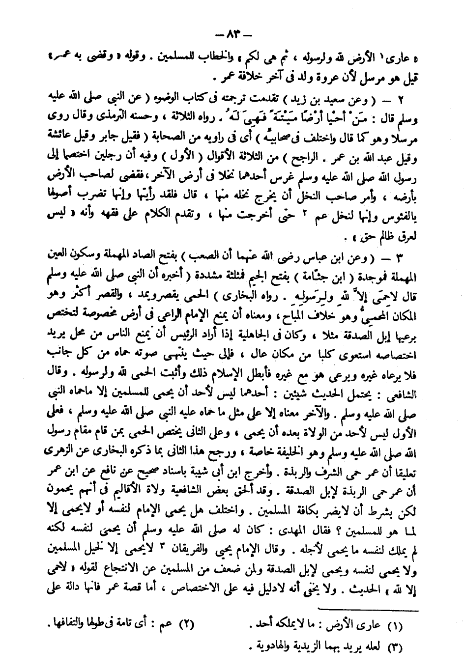 3- وعن ابن عباس رضي الله عنهما أن الصعب بفتح الصاد المهملة وسكون العين المهملة فموحدة ابن جثامة بفتح الجيم فمثلثة مشددة أخبره أن النبي صلى الله عليه وسلم قال: "لا حمى إلا لله ولرسوله" رواه البخاري الحمى يقصر ويمد والقصر أكثر وهو المكان المحمي وهو خلاف المباح ومعناه أن يمنع الإمام الرعي في أرض مخصوصة لتختص برعيها إبل الصدقة مثلا وكان في الجاهلية إذ أراد الرئيس أن يمنع الناس من محل يريد اختصاصه استعوى كلبا من مكان عال فإلى حيث ينتهي صوته حماه من كل جانب فلا يرعاه غيره ويرعى هو مع غيره فأبطل الإسلام ذلك وأثبت الحمى لله ولرسوله وقال الشافعي يحتمل الحديث شيئين أحدهما ليس لأحد أن يحمي للمسلمين إلا مما حماه النبي صلى الله عليه وسلم والآخر معناه إلا على مثل ما حماه عليه النبي صلى الله عليه وسلم فعلى الأول ليس لأحد من الولاة بعده أن يحمي وعلى الثاني يختص الحمى بمن قام مقام رسول الله صلى الله عليه وسلم وهو الخليفة خاصة ورجح هذا الثاني بما ذكره البخاري عن الزهري تعليقا أن عمر حمى الشرف والربذة وأخرج ابن أبي شيبة بإسناد صحيح عن نافع عن ابن عمر أن عمر حمى الربذة لإبل الصدقة وقد ألحق بعض الشافعية ولاة الأقاليم في أنهم يحمون لكن بشرط أن لا يضر بكافة المسلمين واختلف هل يحمي الإمام لنفسه أو لا يحمي إلا لما هو للمسلمين فقال المهدي كان له صلى الله عليه وسلم أن يحمي لنفسه لكنه لم يملك لنفسه ما يحمي لأجله وقال الإمام يحيى والفريقان لا يحمي إلا لخيل المسلمين ولا يحمي لنفسه ويحمي لإبل الصدقة ولمن ضعف من المسلمين عن الانتجاع لقوله لا حمى إلا لله الحديث ولا يخفى أنه لا دليل فيه على الاختصاص أما قصة عمر فإنها دالة على