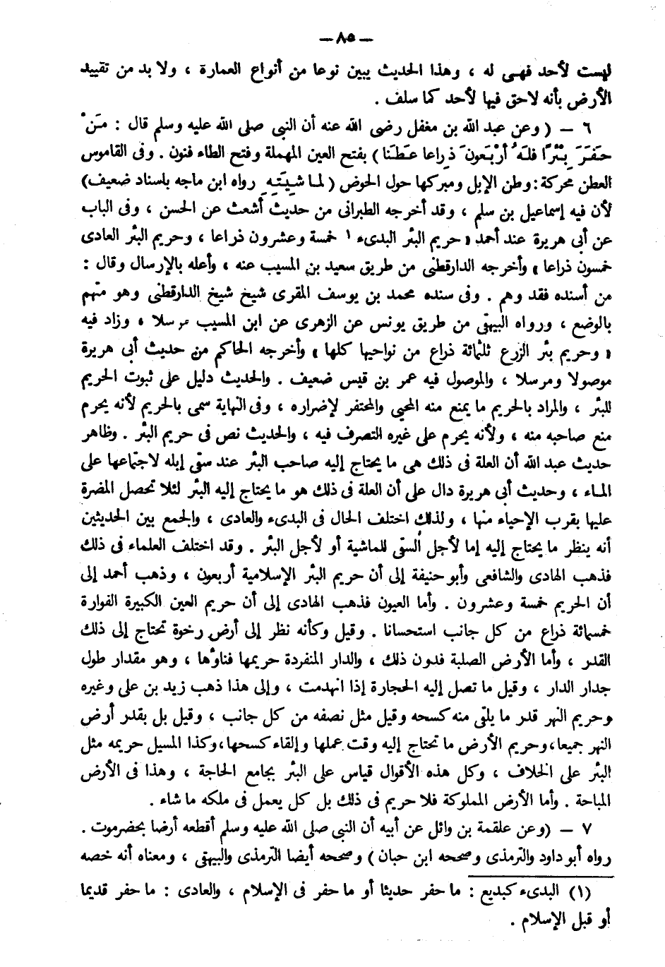 6- وعن عبد الله بن مغفل رضي الله عنه أن النبي صلى الله عليه وسلم قال: "من حفر بئرا فله أربعون ذراعا عطنا" بفتح العين المهملة وفتح الطاء فنون في القاموس العطن محركة وطن الإبل ومبركها حول الحوض "لماشيته" رواه ابن ماجه بإسناد ضعيف لأن فيه إسماعيل بن سلم وقد أخرجه الطبراني من حديث أشعث عن الحسن وفي الباب عن أبي هريرة عند أحمد حريم البئر البدىء خمسة وعشرون ذراعا وحريم البئر العادي خمسون ذراعا وأخرجه الدارقطني من طريق سعيد بن المسيب عنه وأعله بالإرسال وقال من أسنده فقد وهم وفي سنده محمد بن يوسف المقري شيخ شيخ الدارقطني وهو متهم بالوضع ورواه البيهقي من طريق يونس عن الزهري عن ابن المسيب مرسلا وزاد فيه وحريم بئر الزرع ثلا ثمائة ذراع من نواحيها كلها وأخرجه الحاكم من حديث أبي هريرة موصولا ومرسلا والموصول فيه عمر بن قيس ضعيف والحديث دليل على ثبوت الحريم للبئر والمراد بالحريم ما يمنع منه المحيي والمحتفر لإضراره وفي النهاية سمي بالحريم لأنه يحرم منع صاحبه منه ولأنه يحرم على غيره التصرف فيه والحديث نص في حريم البئر وظاهر حديث عبد الله أن العلة في ذلك هي ما يحتاج إليه صاحب البئر عند سقي إبله لاجتماعها على الماء وحديث أبي هريرة دال على أن العلة في ذلك هو ما يحتاج إليه البئر لئلا تحصل المضرة عليها بقرب الإحياء منها ولذلك اختلف الحال والعادي والجمع بين الحديثين أنه ينظر ما يحتاج إليه إما لأجل السقي للماشية أو لأجل البئر وقد اختلف العلماء في ذلك فذهب الهادي والشافعي وأبو حنيفة إلى أن حريم البئر الإسلامية أربعون وذهب أحمد إلى أن الحريم خمسة وعشرون وأما العيون فذهب الهادي إلى أن حريم العين الكبيرة الفوارة خمسمائة ذراع من كل جانب استحسانا وقيل وكأنه نظر إلى أرض رخوة تحتاج إلى ذلك القدر وأما الأرض الصلبة فدون ذلك والدار المنفردة حريمها فناؤها وهو مقدار طول جدار الدار وقيل ما تصل إليه الحجارة إذا انهدمت وإلى هذا ذهب زيد بن علي وغيره وحريم النهر قدر ما يلقى منه كسحه وقيل مثل نصفه من كل جانب وقيل بل بقدر أرض النهر جميعا وحريم الأرض ما تحتاج إليه وقت عملها وإلقاء كسحها وكذا المسيل حريمه مثل البئر على الخلاف وكل هذه الأقوال قياس على البئر بجامع الحاجة وهذا في الأرض المباحة وأما الأرض المملوكة فلا حريم في ذلك بل كل يعمل في ملكه ما