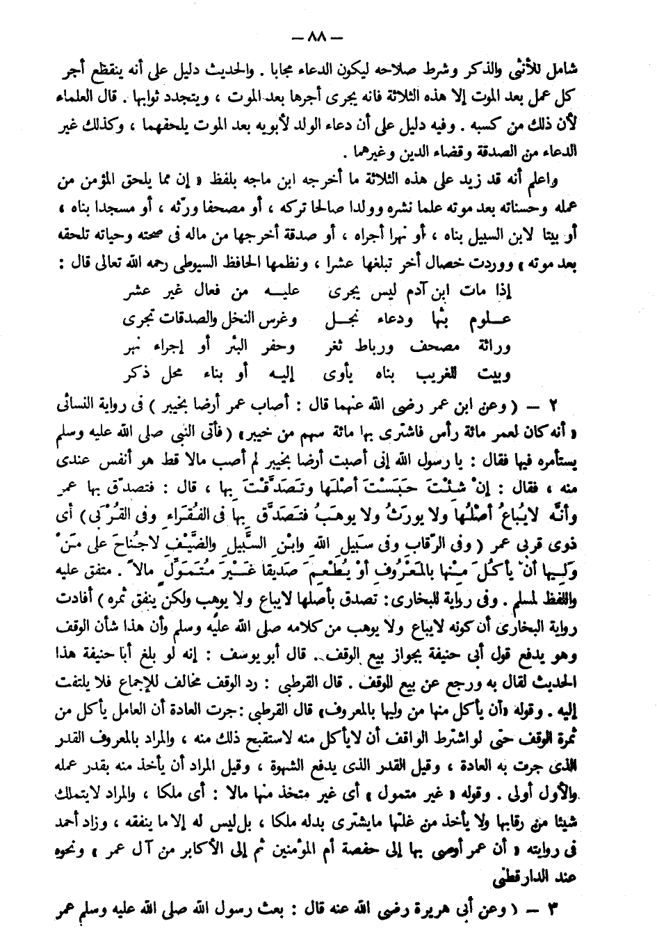 2- وعن ابن عمر رضي الله عنهما قال أصاب عمر أرضا بخيبر في رواية النسائي أنه كان لعمر مائة رأس فاشترى بها مائة سهم من خيبر فأتى النبي صلى الله عليه وسلم يستأمره فيها فقال يا رسول الله إني أصبت أرضا بخيبر لم أصب مالا قط هو أنفس عندي منه فقال صلى الله عليه وسلم "إن شئت حبست أصلها وتصدقت بها" قال فتصدق بها عمر وأنه لا يباع أصلها ولا يورث ولا يوهب فتصدق بها على الفقراء و في القربى" أي ذوي قربى عمر "وفي الرقاب وفي سبيل الله وابن السبيل والضيف لا جناح على من وليها أن يأكل بالمعروف أو يطعم صديقاً غير متمول مالا" متفق عليه واللفظ لمسلم وفي رواية للبخاري تصدق بأصلها لا يباع ولا يوهب ولكن ينفق ثمره أفادت رواية البخاري أن كونه لا يباع ولا يوهب من كلامه صلى الله عليه وسلم وأن هذا شأن الوقف وهو يدفع قول أبي حنيفة بجواز بيع الوقوف قال أبو يوسف إنه لو بلغ أبا حنيفة هذا الحديث لقال به ورجع عن بيع الوقف قال القرطبي رد الوقف مخالف للإجماع فلا يلتفت إليه وقوله "أن يأكل منها من وليها بالمعروف" قال القرطبي جرت العادة أن العامل يأكل من ثمرة الوقف حتى لو اشترط الواقف أن لا يأكل منه لاستقبح ذلك منه والمراد بالمعروف القدر الذي جرت به العادة وقيل القدر الذي يدفع الشهوة وقيل المراد أن يأخذ منه بقدر عمله والأول أولى وقوله غير متمول أي غير متخذ منها مالا أي ملكا والمراد لا يتملك شيئا من رقابها ولا يأخذ من غلتها ما يشتري بدله ملكا بل ليس له إلا ما ينفقه وزاد أحمد في روايته أن عمر أوصى بها إلى حفصة أم المؤمنين ثم إلى الأكابر من آل عمر ونحوه عند الدارقطني