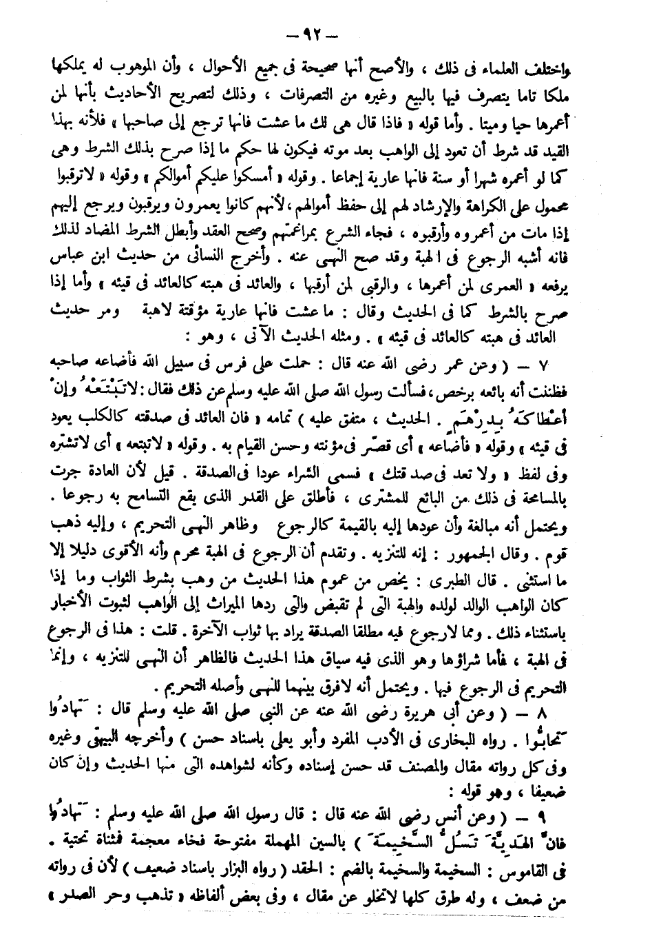 واختلف العلماء في ذلك والأصح أنها صحيحة في جميع الأحوال وأن الموهوب له يملكها ملكا تاما يتصرف فيها بالبيع وغيره من التصرفات وذلك لتصريح الأحاديث بأنها لمن أعمرها حيا وميتا وأما قوله فإذا قال هي لك ما عشت فإنها ترجع إلى صاحبها فلأنها بهذا القيد قد شرط أن تعود إلى الواهب بعد موته فيكون لها حكم ما إذا صرح بذلك الشرط وهي كما لو أعمره شهرا أو سنة فإنها عارية إجماعا وقوله "أمسكوا أموالكم" وقوله "لا ترقبوا" محمول على الكراهة والإرشاد لهم إلى حفظ أموالهم لأنهم كانوا يعمرون ويرقبون ويرجع إليهم إذا مات من أعمروه وأرقبوه فجاء الشرع بمراغمتهم وصحح العقد وأبطل الشرط المضاد لذلك فإنه أشبه الرجوع في الهبة وقد صح النهي عنه وأخرج النسائي من حديث ابن عباس يرفعه العمرى لمن أعمرها والرقبى لمن أرقبها والعائد في هبته كالعائد في قيئه وأما إذا صرح بالشرط كما في الحديث وقال ما عشت فإنها عارية مؤقتة لا هبة ومر حديث العائد في هبته كالعائد في قيئه ومثله الحديث الآتي وهو