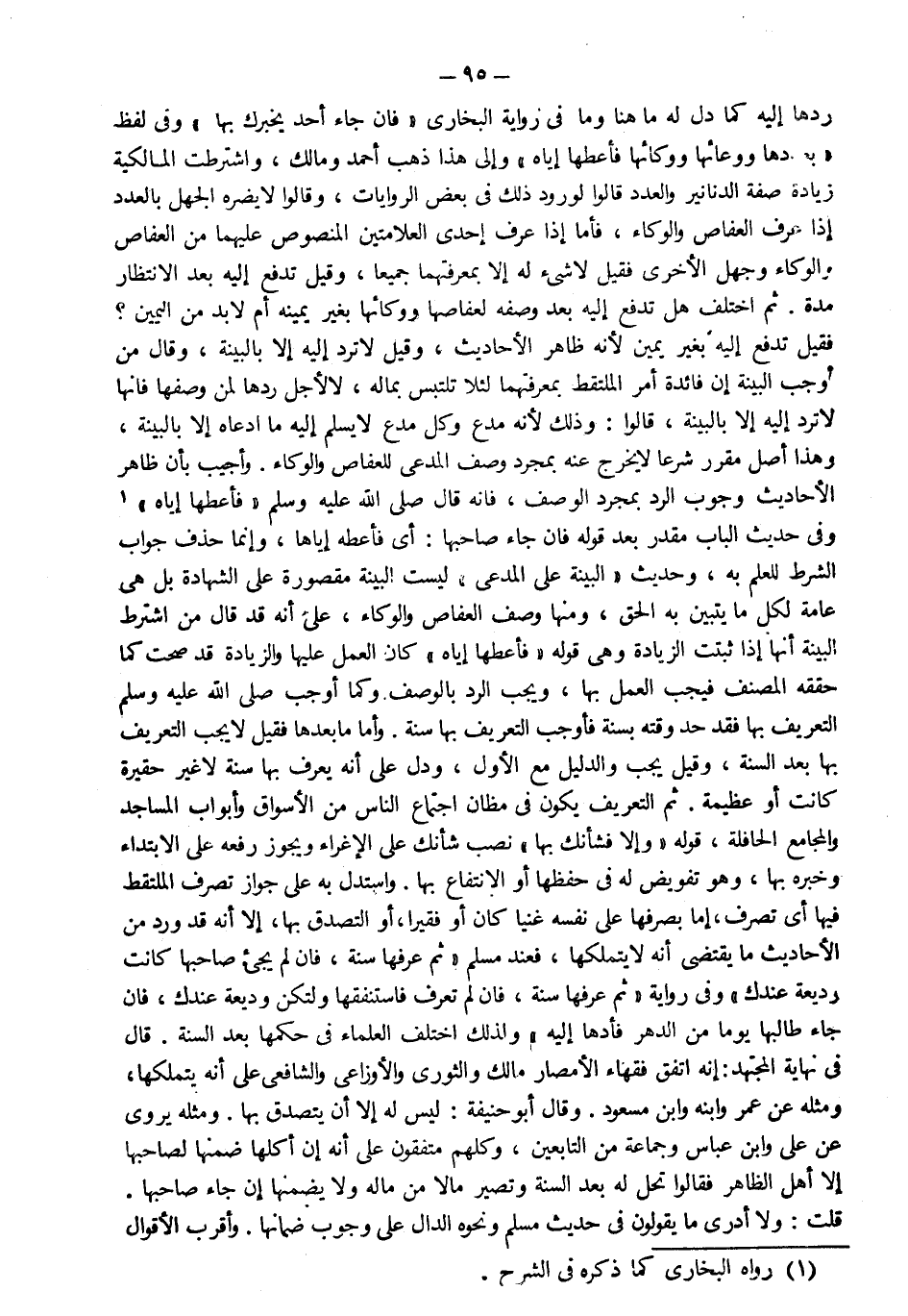 ردها إليه كما دل له ما هنا وما في رواية البخاري فإن جاء أحد يخبرك بها وفي لفظ بعددها ووعائها ووكائها فأعطها إياه وإلى هذا ذهب أحمد ومالك واشترطت المالكية زيادة صفة الدنانير والعدد قالوا لورود ذلك في بعض الروايات وقالوا الجهل بالعدد إذا عرف العفاص والوكاء فأما إذا عرف إحدى العلامتين المنصوص عليهما من العفاص والوكاء وجهل الأخرى فقيل لا شيء له إلا بمعرفتهما جميعا وقيل تدفع إليه بعد الإنظار مدة ثم اختلف هل تدفع إليه بعد وصفه لعفاصها ووكائها بغير يمينه أم لا بد من اليمين فقيل تدفع إليه بغير يمين لأنه ظاهر الأحاديث وقيل لا ترد إلا بالبينة وقال من أوجب البينة إن فائدة أمر الملتقط بمعرفتها لئلا يلتبس بماله لا لأجل ردها لمن وصفها فإنها لا ترد إليه إلا بالبينة قالوا وذلك لأنه مدع وكل مدع لا يسلم إليه ما ادعاه إلا بالبينة وهذا أصل مقرر شرعا لا يخرج عنه بمجرد وصف المدعى للعفاص والوكاء وأجيب بأن ظاهر الأحاديث وجوب الرد بمجرد الوصف فإنه قال صلى الله عليه وسلم "فأعطها إياه" وفي حديث الباب مقدر بعد قوله فإن جاء صاحبها أي فأعطه إياها وإنما حذف جواب الشرط للعلم به وحديث البينة على المدعي ليست البينة مقصورة على الشهادة بل هي عامة لكل ما يتبين به الحق ومنها وصف العفاص والوكاء على أنه قد قال من اشترط البينة إنها إذا ثبتت الزيادة وهي قوله فأعطها إياه كان العمل عليها والزيادة قد صحت كما حققه المصنف فيجب العمل بها ويجب الرد بالوصف وكما أوجب صلى الله عليه وسلم التعريف بها فقد حد وقته بسنة فأوجب التعريف بها سنة وأما ما بعدها فقيل لا يجب التعريف بها بعد السنة وقيل يجب والدليل مع الأول ودل على أنه يعرف بها سنة لاغير حقيرة كانت أو عظيمة عند التعريف يكون في مظان اجتماع الناس من الأسواق وأبواب المساجد والمجامع الحافلة وقوله وإلا فشأنك بها نصب شأنك على الإغراء ويجوز رفعه على الابتداء وخبره بها وهو تفويض له في حفظها أو الانتفاع بها واستدل به على جواز تصرف الملتقط فيها أي تصرف إما بصرفها على نفسه غنيا كان أو فقيرا أو التصدق بها إلا أنه قد أورد من الأحاديث ما يقتضي أنه لا يتملكها فعند مسلم "ثم عرفها سنة فإن لم يجيء صاحبها كانت وديعة عندك" وفي رواية "ثم عرفها سنة فإن لم تعرف فاستنفقها ولتكن وديعة عندك فإن جاء طالبها يوما من الدهر فأدها إليه" ولذلك اختلف العلماء في حكمها بعد السنة قال في نهاية المجتهد إنه اتفق فقهاء الأمصار مالك والثوري والأوزاعي والشافعي على أنه يتملكها ومثله عن عمر وابنه وابن مسعود وقال أبو حنيفة ليس له إلا أن يتصدق بها ومثله يروى عن علي و ابن عباس وجماعة من التابعين وكلهم متفقون على أنه إن أكلها ضمنها لصاحبها إلا أهل الظاهر فقالوا تحل له بعد السنة وتصير مالا من ماله ولا يضمنها إن جاء صاحبها قلت ولا أدري ما يقولون في حديث مسلم ونحوه الدال على وجوب ضمانها وأقرب الأقوال