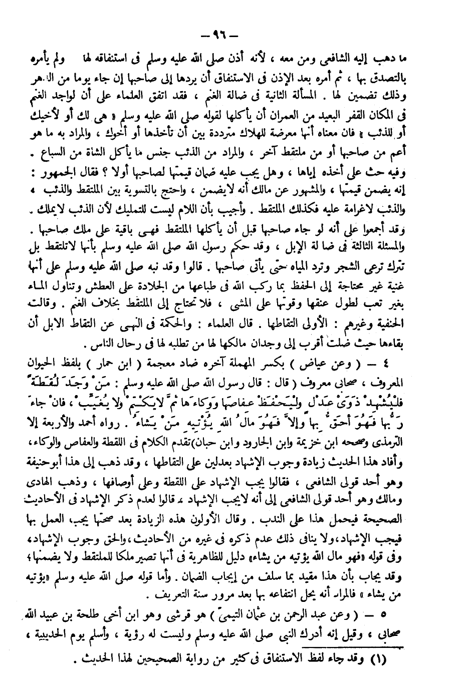 4- وعن عياض بكسر المهملة آخره ضاد معجمة ابن حمار بلفظ الحيوان المعروف صحابي معروف قال قال رسول الله صلى الله عليه وسلم: "من وجد لقطة فليشهد ذوي عدل وليحفظ عفاصها ووكاءها ثم لا يكتم ولا يغيب فإن جاء ربها فهو أحق بها وإلا فهو مال الله يؤتيه من يشاء" رواه أحمد والأربعة إلا الترمذي وصححه ابن خزيمة وابن الجارود وابن حبان تقدم الكلام في اللقطة والعفاص والوكاء وأفاد هذا الحديث زيادة وجوب الإشهاد بعدلين على التقاطها وقد ذهب إلى هذا أبو حنيفة وهو أحد قولي الشافعي فقالوا يجب الإشهاد على اللقطة وعلى أوصافها وذهب الهادي ومالك وهو أحد قولي الشافعي إلى أنه لا يجب الإشهاد قالوا لعدم ذكر الإشهاد في الأحاديث الصحيحة فيحمل هذا على الندب وقال الأولون هذه الزيادة بعد صحتها يجب العمل بها فيجب الإشهاد ولا ينافي ذلك عدم ذكره في غيره من الأحاديث والحق وجوب الإشهاد في قوله "فهو مال الله يؤتيه من يشاء" دليل للظاهرية في أنها تصير ملكا للملتقط ولا يضمنها وقد يجاب بأن هذا مقيد بما سلف من إيجاب الضمان وأما قوله صلى الله عليه وسلم "يؤتيه من يشاء" فالمراد أنه يحل انتفاعه بها بعد مرور سنة التعريف