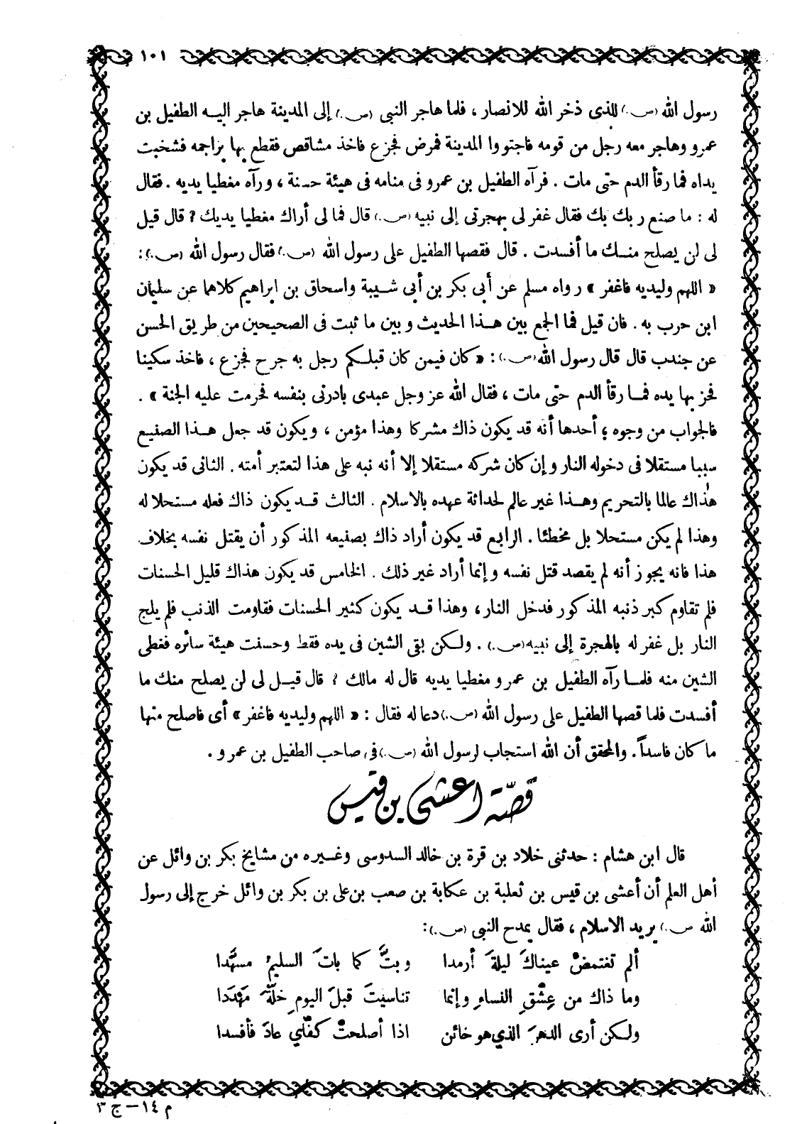 قَالَ ابْنُ هِشَامٍ: حَدَّثَنِي خَلَّادُ بْنُ قُرَّةَ بْنِ خَالِدٍ السَّدُوسِيُّ وَغَيْرُهُ مِنْ مَشَايِخِ بَكْرِ بْنِ وَائِلٍ عَنْ أَهْلِ الْعِلْمِ أَنَّ أَعْشَى بن قيس بْنِ ثَعْلَبَةَ بْنِ عُكَابَةَ بْنِ صَعْبِ بْنِ عَلِيِّ بْنِ بَكْرِ بْنِ وَائِلٍ خَرَجَ إِلَى رَسُولِ اللَّهِ صَلَّى اللَّهُ عَلَيْهِ وَسَلَّمَ يُرِيدُ الْإِسْلَامَ، فَقَالَ يَمْدَحُ النَّبِيَّ صَلَّى اللَّهُ عَلَيْهِ وَسَلَّمَ: