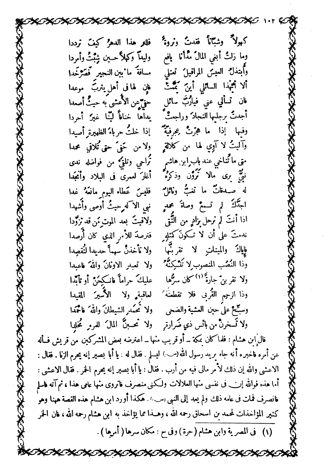 قَالَ ابْنُ هِشَامٍ: فَلَمَّا كَانَ بمكة- أو قريب مِنْهَا- اعْتَرَضَهُ بَعْضُ الْمُشْرِكِينَ مِنْ قُرَيْشٍ فَسَأَلَهُ عَنْ أَمْرِهِ فَأَخْبَرَهُ أَنَّهُ جَاءَ يُرِيدُ رَسُولُ اللَّهِ صَلَّى اللَّهُ عَلَيْهِ وَسَلَّمَ لِيُسْلِمَ. فَقَالَ لَهُ: يَا أَبَا بَصِيرٍ إِنَّهُ يُحَرِّمُ الزِّنَا. فَقَالَ: