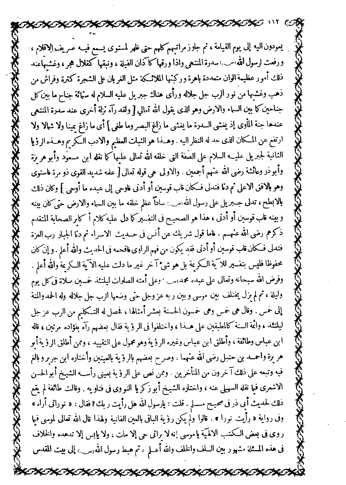 وَفَرَضَ اللَّهُ سُبْحَانَهُ وَتَعَالَى عَلَى عَبْدِهِ مُحَمَّدٍ صَلَّى اللَّهُ عَلَيْهِ وَسَلَّمَ وَعَلَى أُمَّتِهِ الصَّلَوَاتِ لَيْلَتَئِذٍ خَمْسِينَ صَلَاةً فِي كُلِّ يَوْمٍ وَلَيْلَةٍ، ثُمَّ لَمْ يَزَلْ يَخْتَلِفُ بَيْنَ مُوسَى وَبَيْنَ رَبِّهِ عَزَّ وَجَلَّ حَتَّى وَضَعَهَا الرَّبُّ جَلَّ جَلَالُهُ وَلَهُ الْحَمْدُ وَالْمِنَّةُ إِلَى خَمْسٍ. وَقَالَ هِيَ خَمْسٌ وَهِيَ خَمْسُونَ الْحَسَنَةُ بِعَشْرِ أَمْثَالِهَا، فحصل له التكليم من الرب عز جل لَيْلَتَئِذٍ، وَأَئِمَّةُ السُّنَّةِ كَالْمُطْبِقِينَ عَلَى هَذَا، وَاخْتَلَفُوا فِي الرُّؤْيَةِ فَقَالَ بَعْضُهُمْ رَآهُ بِفُؤَادِهِ مَرَّتَيْنِ، قَالَهُ ابْنُ عَبَّاسٍ وَطَائِفَةٌ، وَأَطْلَقَ ابْنُ عَبَّاسٍ وَغَيْرُهُ الرُّؤْيَةَ وَهُوَ مَحْمُولٌ عَلَى التَّقْيِيدِ، وَمِمَّنْ أَطْلَقَ الرُّؤْيَةَ أَبُو هُرَيْرَةَ وَأَحْمَدُ بْنُ حَنْبَلٍ رَضِيَ اللَّهُ عَنْهُمَا، وَصَرَّحَ بَعْضُهُمْ بِالرُّؤْيَةِ بِالْعَيْنَيْنِ وَاخْتَارَهُ ابْنُ جَرِيرٍ وَبَالَغَ فِيهِ وَتَبِعَهُ عَلَى ذَلِكَ آخَرُونَ مِنَ الْمُتَأَخِّرِينَ. وَمِمَّنْ نَصَّ عَلَى الرُّؤْيَةِ بِعَيْنَيْ رَأْسِهِ الشَّيْخُ أَبُو الْحَسَنِ الْأَشْعَرِيُّ فِيمَا نَقَلَهُ السُّهَيْلِيُّ عَنْهُ، وَاخْتَارَهُ الشَّيْخُ أَبُو زَكَرِيَّا النَّوَوِيُّ فِي فَتَاوِيهِ. وَقَالَتْ طَائِفَةٌ لَمْ يَقَعْ ذَلِكَ لِحَدِيثِ أَبِي ذَرٍّ فِي صَحِيحِ مُسْلِمٍ. قُلْتُ: يَا رَسُولَ اللَّهِ هَلْ رَأَيْتَ رَبَّكَ؟ فقال: «نوراني أَرَاهُ» وَفِي رِوَايَةٍ «رَأَيْتُ نُورًا» . قَالُوا وَلَمْ يكن رُؤْيَةُ الْبَاقِي بِالْعَيْنِ الْفَانِيَةِ وَلِهَذَا قَالَ اللَّهُ تَعَالَى لِمُوسَى فِيمَا رُوِيَ فِي بَعْضِ الْكُتُبِ الإلهية يا موسى إن لَا يَرَانِي حَيٌّ إِلَّا مَاتَ، وَلَا يَابِسٌ إِلَّا تَدَهْدَهَ وَالْخِلَافُ فِي هَذِهِ الْمَسْأَلَةِ مَشْهُورٌ بَيْنَ السَّلَفِ وَالْخَلَفِ وَاللَّهُ أَعْلَمُ. ثُمَّ هَبَطَ رَسُولُ اللَّهِ صَلَّى اللَّهُ عَلَيْهِ وَسَلَّمَ إِلَى بيت المقدس