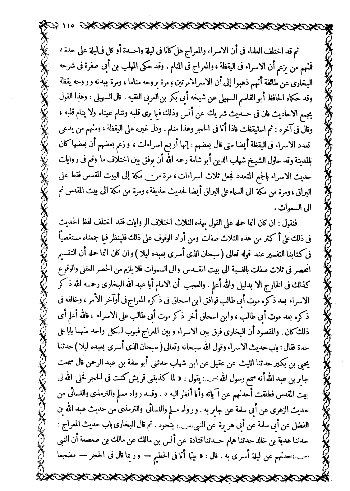 فَنَقُولُ: إِنْ كَانَ إِنَّمَا حَمَلَهُ عَلَى الْقَوْلِ بِهَذِهِ الثَّلَاثِ اخْتِلَافُ الرِّوَايَاتِ فَقَدِ اخْتَلَفَ لَفْظُ الْحَدِيثِ فِي ذَلِكَ عَلَى أَكْثَرَ مِنْ هَذِهِ الثَّلَاثِ صِفَاتٍ وَمَنْ أَرَادَ الْوُقُوفَ عَلَى ذَلِكَ فلينظر فيما جمعناه مستقصيا فِي كِتَابِنَا التَّفْسِيرِ عِنْدَ قَوْلِهِ تَعَالَى سُبْحانَ الَّذِي أَسْرى بِعَبْدِهِ لَيْلًا 17: 1 وَإِنْ كَانَ إِنَّمَا حَمَلَهُ أَنَّ التَّقْسِيمَ انْحَصَرَ فِي ثَلَاثِ صِفَاتٍ بِالنِّسْبَةِ إِلَى بَيْتِ الْمَقْدِسِ والى السموات فلا يلزم من الحصر العقلي والوقوع كَذَلِكَ فِي الْخَارِجِ إِلَّا بِدَلِيلٍ وَاللَّهُ أَعْلَمُ. وَالْعَجَبُ أَنَّ الْإِمَامَ أَبَا عَبْدِ اللَّهِ الْبُخَارِيَّ رَحِمَهُ اللَّهُ ذَكَرَ الْإِسْرَاءَ بَعْدَ ذِكْرِهِ مَوْتَ أَبِي طَالِبٍ فَوَافَقَ ابْنَ إِسْحَاقَ فِي ذِكْرِهِ الْمِعْرَاجَ فِي أَوَاخِرِ الْأَمْرِ، وَخَالَفَهُ فِي ذِكْرِهِ بَعْدَ مَوْتِ أَبِي طَالِبٍ، وَابْنُ إِسْحَاقَ أَخَّرَ ذِكْرَ مَوْتِ أَبِي طَالِبٍ عَلَى الْإِسْرَاءِ، فاللَّه أَعْلَمُ أَيُّ ذَلِكَ كَانَ. وَالْمَقْصُودُ أَنَّ الْبُخَارِيَّ فَرَّقَ بَيْنَ الْإِسْرَاءِ وَبَيْنَ الْمِعْرَاجِ فَبَوَّبَ لِكُلٍّ واحد مِنْهُمَا بَابًا عَلَى حِدَةٍ فَقَالَ: بَابُ حَدِيثِ الْإِسْرَاءِ وَقَوْلِ اللَّهِ سُبْحَانَهُ وَتَعَالَى سُبْحانَ الَّذِي أَسْرى بِعَبْدِهِ لَيْلًا 17: 1 حَدَّثَنَا يَحْيَى بْنُ بُكَيْرٍ حَدَّثَنَا اللَّيْثُ عَنْ عُقَيْلٍ عَنِ ابْنِ شِهَابٍ حَدَّثَنِي أَبُو سَلَمَةَ بْنُ عَبْدِ الرَّحْمَنِ قَالَ سَمِعْتُ جَابِرَ بْنَ عَبْدِ اللَّهِ أَنَّهُ سَمِعَ رَسُولَ اللَّهِ صَلَّى اللَّهُ عَلَيْهِ وَسَلَّمَ يَقُولُ: «لَمَّا كَذَّبَتْنِي قُرَيْشٌ كُنْتُ فِي الْحِجْرِ فَجَلَّى اللَّهُ لِي بَيْتَ المقدس فطفقت أحدثهم عَنْ آيَاتِهِ وَأَنَا أَنْظُرُ إِلَيْهِ» . وَقَدْ رَوَاهُ مُسْلِمٌ وَالتِّرْمِذِيُّ وَالنَّسَائِيُّ مِنْ حَدِيثِ الزُّهْرِيِّ عَنْ أَبِي سَلَمَةَ عَنْ جَابِرٍ بِهِ. وَرَوَاهُ مُسْلِمٌ وَالنَّسَائِيُّ وَالتِّرْمِذِيُّ مِنْ حَدِيثِ عَبْدِ اللَّهِ بْنِ الْفَضْلِ عَنْ أَبِي سَلَمَةَ عَنْ أَبِي هُرَيْرَةَ عَنِ النَّبِيِّ صَلَّى اللَّهُ عَلَيْهِ وَسَلَّمَ بِنَحْوِهِ. ثُمَّ قَالَ الْبُخَارِيُّ بَابُ حَدِيثِ الْمِعْرَاجِ: