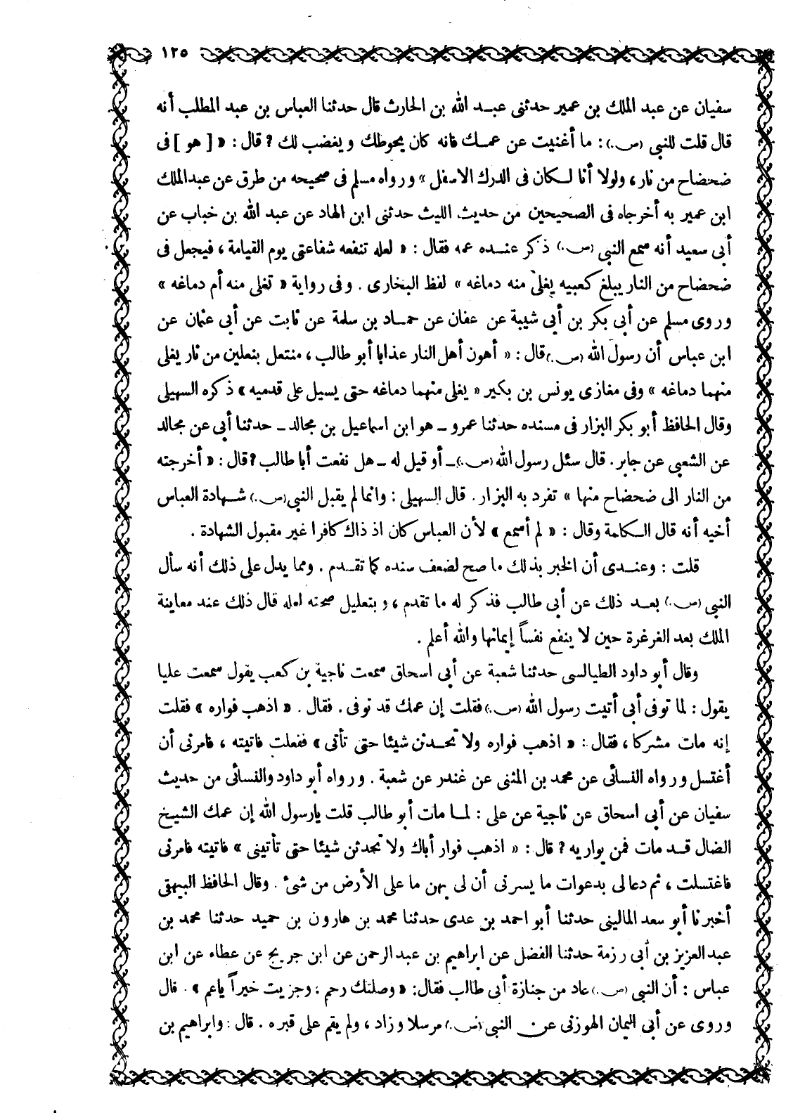 سُفْيَانَ عَنْ عَبْدِ الْمَلِكِ بْنِ عُمَيْرٍ حَدَّثَنِي عبد الله بن الحارث قال حَدَّثَنَا الْعَبَّاسُ بْنُ عَبْدِ الْمُطَّلِبِ أَنَّهُ قَالَ قَلْتُ لِلنَّبِيِّ صَلَّى اللَّهُ عَلَيْهِ وَسَلَّمَ: مَا أَغْنَيْتَ عَنْ عَمِّكَ فَإِنَّهُ كَانَ يَحُوطُكَ وَيَغْضَبُ لَكَ؟ قَالَ: « [هُوَ] فِي ضَحْضَاحٍ مِنْ نَارٍ، ولولا أنا لكان في الدرك الأسفل» وَرَوَاهُ مُسْلِمٌ فِي صَحِيحِهِ مِنْ طُرُقٍ عَنْ عبد الملك ابن عمير به أخرجاه فِي الصَّحِيحَيْنِ مِنْ حَدِيثِ اللَّيْثِ حَدَّثَنِي ابْنُ الْهَادِ عَنْ عَبْدِ اللَّهِ بْنِ خَبَّابٍ عَنْ أَبِي سَعِيدٍ أَنَّهُ سَمِعَ النَّبِيَّ صَلَّى اللَّهُ عَلَيْهِ وَسَلَّمَ ذكر عِنْدَهُ عَمُّهُ فَقَالَ: «لَعَلَّهُ تَنْفَعُهُ شَفَاعَتِي يَوْمَ الْقِيَامَةِ، فَيُجْعَلُ فِي ضَحْضَاحٍ مِنَ النَّارِ يَبْلُغُ كَعْبَيْهِ يَغْلِي مِنْهُ دِمَاغُهُ» لَفْظُ الْبُخَارِيِّ. وَفِي رِوَايَةٍ «تَغْلِي مِنْهُ أُمُّ دِمَاغِهِ» وَرَوَى مُسْلِمٌ عَنْ أَبِي بَكْرِ بْنِ أَبِي شَيْبَةَ عَنْ عَفَّانَ عَنْ حَمَّادُ بْنُ سَلَمَةَ عَنْ ثَابِتٍ عَنْ أَبِي عُثْمَانَ عَنِ ابْنِ عَبَّاسٍ أَنَّ رَسُولَ اللَّهِ صَلَّى اللَّهُ عَلَيْهِ وَسَلَّمَ قَالَ: «أَهْوَنُ أَهْلِ النَّارِ عَذَابًا أَبُو طَالِبٍ، مُنْتَعِلٌ بِنَعْلَيْنِ مِنْ نَارٍ يَغْلِي مِنْهُمَا دِمَاغُهُ» وَفِي مَغَازِي يُونُسَ بْنِ بُكَيْرٍ «يَغْلِي مِنْهُمَا دِمَاغُهُ حَتَّى يَسِيلَ عَلَى قَدَمَيْهِ» ذَكَرَهُ السُّهَيْلِيُّ وَقَالَ الْحَافِظُ أَبُو بَكْرٍ الْبَزَّارُ فِي مُسْنَدِهِ حَدَّثَنَا عمرو- هُوَ ابْنُ إِسْمَاعِيلَ بْنِ مُجَالِدٍ- حَدَّثَنَا أَبِي عَنْ مُجَالِدٍ عَنِ الشَّعْبِيِّ عَنْ جَابِرٍ. قَالَ سُئِلَ رَسُولُ اللَّهِ صَلَّى اللَّهُ عَلَيْهِ وَسَلَّمَ- أَوْ قِيلَ لَهُ- هَلْ نَفَعْتَ أَبَا طَالِبٍ؟ قَالَ: «أَخْرَجْتُهُ مِنَ النَّارِ إِلَى ضَحْضَاحٍ مِنْهَا» تَفَرَّدَ بِهِ الْبَزَّارُ. قَالَ السُّهَيْلِيُّ: وَإِنَّمَا لَمْ يَقْبَلِ النَّبِيُّ صَلَّى اللَّهُ عَلَيْهِ وَسَلَّمَ شَهَادَةَ العباس أخيه أَنَّهُ قَالَ الْكَلِمَةَ وَقَالَ: «لَمْ أَسْمَعْ» لِأَنَّ الْعَبَّاسَ كَانَ إِذْ ذَاكَ كَافِرًا غَيْرَ مَقْبُولِ الشَّهَادَةِ.