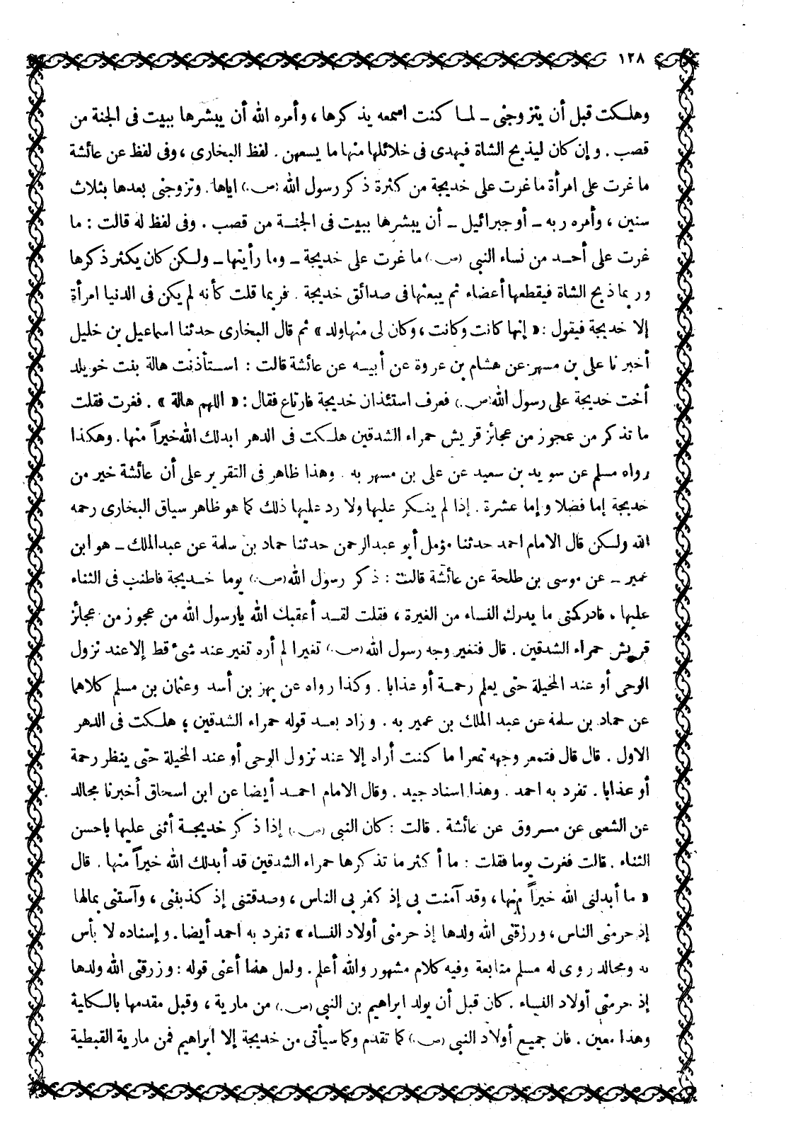 وَهَلَكَتْ قَبْلَ أَنْ يَتَزَوَّجَنِي- لِمَا كُنْتُ أَسْمَعُهُ يَذْكُرُهَا، وَأَمَرَهُ اللَّهُ أَنْ يُبَشِّرَهَا بِبَيْتٍ في الجنة مِنْ قَصَبٍ. وَإِنْ كَانَ لَيَذْبَحُ الشَّاةَ فَيُهْدِي فِي خَلَائِلِهَا مِنْهَا مَا يَسَعُهُنَّ. لَفْظُ الْبُخَارِيِّ، وفي لفظ عَنْ عَائِشَةَ مَا غِرْتُ عَلَى امْرَأَةٍ مَا غِرْتُ عَلَى خَدِيجَةَ مِنْ كَثْرَةِ ذَكَرَ رَسُولُ اللَّهِ صَلَّى اللَّهُ عَلَيْهِ وَسَلَّمَ إياها. وتزوجني بعدها بثلاث سنين، وأمره ربه- أو جبرائيل- أَنْ يُبَشِّرَهَا بِبَيْتٍ فِي الْجَنَّةِ مِنْ قَصَبٍ. وَفِي لَفْظٍ لَهُ قَالَتْ: مَا غِرْتُ عَلَى أَحَدٍ مِنْ نِسَاءِ النَّبِيِّ صَلَّى اللَّهُ عَلَيْهِ وَسَلَّمَ مَا غِرْتُ عَلَى خَدِيجَةَ- وَمَا رَأَيْتُهَا- وَلَكِنْ كَانَ يُكْثِرُ ذِكْرَهَا وَرُبَّمَا ذَبَحَ الشَّاةَ فيقطعها أَعْضَاءً ثُمَّ يَبْعَثُهَا فِي صَدَائِقِ خَدِيجَةَ. فَرُبَّمَا قلت كَأَنَّهُ لَمْ يَكُنْ فِي الدُّنْيَا امْرَأَةٌ إِلَّا خَدِيجَةَ فَيَقُولُ: «إِنَّهَا كَانَتْ وَكَانَتْ، وَكَانَ لِي مِنْهَا وَلَدٌ» ثُمَّ قَالَ الْبُخَارِيُّ حَدَّثَنَا إِسْمَاعِيلُ بْنُ خَلِيلٍ أَخْبَرَنَا عَلِيُّ بْنُ مُسْهِرٍ عَنْ هِشَامِ بْنِ عُرْوَةَ عَنْ أَبِيهِ عَنْ عَائِشَةَ قَالَتْ: اسْتَأْذَنَتْ هَالَةُ بِنْتِ خُوَيْلِدٍ أُخْتُ خَدِيجَةَ عَلَى رَسُولِ اللَّهِ صَلَّى اللَّهُ عَلَيْهِ وَسَلَّمَ فَعَرَفَ اسْتِئْذَانَ خَدِيجَةَ فَارْتَاعَ فَقَالَ: «اللَّهمّ هَالَةُ» . فَغِرْتُ فَقُلْتُ مَا تَذْكُرُ مِنْ عَجُوزٍ مِنْ عَجَائِزِ قُرَيْشٍ حَمْرَاءِ الشِّدْقَيْنِ هَلَكَتْ فِي الدَّهْرِ أَبْدَلَكَ اللَّهُ خَيْرًا مِنْهَا. وَهَكَذَا رَوَاهُ مُسْلِمٌ عَنْ سُوَيْدِ بْنِ سَعِيدٍ عَنْ عَلِيِّ بن مُسْهِرٍ بِهِ. وَهَذَا ظَاهِرٌ فِي التَّقْرِيرِ عَلَى أَنَّ عَائِشَةَ خَيْرٌ مِنْ خَدِيجَةَ إِمَّا فَضْلًا وإما عشرة. إذا لَمْ يُنْكِرْ عَلَيْهَا وَلَا رَدَّ عَلَيْهَا ذَلِكَ كَمَا هُوَ ظَاهِرُ سِيَاقِ الْبُخَارِيِّ رَحِمَهُ اللَّهُ وَلَكِنْ قَالَ الْإِمَامُ أَحْمَدُ حَدَّثَنَا مُؤَمَّلٌ أَبُو عبد الرحمن حدثنا حماد بن سَلَمَةَ عَنْ عَبْدِ الْمَلِكِ- هُوَ ابْنُ عُمَيْرٍ- عَنْ مُوسَى بْنِ طَلْحَةَ عَنْ عَائِشَةَ قَالَتْ: ذَكَرَ رَسُولُ اللَّهِ صَلَّى اللَّهُ عَلَيْهِ وَسَلَّمَ يَوْمًا خَدِيجَةَ فَأَطْنَبَ فِي الثَّنَاءِ عَلَيْهَا، فَأَدْرَكَنِي مَا يُدْرِكُ النِّسَاءَ مِنَ الْغَيْرَةِ، فَقُلْتُ لَقَدْ أَعْقَبَكَ اللَّهُ يَا رَسُولَ اللَّهِ مِنْ عَجُوزٍ مِنْ عَجَائِزِ قُرَيْشٍ حَمْرَاءِ الشِّدْقَيْنِ. قال فَتَغَيَّرَ وَجْهُ رَسُولِ اللَّهِ صَلَّى اللَّهُ عَلَيْهِ وَسَلَّمَ تَغَيُّرًا لَمْ أَرَهُ تَغَيَّرَ عِنْدَ شَيْءٍ قَطُّ إِلَّا عِنْدَ نُزُولِ الْوَحْيِ أَوْ عِنْدَ المخيلة حتى يعلم رحمة أو عذابا. وَكَذَا رَوَاهُ عَنْ بَهْزِ بْنِ أَسَدٍ وَعُثْمَانَ بْنِ مُسْلِمٍ كِلَاهُمَا عَنْ حَمَّادِ بْنِ سَلَمَةَ عَنْ عَبْدِ الْمَلِكِ بْنِ عُمَيْرٍ بِهِ. وَزَادَ بَعْدَ قَوْلِهِ حَمْرَاءُ الشِّدْقَيْنِ، هَلَكَتْ فِي الدَّهْرِ الأول. قال قال فَتَمَعَّرَ وَجْهُهُ تَمَعُّرًا مَا كُنْتُ أَرَاهُ إِلَّا عِنْدَ نُزُولِ الْوَحْيِ أَوْ عِنْدَ الْمَخِيلَةِ حَتَّى ينظر رحمة أَوْ عَذَابًا. تَفَرَّدَ بِهِ أَحْمَدُ. وَهَذَا إِسْنَادٌ جيد. وقال الامام احمد أيضا عن ابن إسحاق أَخْبَرَنَا مُجَالِدٌ عَنِ الشَّعْبِيِّ عَنْ مَسْرُوقٍ عَنْ عَائِشَةَ. قَالَتْ: كَانَ النَّبِيُّ صَلَّى اللَّهُ عَلَيْهِ وَسَلَّمَ إِذَا ذَكَرَ خَدِيجَةَ أَثْنَى عَلَيْهَا بِأَحْسَنِ الثَّنَاءِ. قَالَتْ فَغِرْتُ يَوْمًا فَقُلْتُ: مَا أَكْثَرَ ما تذكرها حمراء الشدقين قَدْ أَبْدَلَكَ اللَّهُ خَيْرًا مِنْهَا. قَالَ «مَا أبدلني الله خيرا منها، وقد آمَنَت