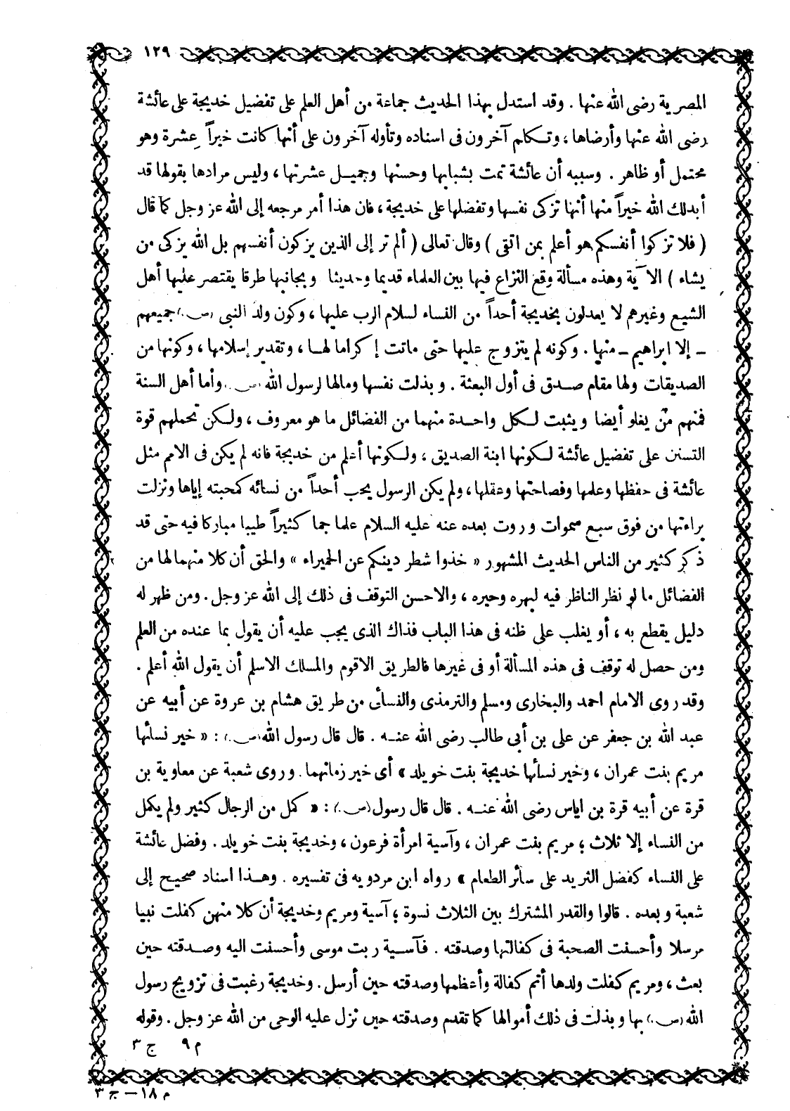 الْمِصْرِيَّةِ رَضِيَ اللَّهُ عَنْهَا. وَقَدِ اسْتَدَلَّ بِهَذَا الْحَدِيثِ جَمَاعَةٌ مِنْ أَهْلِ الْعِلْمِ عَلَى تَفْضِيلِ خديجة على عائشة رضى الله عنها وأرضاها، وَتَكَلَّمَ آخَرُونَ فِي إِسْنَادِهِ وَتَأَوَّلَهُ آخَرُونَ عَلَى أَنَّهَا كَانَتْ خَيْرًا عِشْرَةً وَهُوَ مُحْتَمَلٌ أَوْ ظاهر. وسببه أن عائشة تمت بِشَبَابِهَا وَحُسْنِهَا وَجَمِيلِ عِشْرَتِهَا، وَلَيْسَ مُرَادُهَا بِقَوْلِهَا قَدْ أَبْدَلَكَ اللَّهُ خَيْرًا مِنْهَا أَنَّهَا تُزَكِّي نَفْسَهَا وَتُفَضِّلُهَا عَلَى خَدِيجَةَ، فَإِنَّ هَذَا أَمْرٌ مَرْجِعُهُ إِلَى اللَّهِ عَزَّ وَجَلَّ كَمَا قَالَ (فَلا تُزَكُّوا أَنْفُسَكُمْ هُوَ أَعْلَمُ بِمَنِ اتَّقى) 53: 32 وَقَالَ تَعَالَى أَلَمْ تَرَ إِلَى الَّذِينَ يُزَكُّونَ أَنْفُسَهُمْ بَلِ الله يُزَكِّي من يَشاءُ 4: 49 الْآيَةَ وَهَذِهِ مَسْأَلَةٌ وَقَعَ النِّزَاعُ فِيهَا بَيْنَ العلماء قديما وحديثا وبجانبها طرقا يقتصر عليها أهل الشيع وَغَيْرُهُمْ لَا يَعْدِلُونَ بِخَدِيجَةَ أَحَدًا مِنَ النِّسَاءِ لِسَلَامِ الرَّبِّ عَلَيْهَا، وَكَوْنِ وَلَدِ النَّبِيِّ صَلَّى اللَّهُ عَلَيْهِ وَسَلَّمَ جَمِيعِهِمْ- إِلَّا إِبْرَاهِيمَ- مِنْهَا. وَكَوْنِهِ لَمْ يَتَزَوَّجْ عَلَيْهَا حَتَّى مَاتَتْ إِكْرَامًا لها، وتقدير إِسْلَامِهَا، وَكَوْنِهَا مِنَ الصِّدِّيقَاتِ وَلَهَا مَقَامُ صِدْقٍ فِي أَوَّلِ الْبِعْثَةِ. وَبَذَلَتْ نَفْسَهَا وَمَالَهَا لِرَسُولِ اللَّهِ صَلَّى اللَّهُ عَلَيْهِ وَسَلَّمَ وَأَمَّا أَهْلُ السنة فمنهم من يغلوا أَيْضًا وَيُثْبِتُ لِكُلِّ وَاحِدَةٍ مِنْهُمَا مِنَ الْفَضَائِلِ مَا هُوَ مَعْرُوفٌ، وَلَكِنْ تَحْمِلُهُمْ قُوَّةُ التَّسَنُّنِ عَلَى تَفْضِيلِ عَائِشَةَ لِكَوْنِهَا ابْنَةَ الصِّدِّيقِ، وَلِكَوْنِهَا أَعْلَمَ مِنْ خَدِيجَةَ فَإِنَّهُ لَمْ يَكُنْ فِي الْأُمَمِ مِثْلُ عَائِشَةَ فِي حِفْظِهَا وَعِلْمِهَا وَفَصَاحَتِهَا وعقلها، ولم يكن الرسول يُحِبُّ أَحَدًا مِنْ نِسَائِهِ كَمَحَبَّتِهِ إِيَّاهَا وَنَزَلَتْ بَرَاءَتُهَا مِنْ فَوْقِ سَبْعِ سَمَاوَاتٍ وَرَوَتْ بَعْدَهُ عَنْهُ عَلَيْهِ السَّلَامُ عِلْمًا جَمًّا كَثِيرًا طَيِّبًا مُبَارَكًا فِيهِ حَتَّى قَدْ ذَكَرَ كَثِيرٌ مِنَ النَّاسِ الْحَدِيثَ الْمَشْهُورَ «خُذُوا شَطْرَ دِينِكُمْ عَنِ الْحُمَيْرَاءِ» وَالْحُقُّ أَنَّ كُلًّا مِنْهُمَا لَهَا مِنَ الْفَضَائِلِ مَا لَوْ نَظَرَ النَّاظِرُ فِيهِ لَبَهَرَهُ وحيره، والأحسن التوقف في ذَلِكَ إِلَى اللَّهِ عَزَّ وَجَلَّ. وَمَنْ ظَهَرَ لَهُ دَلِيلٌ يَقْطَعُ بِهِ، أَوْ يَغْلِبُ عَلَى ظَنِّهِ فِي هَذَا الْبَابِ فَذَاكَ الَّذِي يَجِبُ عَلَيْهِ أَنْ يَقُولَ بِمَا عِنْدَهُ مِنَ الْعِلْمِ وَمَنْ حَصَلَ لَهُ تَوَقُّفٌ فِي هَذِهِ الْمَسْأَلَةِ أَوْ فِي غَيْرِهَا فَالطَّرِيقُ الْأَقْوَمُ وَالْمَسْلَكُ الْأَسْلَمُ أَنْ يَقُولَ اللَّهُ أَعْلَمُ.