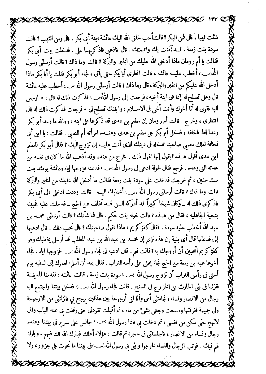 شئت ثيبا، قال فمن البكر؟ قالت أَحَبِّ خَلْقِ اللَّهِ إِلَيْكَ عَائِشَةُ ابْنَةُ أَبِي بَكْرٍ. قَالَ وَمَنِ الثَّيِّبُ؟ قَالَتْ سَوْدَةُ بِنْتُ زمعة. قد آمنت بك واتبعتك. قَالَ فَاذْهَبِي فَاذْكُرِيهِمَا عَلَيَّ. فَدَخَلَتْ بَيْتَ أَبِي بَكْرٍ فَقَالَتْ يَا أُمَّ رُومَانَ مَاذَا أَدْخَلَ اللَّهُ عَلَيْكِ مِنَ الْخَيْرِ وَالْبَرَكَةِ؟ قَالَتْ وَمَا ذَاكَ؟ قَالَتْ أَرْسَلَنِي رَسُولُ اللَّهِ صَلَّى اللَّهُ عَلَيْهِ وَسَلَّمَ أخطب عليه عائشة، قالت انظري أَبَا بَكْرٍ حَتَّى يَأْتِيَ، فَجَاءَ أَبُو بَكْرٍ فقلت يَا أَبَا بَكْرٍ مَاذَا أَدْخَلَ اللَّهُ عَلَيْكُمْ مِنَ الْخَيْرِ وَالْبَرَكَةِ، قَالَ وَمَا ذَاكَ؟ قَالَتْ أَرْسَلَنِي رَسُولُ اللَّهِ صَلَّى اللَّهُ عَلَيْهِ وَسَلَّمَ أَخْطُبُ عَلَيْهِ عَائِشَةَ قَالَ وَهَلْ تَصْلُحُ لَهُ إِنَّمَا هِيَ ابْنَةُ أَخِيهِ، فَرَجَعْتُ إِلَى رَسُولِ اللَّهِ صَلَّى اللَّهُ عَلَيْهِ وَسَلَّمَ فَذَكَرْتُ ذَلِكَ لَهُ قَالَ: «ارْجِعِي إِلَيْهِ فَقُولِي لَهُ أَنَا أَخُوكَ وَأَنْتَ أَخِي فِي الْإِسْلَامِ، وَابْنَتُكَ تَصْلُحُ لِي» فَرَجَعَتْ فَذَكَرَتْ ذَلِكَ لَهُ قَالَ انْتَظِرِي، وَخَرَجَ. قَالَتْ أُمُّ رُومَانَ إِنَّ مُطْعِمَ بْنَ عدي قد ذكرها على ابنه، وو الله ما وعد أبو بكر وعدا قط فاخلفه، فَدَخَلَ أَبُو بَكْرٍ عَلَى مُطْعِمِ بْنِ عَدِيٍّ وعنده امرأته أم الصبى. فقالت: يا ابن أبى قحافة لعلك مصبى صاحبنا تدخله فِي دِينِكَ الَّذِي أَنْتَ عَلَيْهِ إِنْ تَزَوَّجَ إليك؟ فقال أبو بكر للمطعم ابن عدي أقول هذه؟ يقول إِنَّهَا تَقُولُ ذَلِكَ. فَخَرَجَ مِنْ عِنْدِهِ وَقَدْ أَذْهَبَ اللَّهُ مَا كَانَ فِي نَفْسِهِ مِنْ عِدَتِهِ التِي وَعَدَهُ. فَرَجَعَ فَقَالَ لِخَوْلَةَ ادْعِي لِي رَسُولُ اللَّهِ صَلَّى اللَّهُ عَلَيْهِ وَسَلَّمَ فَدَعَتْهُ فَزَوَّجَهَا إِيَّاهُ وَعَائِشَةُ يَوْمَئِذٍ بَنَتُ سِتِّ سِنِينَ، ثُمَّ خَرَجَتْ فَدَخَلَتْ عَلَى سَوْدَةَ بِنْتِ زمعة فقالت ما أَدْخَلَ اللَّهُ عَلَيْكِ مِنَ الْخَيْرِ وَالْبَرَكَةِ قَالَتْ وَمَا ذَاكَ؟ قَالَتْ أَرْسَلَنِي رَسُولُ اللَّهِ صَلَّى اللَّهُ عَلَيْهِ وَسَلَّمَ أَخْطُبُكِ إِلَيْهِ. قَالَتْ وَدِدْتُ ادخلى الى أبى بكر فَاذْكُرِي ذَلِكَ لَهُ- وَكَانَ شَيْخًا كَبِيرًا قَدْ أَدْرَكَهُ السِّنُّ قَدْ تَخَلَّفَ عَنِ الْحَجِّ- فَدَخَلَتْ عليه فحييته بِتَحِيَّةِ الْجَاهِلِيَّةِ، فَقَالَ مَنْ هَذِهِ؟ قَالَتْ خَوْلَةُ بِنْتُ حَكِيمٍ. قَالَ فَمَا شَأْنُكِ؟ قَالَتْ أَرْسَلَنِي مُحَمَّدُ بْنُ عَبْدِ اللَّهِ أَخْطُبُ عَلَيْهِ سَوْدَةَ. فقال كفؤ كريم، ماذا تقول صاحبتك؟ قال تحب ذلك. قال ادعيها إلى فَدَعَتْهَا قَالَ أَيْ بُنَيَّةُ إِنَّ هَذِهِ تَزْعُمُ أَنَّ مُحَمَّدَ بْنَ عَبْدِ اللَّهِ بْنِ عَبْدِ الْمُطَّلِبِ قَدْ أَرْسَلَ يَخْطُبُكِ وَهُوَ كُفُؤٌ كَرِيمٌ أَتُحِبِّينَ أَنْ أُزَوِّجَكِ بِهِ؟ قَالَتْ نَعَمْ. قَالَ ادْعِيهِ لِي فَجَاءَ رَسُولُ اللَّهِ صَلَّى اللَّهُ عَلَيْهِ وَسَلَّمَ فَزَوَّجَهَا إِيَّاهُ، فَجَاءَ أَخُوهَا عَبْدُ بن زمعة من الحج فجاء يحثى على رَأْسِهِ التُّرَابَ. فَقَالَ بَعْدَ أَنْ أَسْلَمَ: لَعَمْرُكَ إِنِّي لَسَفِيهٌ يَوْمَ أَحْثِي فِي رَأْسِي التُّرَابَ أَنْ تَزَوَّجَ رَسُولُ اللَّهِ صَلَّى اللَّهُ عَلَيْهِ وَسَلَّمَ سَوْدَةَ بِنْتَ زَمْعَةَ. قَالَتْ عَائِشَةُ: فَقَدِمْنَا الْمَدِينَةَ فَنَزَلْنَا فِي بَنِي الْحَارِثِ بْنِ الْخَزْرَجِ فِي السُّنْحِ. قَالَتْ فَجَاءَ رَسُولُ اللَّهِ صَلَّى اللَّهُ عَلَيْهِ وَسَلَّمَ فَدَخَلَ بَيْتَنَا وَاجْتَمَعَ إِلَيْهِ رجال من الأنصار ونساء، فجاءتني أمى وأنا لفي أرجوحة بين عذقين يرجح بِي فَأَنْزَلَتْنِي مِنَ الْأُرْجُوحَةِ وَلِي جُمَيْمَةٌ فَفَرَقْتَهَا وَمَسَحَتْ و