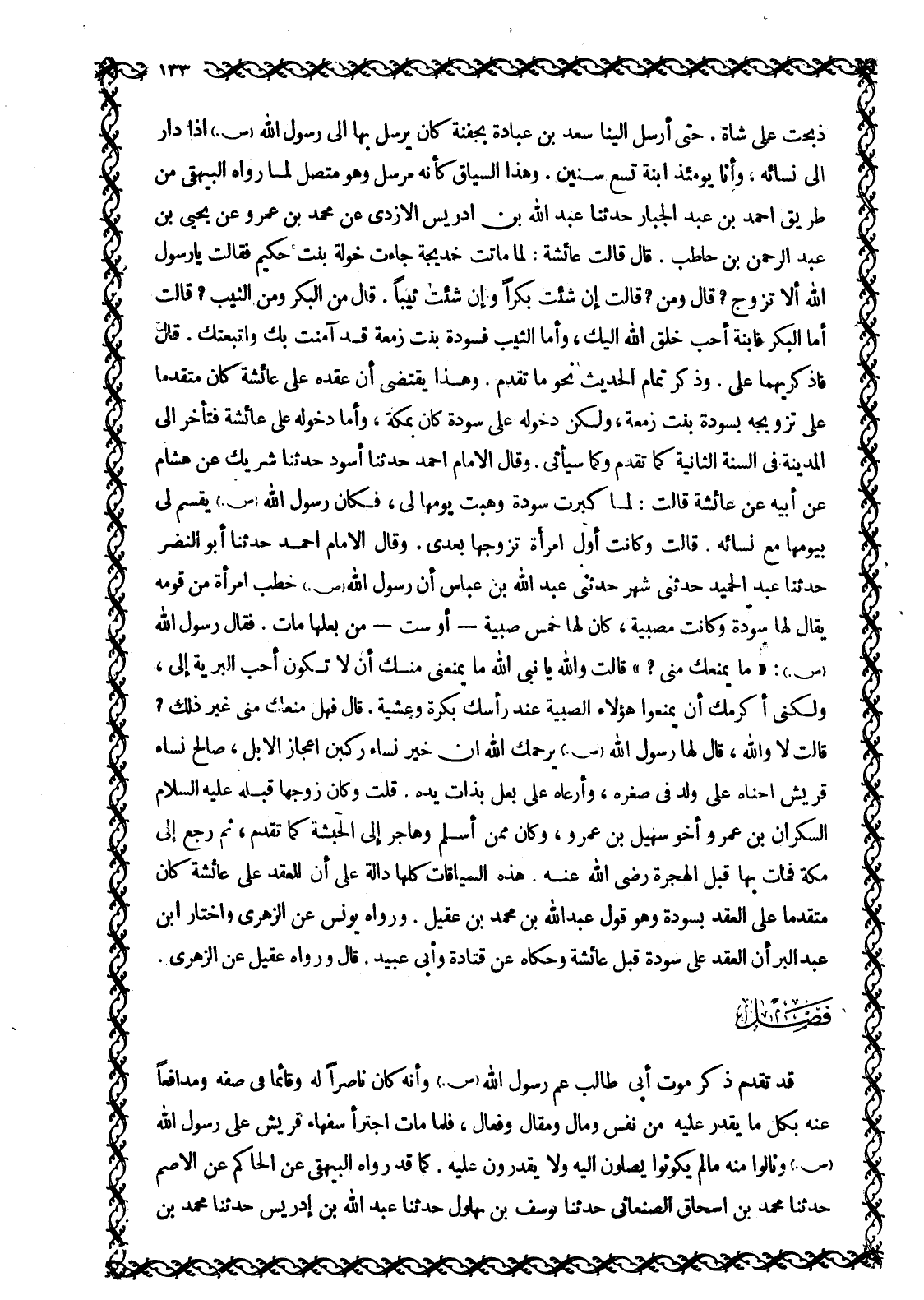 ذُبِحَتْ عَلَيَّ شَاةٌ. حَتَّى أَرْسَلَ إِلَيْنَا سَعْدُ بْنُ عُبَادَةَ بِجَفْنَةٍ كَانَ يُرْسِلُ بِهَا إِلَى رَسُولِ اللَّهِ صَلَّى اللَّهُ عَلَيْهِ وَسَلَّمَ إِذَا دَارَ إِلَى نِسَائِهِ، وَأَنَا يَوْمَئِذٍ ابْنَةُ تِسْعِ سِنِينَ. وَهَذَا السِّيَاقُ كَأَنَّهُ مُرْسَلٌ وَهُوَ مُتَّصِلٌ لِمَا رَوَاهُ الْبَيْهَقِيُّ مِنْ طَرِيقِ أَحْمَدَ بْنِ عَبْدِ الْجَبَّارِ حَدَّثَنَا عَبْدُ اللَّهِ بْنُ إِدْرِيسَ الأزدي عَنْ مُحَمَّدِ بْنِ عَمْرٍو عَنْ يَحْيَى بْنِ عَبْدِ الرَّحْمَنِ بْنِ حَاطِبٍ. قَالَ قَالَتْ عَائِشَةُ: لَمَّا مَاتَتْ خَدِيجَةُ جَاءَتْ خَوْلَةُ بِنْتُ حَكِيمٍ فَقَالَتْ يَا رَسُولَ اللَّهِ أَلَا تَزَوَّجُ؟ قَالَ وَمَنْ؟ قَالَتْ إِنْ شِئْتَ بِكْرًا وَإِنْ شِئْتَ ثَيِّبًا. قَالَ مَنِ الْبِكْرُ وَمَنِ الثَّيِّبُ؟ قَالَتْ أَمَّا الْبِكْرُ فَابْنَةُ أَحَبِّ خَلْقِ اللَّهِ إِلَيْكَ، وَأَمَّا الثَّيِّبُ فَسَوْدَةُ بِنْتُ زَمْعَةَ قَدْ آمَنَتْ بِكَ وَاتَّبَعَتْكَ. قَالَ فَاذْكُرِيهِمَا عَلَيَّ. وَذَكَرَ تَمَامَ الْحَدِيثِ نَحْوَ مَا تَقَدَّمَ. وَهَذَا يَقْتَضِي أَنَّ عَقْدَهُ عَلَى عَائِشَةَ كَانَ مُتَقَدِّمًا عَلَى تَزْوِيجِهِ بِسَوْدَةَ بِنْتِ زَمْعَةَ، وَلَكِنَّ دُخُولَهُ عَلَى سَوْدَةَ كَانَ بِمَكَّةَ، وَأَمَّا دُخُولُهُ عَلَى عَائِشَةَ فَتَأَخَّرَ إِلَى الْمَدِينَةِ فِي السَّنَةِ الثَّانِيَةِ كَمَا تَقَدَّمَ وَكَمَا سَيَأْتِي. وَقَالَ الْإِمَامُ أَحْمَدُ حَدَّثَنَا أَسْوَدُ حَدَّثَنَا شَرِيكٌ عَنْ هِشَامٍ عَنْ أَبِيهِ عَنْ عَائِشَةَ قَالَتْ: لَمَّا كَبِرَتْ سَوْدَةُ وَهَبَتْ يَوْمَهَا لِي، فَكَانَ رَسُولُ اللَّهِ صَلَّى اللَّهُ عَلَيْهِ وَسَلَّمَ يَقْسِمُ لِي بِيَوْمِهَا مَعَ نِسَائِهِ. قَالَتْ وَكَانَتْ أَوَّلَ امْرَأَةٍ تَزَوَّجَهَا بَعْدِي. وَقَالَ الْإِمَامُ أَحْمَدُ حَدَّثَنَا أَبُو النَّضْرِ حَدَّثَنَا عَبْدُ الْحَمِيدِ حَدَّثَنِي شَهْرٌ حَدَّثَنِي عَبْدُ اللَّهِ بْنُ عَبَّاسٍ أَنَّ رَسُولَ اللَّهِ صَلَّى اللَّهُ عَلَيْهِ وَسَلَّمَ خَطَبَ امْرَأَةً مِنْ قَوْمِهِ يُقَالُ لَهَا سَوْدَةُ وكانت مصيبة، كان لها خمس صبية- أو ست- من بعلها مَاتَ. فَقَالَ رَسُولُ اللَّهِ صَلَّى اللَّهُ عَلَيْهِ وَسَلَّمَ: «مَا يَمْنَعُكِ مِنِّي؟» قَالَتْ وَاللَّهِ يَا نَبِيَّ اللَّهِ مَا يَمْنَعُنِي مِنْكَ أَنْ لَا تَكُونَ أَحَبَّ الْبَرِّيَّةِ إِلَيَّ، وَلَكِنِّي أُكْرِمُكَ أَنْ يمنعوا هَؤُلَاءِ الصِّبْيَةُ عِنْدَ رَأْسِكَ بُكْرَةً وَعَشِيَّةً. قَالَ فَهَلْ مَنَعَكِ مِنِّي غَيْرُ ذَلِكَ؟