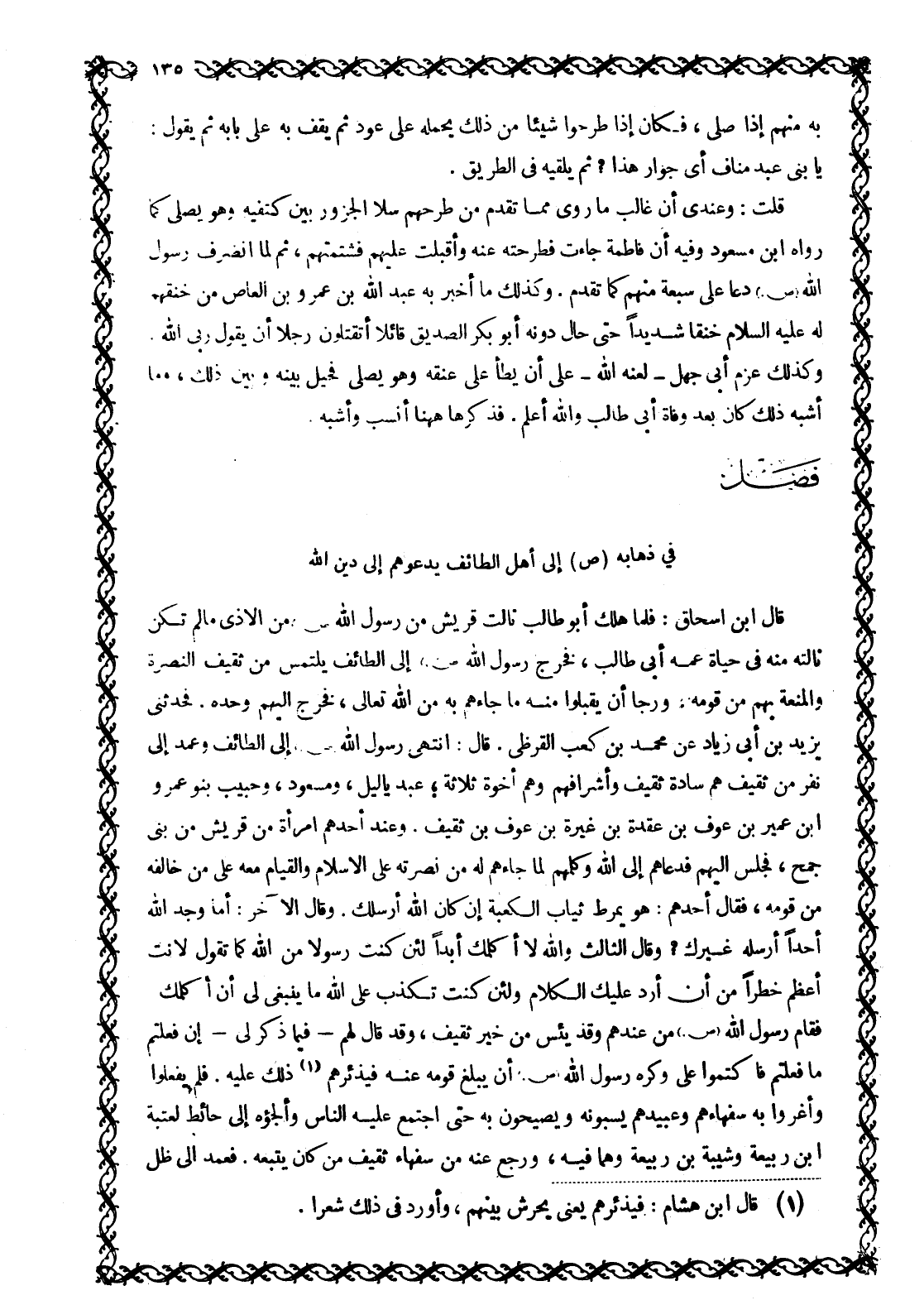 في ذهابه عليه السلام إلى أهل الطائف يدعوهم إلى الله تعالى وَإِلَى نُصْرَةِ دِينِهِ فَرَدُّوا عَلَيْهِ ذَلِكَ وَلَمْ يقبلوا فرجع عنهم إِلَى مَكَّةَ قَالَ ابْنُ إِسْحَاقَ: فَلَمَّا هَلَكَ أَبُو طَالِبٍ نَالَتْ قُرَيْشٌ مِنْ رَسُولِ اللَّهِ صَلَّى اللَّهُ عَلَيْهِ وَسَلَّمَ مِنَ الْأَذَى مَا لم تكن نالته مِنْهُ فِي حَيَاةِ عَمِّهِ أَبِي طَالِبٍ، فَخَرَجَ رَسُولُ اللَّهِ صَلَّى اللَّهُ عَلَيْهِ وَسَلَّمَ إِلَى الطَّائِفِ يَلْتَمِسُ مِنْ ثَقِيفٍ النُّصْرَةَ وَالْمَنَعَةَ بِهِمْ من قومه، ورجا أَنْ يَقْبَلُوا مِنْهُ مَا جَاءَهُمْ بِهِ مِنَ اللَّهِ تَعَالَى، فَخَرَجَ إِلَيْهِمْ وَحْدَهُ. فَحَدَّثَنِي يَزِيدُ بْنُ أَبِي زِيَادٍ عَنْ مُحَمَّدِ بْنِ كَعْبٍ الْقُرَظِيِّ. قَالَ: انْتَهَى رَسُولُ اللَّهِ صَلَّى اللَّهُ عَلَيْهِ وَسَلَّمَ إِلَى الطائف وعمد إِلَى نَفَرٍ مِنْ ثَقِيفٍ هُمْ سَادَةُ ثَقِيفٍ وَأَشْرَافُهُمْ وَهُمْ إِخْوَةٌ ثَلَاثَةٌ، عَبْدُ يَالِيلَ، وَمَسْعُودٌ، وحبيب بنو عمرو ابن عُمَيْرِ بْنِ عَوْفِ بْنِ عُقْدَةَ بْنِ غِيَرَةَ بْنِ عَوْفِ بْنِ ثَقِيفٍ. وَعِنْدَ أَحَدِهِمُ امْرَأَةٌ مِنْ قُرَيْشٍ مِنْ بَنِي جُمَحَ، فَجَلَسَ إِلَيْهِمْ فدعاهم إلى الله وكلمهم لما جَاءَهُمْ لَهُ مِنْ نُصْرَتِهِ عَلَى الْإِسْلَامِ وَالْقِيَامِ مَعَهُ عَلَى مَنْ خَالَفَهُ مِنْ قَوْمِهِ، فَقَالَ أَحَدُهُمْ: هُوَ يَمْرُطُ ثِيَابَ الْكَعْبَةِ إِنْ كَانَ اللَّهُ أَرْسَلَكَ. وَقَالَ الْآخَرُ: أَمَا وَجَدَ اللَّهُ أَحَدًا أَرْسَلَهُ غَيْرَكَ؟ وَقَالَ الثَّالِثُ وَاللَّهِ لَا أُكَلِّمُكَ أَبَدًا لَئِنْ كُنْتَ رَسُولًا مِنَ اللَّهِ كَمَا تَقُولُ لَأَنْتَ أَعْظَمُ خَطَرًا مِنْ أَنْ أَرُدَّ عَلَيْكَ الْكَلَامَ وَلَئِنْ كُنْتَ تَكْذِبُ عَلَى اللَّهِ مَا يَنْبَغِي لِي أَنْ أُكَلِّمَكَ.