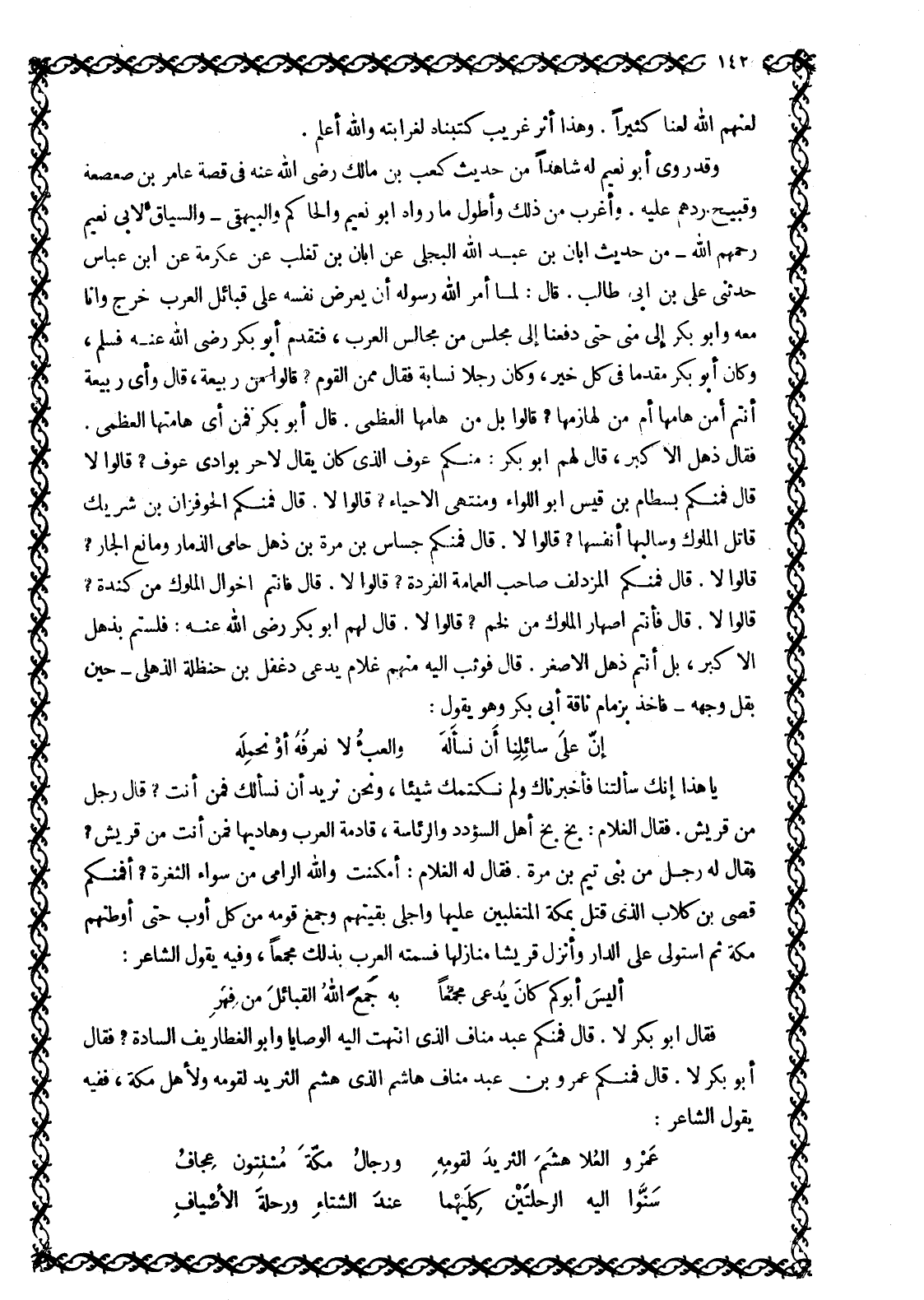 فَقَالَ أَبُو بَكْرٍ لَا. قَالَ فَمِنْكُمْ عَبْدُ مَنَافٍ الَّذِي انْتَهَتْ إِلَيْهِ الْوَصَايَا وَأَبُو الْغَطَارِيفِ السَّادَةِ؟ فَقَالَ أَبُو بَكْرٍ لَا. قَالَ فَمِنْكُمْ عَمْرُو بْنُ عَبْدِ مَنَافٍ هَاشِمٌ الَّذِي هَشَمَ الثَّرِيدَ لِقَوْمِهِ وَلِأَهْلِ مَكَّةَ، فَفِيهِ يَقُولُ الشَّاعِرُ:
