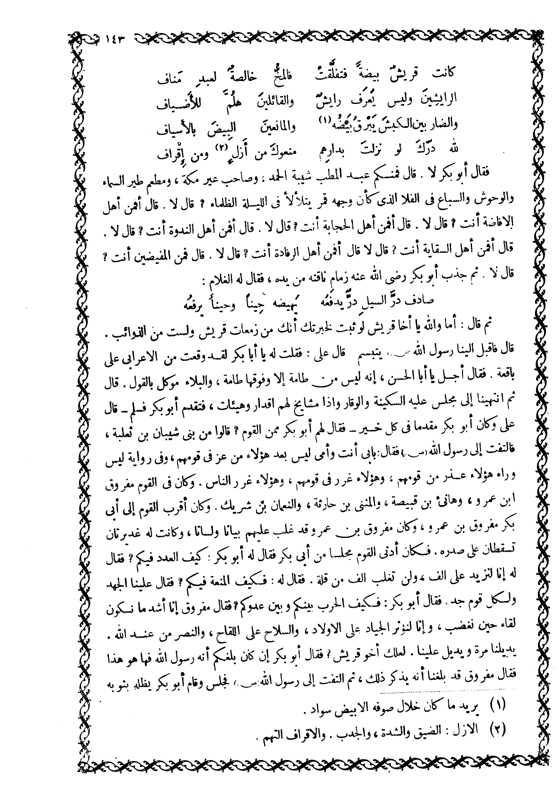 فَقَالَ أَبُو بَكْرٍ لَا. قَالَ فَمِنْكُمْ عَبْدُ الْمُطَّلِبِ شَيْبَةُ الْحَمْدِ، وَصَاحِبُ عِيرِ مَكَّةَ، وَمُطْعِمُ طَيْرِ السَّمَاءِ وَالْوُحُوشِ وَالسِّبَاعِ فِي الْفَلَا الَّذِي كَأَنَّ وَجْهَهُ قَمَرٌ يَتَلَأْلَأُ فِي اللَّيْلَةِ الظَّلْمَاءِ؟ قَالَ لَا. قَالَ أَفَمِنْ أَهْلِ الْإِفَاضَةِ أَنْتَ؟ قَالَ لَا. قَالَ أَفَمِنْ أَهْلِ الْحِجَابَةِ أَنْتَ؟ قَالَ لَا. قَالَ أَفَمِنْ أَهْلِ النَّدْوَةِ أَنْتَ؟ قَالَ لَا.