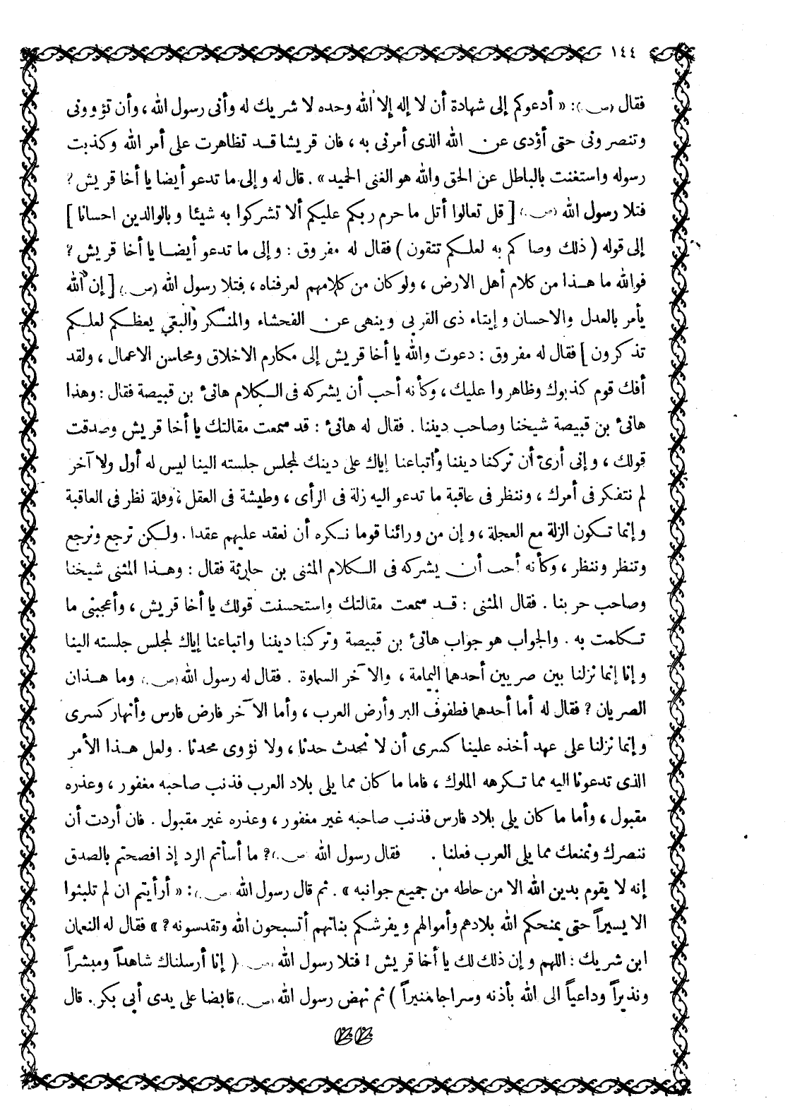 فو الله مَا هَذَا مِنْ كَلَامِ أَهْلِ الْأَرْضِ، وَلَوْ كَانَ مِنْ كَلَامِهِمْ لَعَرَفْنَاهُ، فَتَلَا رَسُولُ اللَّهِ صَلَّى اللَّهُ عَلَيْهِ وَسَلَّمَ إِنَّ اللَّهَ يَأْمُرُ بِالْعَدْلِ وَالْإِحْسانِ وَإِيتاءِ ذِي الْقُرْبى وَيَنْهى عَنِ الْفَحْشاءِ وَالْمُنْكَرِ وَالْبَغْيِ يَعِظُكُمْ لَعَلَّكُمْ تَذَكَّرُونَ 16: 90 فقال له مفروق: دعوت والله يا أخا قريش إِلَى مَكَارِمِ الْأَخْلَاقِ وَمَحَاسِنِ الْأَعْمَالِ، وَلَقَدْ أُفِكَ قَوْمٌ كَذَّبُوكَ وَظَاهَرُوا عَلَيْكَ، وَكَأَنَّهُ أَحَبَّ أَنْ يَشْرَكَهُ فِي الْكَلَامِ هَانِئُ بْنُ قَبِيصَةَ فَقَالَ: وَهَذَا هَانِئُ بْنُ قَبِيصَةَ شَيْخُنَا وَصَاحِبُ دِينِنَا. فَقَالَ لَهُ هَانِئٌ: قَدْ سَمِعْتُ مَقَالَتَكَ يَا أَخَا قُرَيْشٍ وَصَدَّقْتُ قَوْلَكَ، وَإِنِّي أَرَى أَنَّ تَرْكَنَا دِينَنَا وَاتِّبَاعَنَا إِيَّاكَ عَلَى دِينِكَ لِمَجْلِسٍ جَلَسْتَهُ إِلَيْنَا لَيْسَ لَهُ أَوَّلُ وَلَا آخِرٌ لَمْ نَتَفَكَّرْ فِي أَمْرِكَ، وَنَنْظُرْ فِي عَاقِبَةِ مَا تَدْعُو إِلَيْهِ زَلَّةٌ فِي الرَّأْيِ، وَطَيْشَةٌ فِي الْعَقْلِ، وَقِلَّةُ نَظَرٍ فِي الْعَاقِبَةِ وَإِنَّمَا تَكُونُ الزَّلَّةُ مَعَ الْعَجَلَةِ، وَإِنَّ مِنْ وَرَائِنَا قَوْمًا نَكْرَهُ أَنْ نَعْقِدَ عَلَيْهِمْ عَقْدًا. وَلَكِنْ تَرْجِعُ وَنَرْجِعُ وَتَنْظُرُ وَنَنْظُرُ، وَكَأَنَّهُ أَحَبَّ أَنْ يَشْرَكَهُ فِي الْكَلَامِ الْمُثَنَّى بْنُ حَارِثَةَ فَقَالَ: وَهَذَا الْمُثَنَّى شَيْخُنَا وَصَاحِبُ حَرْبِنَا. فَقَالَ الْمُثَنَّى: قَدْ سَمِعْتُ مَقَالَتَكَ وَاسْتَحْسَنْتُ قَوْلَكَ يَا أَخَا قُرَيْشٍ، وَأَعْجَبَنِي مَا تَكَلَّمْتَ بِهِ. وَالْجَوَابُ هُوَ جَوَابُ هَانِئِ بْنِ قَبِيصَةَ وَتَرْكُنَا دِينَنَا وَاتِّبَاعُنَا إِيَّاكَ لِمَجْلِسٍ جَلَسْتَهُ إِلَيْنَا وَإِنَّا إِنَّمَا نَزَلْنَا بين صريين أحدهما اليمامة، والآخر السماوة. فَقَالَ لَهُ رَسُولُ اللَّهِ صَلَّى اللَّهُ عَلَيْهِ وَسَلَّمَ وَمَا هذان الصريان؟ فَقَالَ لَهُ أَمَّا أَحَدُهُمَا فَطُفُوفُ الْبَرِّ وَأَرْضُ الْعَرَبِ، وَأَمَّا الْآخَرُ فَأَرْضُ فَارِسَ وَأَنْهَارُ كِسْرَى وَإِنَّمَا نَزَلْنَا عَلَى عَهْدٍ أَخَذَهُ عَلَيْنَا كِسْرَى أَنْ لَا نُحْدِثَ حَدَثًا، وَلَا نُؤْوِيَ مُحْدِثًا. وَلَعَلَّ هَذَا الْأَمْرَ الَّذِي تَدْعُونَا إِلَيْهِ مِمَّا تَكْرَهُهُ الْمُلُوكُ، فَأَمَّا مَا كَانَ مِمَّا يَلِي بِلَادَ الْعَرَبِ فَذَنْبُ صَاحِبِهِ مَغْفُورٌ، وَعُذْرُهُ مَقْبُولٌ، وَأَمَّا مَا كَانَ يَلِي بِلَادَ فَارِسَ فَذَنَبُ صَاحِبِهِ غَيْرُ مَغْفُورٍ، وَعُذْرُهُ غَيْرُ مَقْبُولٍ. فَإِنْ أَرَدْتَ أَنْ نَنْصُرَكَ وَنَمْنَعَكَ مِمَّا يَلِي الْعَرَبَ فَعَلْنَا. [1] فَقَالَ رَسُولُ اللَّهِ صَلَّى اللَّهُ عَلَيْهِ وَسَلَّمَ؟ مَا أَسَأْتُمُ الرَّدَّ إِذْ أَفْصَحْتُمْ بِالصِّدْقِ إِنَّهُ لَا يَقُومُ بِدِينِ اللَّهِ إِلَّا مَنْ حَاطَهُ مِنْ جَمِيعِ جَوَانِبِهِ» . ثُمَّ قَالَ رَسُولُ اللَّهِ صَلَّى اللَّهُ عَلَيْهِ وَسَلَّمَ: «أَرَأَيْتُمْ إِنْ لَمْ تَلْبَثُوا إِلَّا يَسِيرًا حَتَّى يَمْنَحَكُمُ اللَّهُ بِلَادَهُمْ وَأَمْوَالَهُمْ وَيُفْرِشَكُمْ بَنَاتِهِمْ أَتُسَبِّحُونَ اللَّهَ وَتُقَدِّسُونَهُ؟» فقال له النعمان ابن شَرِيكٍ: اللَّهمّ وَإِنَّ ذَلِكَ لَكَ يَا أَخَا قُرَيْشٍ! فَتَلَا رَسُولُ اللَّهِ صَلَّى اللَّهُ عَلَيْهِ وَسَلَّمَ إِنَّا أَرْسَلْناكَ شاهِداً وَمُبَشِّراً وَنَذِيراً وَداعِياً إِلَى اللَّهِ بِإِذْنِهِ وَسِراجاً مُنِيراً 33: 45- 46 ثُمَّ نَهَضَ رَسُولُ اللَّهِ صَلَّى اللَّهُ عَلَيْهِ وَسَلَّمَ قَابِضًا عَلَى يَدَيْ أَبِي بَكْرٍ. قَالَ