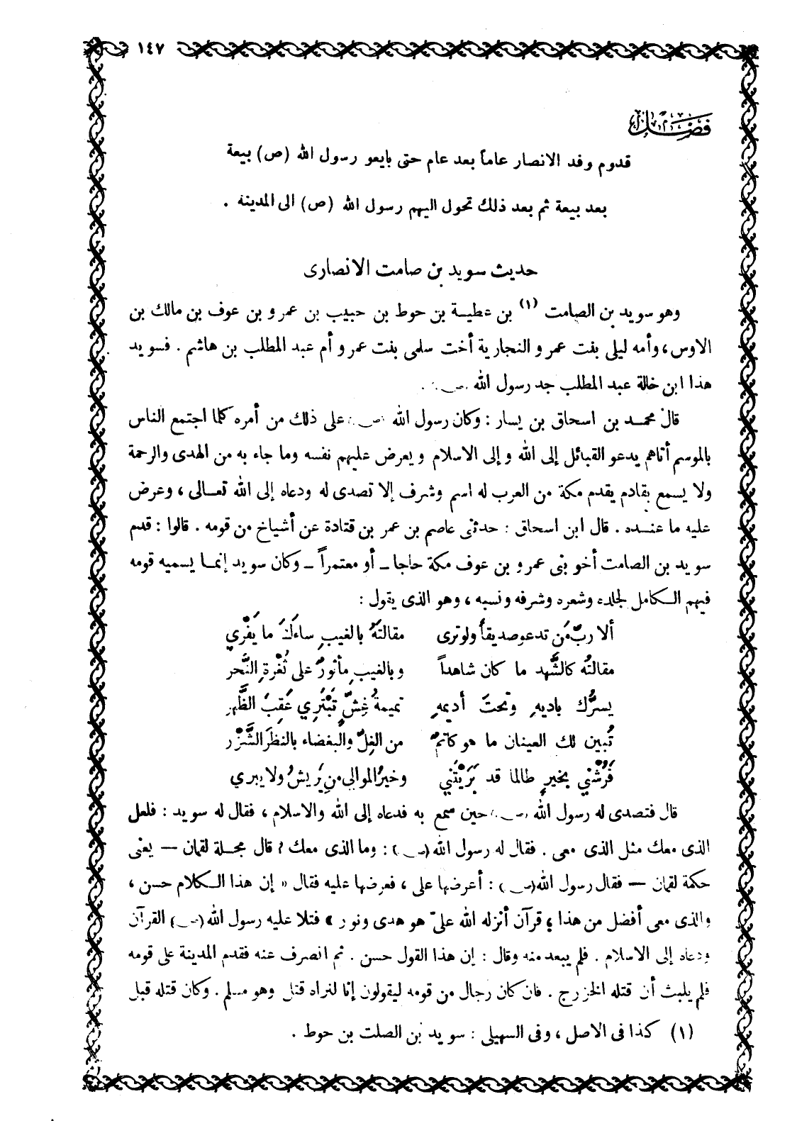 قَالَ فَتَصَدَّى لَهُ رَسُولُ اللَّهِ صَلَّى اللَّهُ عَلَيْهِ وَسَلَّمَ حِينَ سَمِعَ بِهِ فَدَعَاهُ إِلَى اللَّهِ وَالْإِسْلَامِ، فَقَالَ لَهُ سُوَيْدٌ: فَلَعَلَّ الَّذِي مَعَكَ مِثْلُ الَّذِي مَعِي. فَقَالَ لَهُ رَسُولُ اللَّهِ صَلَّى اللَّهُ عَلَيْهِ وَسَلَّمَ: وَمَا الَّذِي مَعَكَ؟ قَالَ مَجَلَّةُ لُقْمَانَ- يَعْنِي حِكْمَةَ لُقْمَانَ- فَقَالَ رَسُولُ اللَّهِ صَلَّى اللَّهُ عَلَيْهِ وَسَلَّمَ: اعْرِضْهَا عَلَيَّ، فَعَرَضَهَا عَلَيْهِ فَقَالَ «إِنَّ هَذَا الْكَلَامَ حَسَنٌ، وَالَّذِي مَعِي أَفْضَلُ مِنْ هَذَا، قُرْآنٌ أَنْزَلَهُ اللَّهُ عَلَيَّ هُوَ هُدًى وَنُورٌ» فَتَلَا عَلَيْهِ رَسُولُ اللَّهِ صَلَّى اللَّهُ عَلَيْهِ وَسَلَّمَ الْقُرْآنَ وَدَعَاهُ إِلَى الْإِسْلَامِ. فَلَمْ يَبْعُدْ مِنْهُ وَقَالَ: إِنَّ هَذَا الْقَوْلَ حَسَنٌ. ثُمَّ انْصَرَفَ عَنْهُ فَقَدِمَ الْمَدِينَةَ عَلَى قَوْمِهِ فَلَمْ يَلْبَثْ أَنْ قتله الْخَزْرَجُ. فَإِنْ كَانَ رِجَالٌ مِنْ قَوْمِهِ لَيَقُولُونَ إِنَّا لَنَرَاهُ قُتِلَ وَهُوَ مُسْلِمٌ. وَكَانَ قَتْلُهُ قبل
