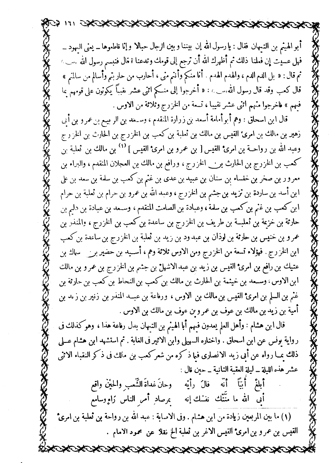 أَبُو الْهَيْثَمِ بْنُ التَّيِّهَانِ فَقَالَ: يَا رَسُولَ اللَّهِ إِنَّ بَيْنَنَا وَبَيْنَ الرِّجَالِ حِبَالًا وَإِنَّا قَاطِعُوهَا- يَعْنِي الْيَهُودَ- فَهَلْ عَسَيْتَ إِنْ فَعَلْنَا ذَلِكَ ثُمَّ أَظْهَرَكَ اللَّهُ أَنْ تَرْجِعَ إِلَى قَوْمِكَ وَتَدَعَنَا؟ قَالَ فَتَبَسَّمَ رَسُولُ اللَّهِ صَلَّى اللَّهُ عَلَيْهِ وَسَلَّمَ ثُمَّ قَالَ: «بَلِ الدَّمُ الدَّمُ، وَالْهَدْمُ الْهَدْمُ. أَنَا مِنْكُمْ وَأَنْتُمْ مِنِّي، أُحَارِبُ مَنْ حَارَبْتُمْ وَأُسَالِمُ مَنْ سَالَمْتُمْ» قَالَ كَعْبٌ وَقَدْ قَالَ رَسُولُ اللَّهِ صَلَّى اللَّهُ عَلَيْهِ وَسَلَّمَ: «أَخْرِجُوا إِلَى مِنْكُمُ اثْنَيْ عَشَرَ نَقِيبًا يَكُونُونَ عَلَى قَوْمِهِمْ بِمَا فِيهِمْ» فَأَخْرَجُوا مِنْهُمُ اثْنَيْ عَشَرَ نَقِيبًا، تِسْعَةً مِنَ الْخَزْرَجِ وَثَلَاثَةً مِنَ الْأَوْسِ. قَالَ ابْنُ إِسْحَاقَ: وَهُمْ أَبُو أُمَامَةَ أَسْعَدُ بْنُ زُرَارَةَ الْمُتَقَدِّمُ، وَسَعْدُ بْنُ الرَّبِيعِ بْنِ عَمْرِو بْنِ أَبِي زُهَيْرِ بْنِ مَالِكِ بْنِ امْرِئِ الْقَيْسِ بْنِ مَالِكِ بْنِ ثَعْلَبَةَ بْنِ كَعْبِ بْنِ الْخَزْرَجِ بْنِ الْحَارِثِ بْنِ الْخَزْرَجِ وَعَبْدُ اللَّهِ بْنُ رَوَاحَةَ بْنِ امْرِئِ الْقَيْسِ [بْنِ عَمْرِو بْنِ امْرِئِ الْقَيْسِ] [1] بْنِ مَالِكِ بْنِ ثَعْلَبَةَ بْنِ كَعْبِ بْنِ الْخَزْرَجِ بْنِ الْحَارِثِ بْنِ الْخَزْرَجِ، وَرَافِعُ بْنُ مَالِكِ بْنِ الْعَجْلَانِ الْمُتَقَدِّمُ، وَالْبَرَاءُ بْنُ مَعْرُورِ بْنِ صَخْرِ بْنِ خَنْسَاءَ بْنِ سِنَانِ بْنِ عُبَيْدِ بْنِ عَدِيِّ بْنِ غَنْمِ بْنِ كَعْبِ بْنِ سَلَمَةَ بْنِ سَعْدِ بْنِ عَلِيِّ ابن أَسَدِ بْنِ سَارِدَةَ بْنِ تَزِيدَ بْنِ جُشَمَ بْنِ الْخَزْرَجِ، وَعَبْدُ اللَّهِ بْنُ عَمْرِو بْنِ حرام بن ثعلبة بن حرام ابن كَعْبِ بْنِ غَنْمِ بْنِ كَعْبِ بْنِ سَلَمَةَ، وَعُبَادَةُ بْنُ الصَّامِتِ الْمُتَقَدِّمُ، وَسَعْدُ بْنُ عُبَادَةَ بْنِ دُلَيْمِ بْنِ حَارِثَةَ بْنِ خُزَيْمَةَ بْنِ ثَعْلَبَةَ بْنِ طَرِيفِ بْنِ الْخَزْرَجِ بْنِ سَاعِدَةَ بْنِ كَعْبِ بْنِ الْخَزْرَجِ، وَالْمُنْذِرُ بْنُ عَمْرِو بْنِ خُنَيْسِ بْنِ حَارِثَةَ بْنِ لَوْذَانَ بْنِ عَبْدِ وُدِّ بْنِ زَيْدِ بْنِ ثَعْلَبَةَ بْنِ الْخَزْرَجِ بْنِ سَاعِدَةَ بْنِ كعب ابن الْخَزْرَجِ. فَهَؤُلَاءِ تِسْعَةٌ مِنَ الْخَزْرَجِ وَمِنَ الْأَوْسِ ثَلَاثَةٌ وَهُمْ، أُسَيْدُ بْنُ حُضَيْرِ بْنِ سِمَاكِ بْنِ عَتِيكِ بْنِ رَافِعِ بْنِ امْرِئِ الْقَيْسِ بْنِ زَيْدِ بْنِ عَبْدِ الْأَشْهَلِ بْنِ جُشَمَ بن الخزرج بن عمرو بن مالك ابن الْأَوْسِ، وَسَعْدُ بْنُ خَيْثَمَةَ بْنِ الْحَارِثِ بْنِ مَالِكِ بْنِ كَعْبِ بْنِ النَّحَّاطِ بْنِ كَعْبِ بْنِ حَارِثَةَ بْنِ غَنْمِ بْنِ السَّلْمِ بْنِ امْرِئِ الْقَيْسِ بْنِ مَالِكِ بْنِ الْأَوْسِ، وَرِفَاعَةُ بن عبد المنذر بن زنير بْنِ زَيْدِ بْنِ أُمَيَّةَ بْنِ زَيْدِ بْنِ مَالِكِ بْنِ عَوْفِ بْنِ عَمْرِو بْنِ عَوْفِ بْنِ مَالِكِ بْنِ الْأَوْسِ.