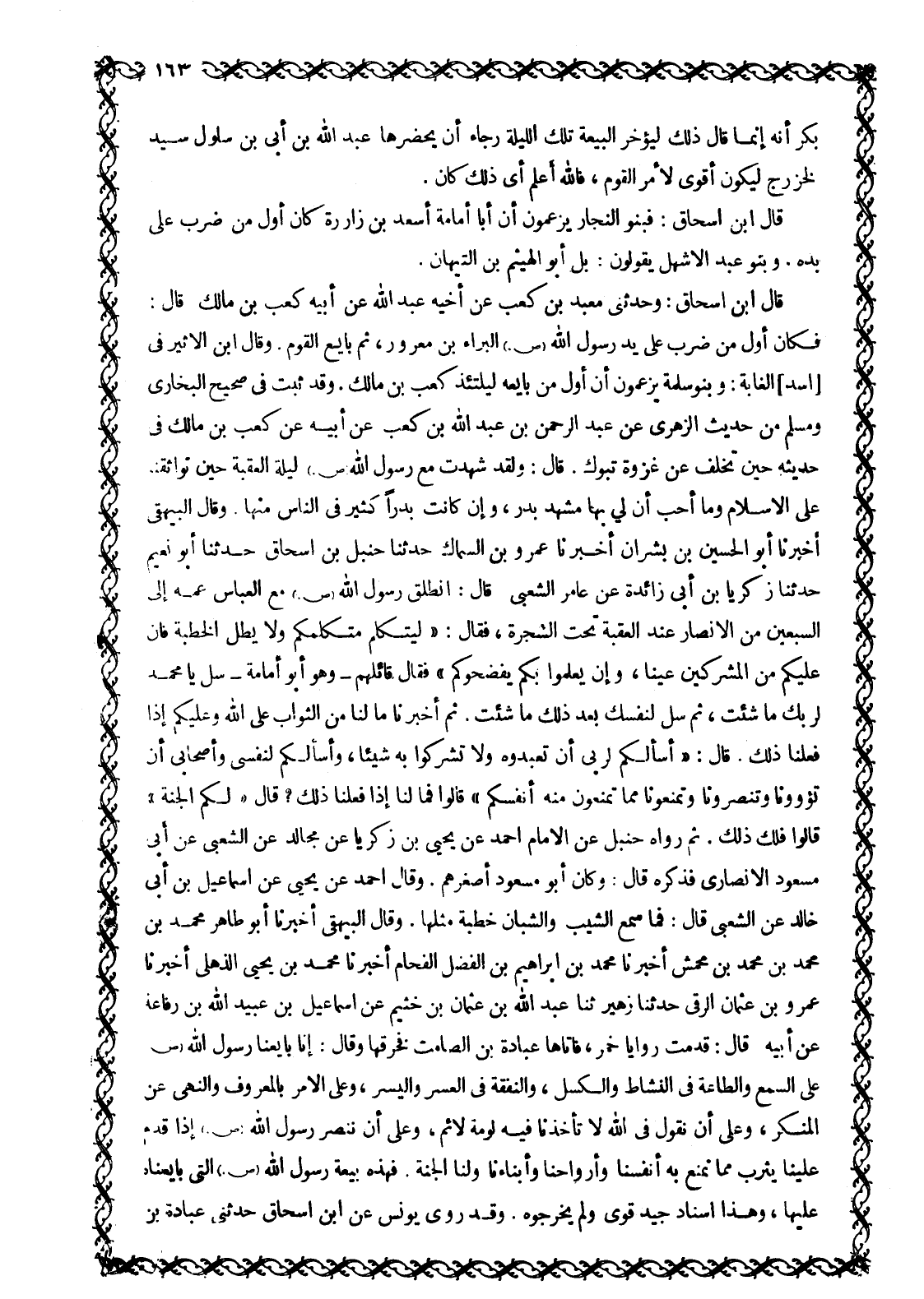 فَكَانَ أَوَّلَ مَنْ ضَرَبَ عَلَى يَدِ رَسُولِ اللَّهِ صَلَّى اللَّهُ عَلَيْهِ وَسَلَّمَ الْبَرَاءُ بْنُ مَعْرُورٍ، ثُمَّ بَايَعَ الْقَوْمُ. وَقَالَ ابْنُ الْأَثِيرِ فِي [أُسْدِ] الْغَابَةِ: وَبَنُو سَلِمَةَ يَزْعُمُونَ أَنَّ أَوَّلَ مَنْ بَايَعَهُ لَيْلَتَئِذٍ كَعْبُ بْنُ مَالِكٍ. وَقَدْ ثَبَتَ فِي صَحِيحِ الْبُخَارِيِّ وَمُسْلِمٍ مِنْ حَدِيثِ الزُّهْرِيِّ عَنْ عَبْدِ الرَّحْمَنِ بْنِ عَبْدِ اللَّهِ بْنِ كَعْبٍ عَنْ أَبِيهِ عَنْ كَعْبِ بْنِ مَالِكٍ فِي حَدِيثِهِ حِينَ تَخَلَّفَ عَنْ غَزْوَةِ تَبُوكَ. قَالَ: وَلَقَدْ شَهِدْتُ مَعَ رَسُولِ اللَّهِ صَلَّى اللَّهُ عَلَيْهِ وَسَلَّمَ لَيْلَةَ الْعَقَبَةِ حِينَ تَوَاثَقْنَا عَلَى الْإِسْلَامِ وَمَا أُحِبُّ أَنَّ لِي بها مشهد بدر، وإن كانت بدرا كثير فِي النَّاسِ مِنْهَا. وَقَالَ الْبَيْهَقِيُّ أَخْبَرَنَا أَبُو الْحُسَيْنِ بْنُ بِشْرَانَ أَخْبَرَنَا عَمْرُو بْنُ السَّمَّاكِ حَدَّثَنَا حَنْبَلُ بْنُ إِسْحَاقَ حَدَّثَنَا أَبُو نُعَيْمٍ حَدَّثَنَا زَكَرِيَّا بْنُ أَبِي زَائِدَةَ عَنْ عَامِرٍ الشَّعْبِيِّ قَالَ: انْطَلَقَ رَسُولُ اللَّهِ صَلَّى اللَّهُ عَلَيْهِ وَسَلَّمَ مَعَ الْعَبَّاسِ عَمِّهِ إِلَى السَّبْعِينَ مِنَ الْأَنْصَارِ عِنْدَ الْعَقَبَةِ تَحْتَ الشَّجَرَةِ، فَقَالَ: «لِيَتَكَلَّمْ مُتَكَلِّمُكُمْ وَلَا يُطِلِ الْخُطْبَةَ فَإِنَّ عَلَيْكُمْ مِنَ الْمُشْرِكِينَ عَيْنًا، وَإِنْ يَعْلَمُوا بِكُمْ يَفْضَحُوكُمْ» فَقَالَ قَائِلُهُمْ- وَهُوَ أَبُو أُمَامَةَ- سَلْ يَا مُحَمَّدُ لِرَبِّكَ مَا شِئْتَ، ثُمَّ سَلْ لِنَفْسِكَ بَعْدَ ذَلِكَ مَا شِئْتَ. ثُمَّ أَخْبِرْنَا مَا لَنَا مِنَ الثَّوَابِ عَلَى اللَّهِ وَعَلَيْكُمْ إِذَا فَعَلْنَا ذَلِكَ. قَالَ: «أَسْأَلُكُمْ لِرَبِّي أَنْ تَعْبُدُوهُ وَلَا تُشْرِكُوا بِهِ شَيْئًا، وَأَسْأَلُكُمْ لِنَفْسِي وَأَصْحَابِي أَنْ تُؤْوُونَا وَتَنْصُرُونَا وَتَمْنَعُونَا مِمَّا تَمْنَعُونَ مِنْهُ أَنْفُسَكُمْ» قَالُوا فَمَا لَنَا إِذَا فَعَلْنَا ذَلِكَ؟ قَالَ «لَكُمُ الْجَنَّةُ» قَالُوا فَلَكَ ذَلِكَ. ثُمَّ رَوَاهُ حَنْبَلٌ عَنِ الْإِمَامِ أَحْمَدَ عَنْ يَحْيَى بْنِ زَكَرِيَّا عَنْ مُجَالِدٍ عَنِ الشَّعْبِيِّ عَنْ أَبِي مَسْعُودٍ الْأَنْصَارِيِّ فَذَكَرُهُ قَالَ: وَكَانَ أَبُو مَسْعُودٍ أَصْغَرَهُمْ. وَقَالَ أَحْمَدُ عَنْ يَحْيَى عَنْ إِسْمَاعِيلَ بْنِ أَبِي خَالِدٍ عَنِ الشَّعْبِيِّ قَالَ: فَمَا سَمِعَ الشِّيبُ وَالشُّبَّانُ خُطْبَةً مِثْلَهَا. وَقَالَ الْبَيْهَقِيُّ أَخْبَرَنَا أَبُو طَاهِرٍ مُحَمَّدُ بْنُ مُحَمَّدِ بْنِ مُحَمَّدِ بْنِ مَحْمِشٍ أَخْبَرَنَا مُحَمَّدُ بْنُ إِبْرَاهِيمَ بْنِ الْفَضْلِ الْفَحَّامُ أَخْبَرَنَا مُحَمَّدُ بْنُ يَحْيَى الذُّهْلِيُّ أَخْبَرَنَا عَمْرُو بْنُ عُثْمَانَ الرَّقِّيُّ حَدَّثَنَا زُهَيْرٌ ثَنَا عَبْدُ اللَّهِ بْنُ عُثْمَانَ بْنِ خُثَيْمٍ عَنْ إِسْمَاعِيلَ بْنِ عُبَيْدِ اللَّهِ بْنِ رَفَاعَةَ عَنْ أَبِيهِ قَالَ: قَدِمَتْ رَوَايَا خَمْرٍ، فَأَتَاهَا عُبَادَةُ بْنُ الصَّامِتِ فَخَرَقَهَا وَقَالَ: إِنَّا بَايَعَنَا رَسُولَ اللَّهِ صَلَّى اللَّهُ عَلَيْهِ وَسَلَّمَ عَلَى السَّمْعِ وَالطَّاعَةِ فِي النَّشَاطِ وَالْكَسَلِ، والنفقة في العسر واليسير، وَعَلَى الْأَمْرِ بِالْمَعْرُوفِ وَالنَّهْيِ عَنِ الْمُنْكَرِ، وَعَلَى أَنْ نَقُولَ فِي اللَّهِ لَا تَأْخُذُنَا فِيهِ لَوْمَةُ لَائِمٍ، وَعَلَى أَنْ نَنْصُرَ رَسُولُ اللَّهِ صَلَّى اللَّهُ عَلَيْهِ وَسَلَّمَ إِذَا قَدِمَ عَلَيْنَا يثرب مما نمنع به أنفسنا وأرواحنا وَأَبْنَاءَنَا وَلَنَا الْجَنَّةُ. فَهَذِهِ بَيْعَةُ رَسُولِ اللَّهِ صَلَّى اللَّهُ عَلَيْهِ وَسَلَّمَ التِي بَايَعْنَاهُ عَلَيْهَا، وَهَ