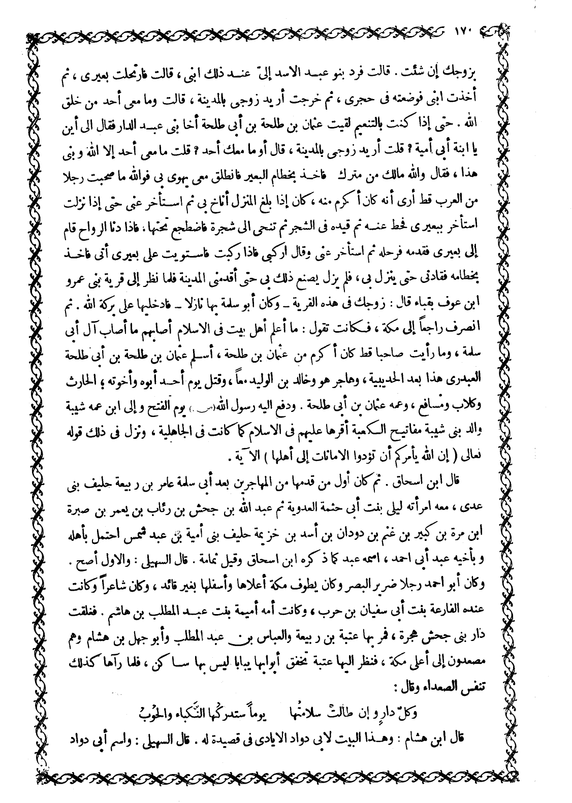 بِزَوْجِكِ إِنْ شِئْتِ. قَالَتْ فَرَدَّ بَنُو عَبْدِ الْأَسَدِ إِلَيَّ عِنْدَ ذَلِكَ ابْنِي، قَالَتْ فَارْتَحَلْتُ بَعِيرِي، ثُمَّ أَخَذْتُ ابْنِي فَوَضَعْتُهُ فِي حِجْرِي، ثُمَّ خَرَجْتُ أُرِيدُ زَوْجِي بِالْمَدِينَةِ، قَالَتْ وَمَا مَعِي أَحَدٌ مِنْ خَلْقِ اللَّهِ. حَتَّى إِذَا كُنْتُ بِالتَّنْعِيمِ لَقِيتُ عُثْمَانَ بْنَ طَلْحَةَ بْنِ أَبِي طَلْحَةَ أَخَا بَنِي عَبْدِ الدَّارِ فَقَالَ إِلَى أَيْنَ يَا ابْنَةَ أَبِي أُمَيَّةَ؟ قُلْتُ أُرِيدُ زَوْجِي بِالْمَدِينَةِ، قَالَ أَوْ مَا مَعَكِ أَحَدٌ؟ قُلْتُ مَا مَعِي أَحَدٌ إِلَّا اللَّهُ وبنى هَذَا، فَقَالَ وَاللَّهِ مَا لَكِ مِنْ مَتْرَكٍ. فاخذ بخطإ من البعير فانطلق معى يهوى بى فو الله مَا صَحِبْتُ رَجُلًا مِنَ الْعَرَبِ قَطُّ أَرَى أَنَّهُ كَانَ أَكْرَمَ مِنْهُ، كَانَ إِذَا بَلَغَ الْمَنْزِلَ أَنَاخَ بِي ثُمَّ اسْتَأْخَرَ عَنِّي حَتَّى إِذَا نَزَلْتُ اسْتَأْخَرَ بِبَعِيرِي فَحَطَّ عَنْهُ ثُمَّ قَيَّدَهُ فِي الشَّجَرِ ثُمَّ تَنَحَّى إِلَى شَجَرَةٍ فَاضْطَجَعَ تَحْتَهَا، فَإِذَا دَنَا الرَّوَاحُ قَامَ إِلَى بَعِيرِي فَقَدَّمَهُ فَرَحَّلَهُ ثُمَّ اسْتَأْخَرَ عَنِّي وَقَالَ ارْكَبِي فَإِذَا رَكِبْتُ فَاسْتَوَيْتُ عَلَى بَعِيرِي أَتَى فَأَخَذَ بِخِطَامِهِ فَقَادَنِي حَتَّى يَنْزِلَ بِي، فَلَمْ يَزَلْ يَصْنَعُ ذَلِكَ بِي حَتَّى أَقْدَمَنِي الْمَدِينَةَ فلما نظر إلى قرية بنى عمرو ابن عَوْفٍ بِقُبَاءٍ قَالَ: زَوْجُكِ فِي هَذِهِ الْقَرْيَةِ- وَكَانَ أَبُو سَلَمَةَ بِهَا نَازِلًا- فَادْخُلِيهَا عَلَى بَرَكَةِ اللَّهِ. ثُمَّ انْصَرَفَ رَاجِعًا إِلَى مَكَّةَ، فَكَانَتْ تَقُولُ: مَا أَعْلَمُ أَهْلَ بَيْتٍ فِي الْإِسْلَامِ أَصَابَهُمْ مَا أَصَابَ آلَ أَبِي سَلَمَةَ، وَمَا رَأَيْتُ صَاحِبًا قَطُّ كَانَ أَكْرَمَ مِنْ عُثْمَانَ بْنِ طَلْحَةَ، أَسْلَمَ عُثْمَانُ بْنُ طَلْحَةَ بْنِ أَبِي طَلْحَةَ الْعَبْدَرِيُّ هَذَا بَعْدَ الْحُدَيْبِيَةِ، وَهَاجَرَ هُوَ وَخَالِدُ بْنُ الْوَلِيدِ مَعًا، وَقُتِلَ يَوْمَ أُحُدٍ أَبُوهُ وَإِخْوَتُهُ، الْحَارِثُ وَكِلَابٌ وَمُسَافِعٌ، وَعَمُّهُ عُثْمَانُ بْنُ أَبِي طَلْحَةَ. وَدَفَعَ إِلَيْهِ رَسُولُ اللَّهِ صَلَّى اللَّهُ عَلَيْهِ وَسَلَّمَ يَوْمَ الْفَتْحِ وَإِلَى ابْنِ عَمِّهِ شَيْبَةَ وَالِدِ بَنِي شَيْبَةَ مَفَاتِيحَ الْكَعْبَةِ أَقَرَّهَا عَلَيْهِمْ فِي الْإِسْلَامِ كَمَا كَانَتْ فِي الْجَاهِلِيَّةِ، وَنَزَلَ فِي ذَلِكَ قَوْلُهُ تَعَالَى إِنَّ اللَّهَ يَأْمُرُكُمْ أَنْ تُؤَدُّوا الْأَماناتِ إِلى أَهْلِها 4: 58 الْآيَةَ.