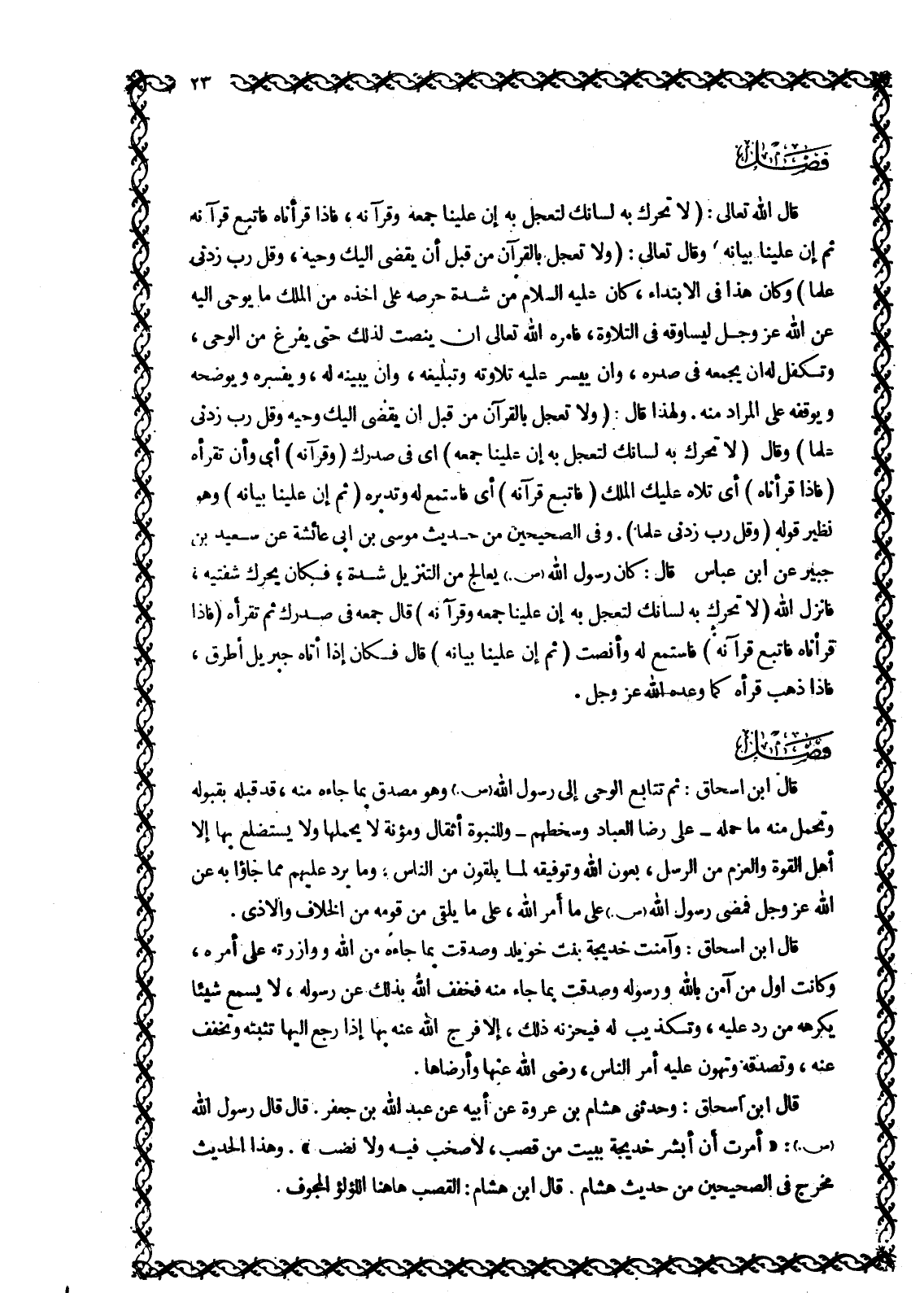 قَالَ اللَّهُ تَعَالَى: لَا تُحَرِّكْ بِهِ لِسانَكَ لِتَعْجَلَ بِهِ إِنَّ عَلَيْنا جَمْعَهُ وَقُرْآنَهُ، فَإِذا قَرَأْناهُ فَاتَّبِعْ قُرْآنَهُ ثُمَّ إِنَّ عَلَيْنا بَيانَهُ 75: 16- 19 وقال تعالى: وَلا تَعْجَلْ بِالْقُرْآنِ مِنْ قَبْلِ أَنْ يُقْضى إِلَيْكَ وَحْيُهُ، وَقُلْ رَبِّ زِدْنِي عِلْماً 20: 114 وَكَانَ هَذَا فِي الِابْتِدَاءِ، كَانَ عَلَيْهِ السَّلَامُ مِنْ شِدَّةِ حِرْصِهِ عَلَى أَخْذِهِ مِنَ الْمَلَكِ مَا يُوحَى إِلَيْهِ عَنِ اللَّهِ عَزَّ وَجَلَّ لَيُسَاوِقُهُ فِي التِّلَاوَةِ، فَأَمَرَهُ اللَّهُ تَعَالَى أَنْ يُنْصِتَ لِذَلِكَ حَتَّى يَفْرُغَ مِنَ الْوَحْيِ، وَتَكَفَّلَ لَهُ أَنْ يَجْمَعَهُ فِي صَدْرِهِ، وَأَنْ يُيَسِّرَ عَلَيْهِ تِلَاوَتَهُ وَتَبْلِيغَهُ، وَأَنْ يُبَيِّنَهُ لَهُ، وَيُفَسِّرَهُ وَيُوَضِّحَهُ وَيُوقِفَهُ عَلَى الْمُرَادِ مِنْهُ. وَلِهَذَا قَالَ: وَلا تَعْجَلْ بِالْقُرْآنِ مِنْ قَبْلِ أَنْ يُقْضى إِلَيْكَ وَحْيُهُ وَقُلْ رَبِّ زِدْنِي عِلْماً 20: 114 وَقَالَ لَا تُحَرِّكْ بِهِ لِسانَكَ لِتَعْجَلَ بِهِ إِنَّ عَلَيْنا جَمْعَهُ 75: 16- 17 اى في صدرك وَقُرْآنَهُ 75: 17 أي وأن تقرأه (فَإِذا قَرَأْناهُ) 75: 18 أي تلاه عليك الملك (فَاتَّبِعْ قُرْآنَهُ) 75: 18 أَيْ فَاسْتَمِعْ لَهُ وَتَدَبَّرْهُ (ثُمَّ إِنَّ عَلَيْنا بَيانَهُ) 75: 19 وَهُوَ نَظِيرُ قَوْلِهِ (وَقُلْ رَبِّ زِدْنِي عِلْماً) 20: 114. وَفِي الصَّحِيحَيْنِ مِنْ حَدِيثِ مُوسَى بْنِ أَبِي عَائِشَةَ عَنْ سَعِيدِ بْنِ جُبَيْرٍ عَنِ ابْنِ عَبَّاسٍ قَالَ: كَانَ رَسُولُ اللَّهِ صَلَّى اللَّهُ عَلَيْهِ وَسَلَّمَ يُعَالِجُ مِنَ التَّنْزِيلِ شِدَّةً، فَكَانَ يُحَرِّكُ شَفَتَيْهِ، فَأَنْزَلَ اللَّهُ لَا تُحَرِّكْ بِهِ لِسانَكَ لِتَعْجَلَ بِهِ إِنَّ عَلَيْنا جَمْعَهُ وَقُرْآنَهُ 75: 16- 17 قال جمعه في صدرك ثم تقرأه فَإِذا قَرَأْناهُ فَاتَّبِعْ قُرْآنَهُ 75: 18 فَاسْتَمِعْ لَهُ وَأَنْصِتْ ثُمَّ إِنَّ عَلَيْنا بَيانَهُ 75: 19 قَالَ فَكَانَ إِذَا أَتَاهُ جِبْرِيلُ أَطْرَقَ، فَإِذَا ذَهَبَ قَرَأَهُ كَمَا وَعَدَهُ اللَّهُ عَزَّ وَجَلَّ.