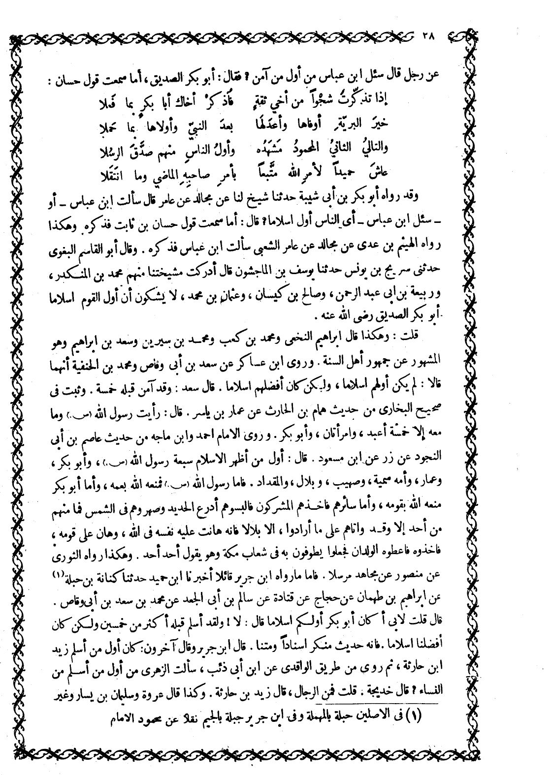 وَقَدْ رَوَاهُ أَبُو بَكْرِ بْنُ أَبِي شَيْبَةَ حَدَّثَنَا شَيْخٌ لَنَا عَنْ مُجَالِدٍ عَنْ عَامِرٍ قَالَ سَأَلْتُ ابْنَ عَبَّاسٍ- أَوْ- سُئِلَ ابْنُ عَبَّاسٍ- أَيُّ النَّاسِ أَوَّلُ إِسْلَامًا؟ قَالَ: أَمَا سَمِعْتَ قَوْلَ حَسَّانَ بْنِ ثَابِتٍ فَذَكَرَهُ وَهَكَذَا رَوَاهُ الْهَيْثَمُ بْنُ عَدِيٍّ عَنْ مُجَالِدٍ عَنْ عَامِرٍ الشَّعْبِيِّ سَأَلْتُ ابْنَ عَبَّاسٍ فَذَكَرَهُ. وَقَالَ أَبُو الْقَاسِمِ الْبَغَوِيُّ حَدَّثَنِي سُرَيْجُ بْنُ يُونُسَ حَدَّثَنَا يُوسُفُ بْنُ الْمَاجِشُونِ قَالَ أَدْرَكْتُ مَشْيَخَتَنَا مِنْهُمْ مُحَمَّدُ بْنُ الْمُنْكَدِرِ، وَرَبِيعَةُ بْنُ أَبِي عَبْدِ الرَّحْمَنِ، وَصَالِحُ بْنُ كَيْسَانَ، وَعُثْمَانُ بْنُ مُحَمَّدٍ، لَا يَشُكُّونَ أَنَّ أَوَّلَ الْقَوْمِ إِسْلَامًا أَبُو بَكْرٍ الصِّدِّيقُ رَضِيَ اللَّهُ عَنْهُ.