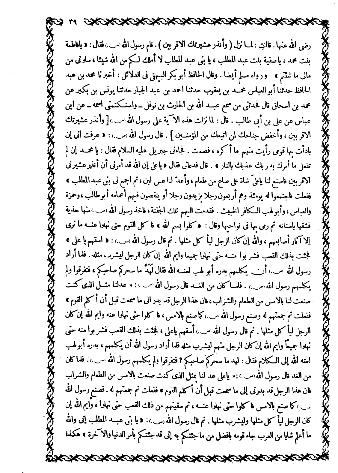 رَضِيَ اللَّهُ عَنْهَا. قَالَتْ: لَمَّا نَزَلَ وَأَنْذِرْ عَشِيرَتَكَ الْأَقْرَبِينَ 26: 214. قَامَ رَسُولُ اللَّهِ صَلَّى اللَّهُ عَلَيْهِ وَسَلَّمَ فَقَالَ: «يَا فَاطِمَةُ بِنْتَ مُحَمَّدٍ، يَا صَفِيَّةُ بِنْتَ عَبْدِ الْمُطَّلِبِ، يَا بَنِي عَبْدِ الْمُطَّلِبِ لَا أَمْلِكُ لَكُمْ مِنَ اللَّهِ شَيْئًا، سَلُونِي مِنْ مَالِي مَا شِئْتُمْ» . وَرَوَاهُ مُسْلِمٌ أَيْضًا. وَقَالَ الْحَافِظُ أَبُو بَكْرٍ الْبَيْهَقِيُّ فِي الدَّلَائِلِ: أخبرنا محمد بن عبد الْحَافِظُ حَدَّثَنَا أَبُو الْعَبَّاسِ مُحَمَّدُ بْنُ يَعْقُوبَ حَدَّثَنَا أَحْمَدُ بْنُ عَبْدِ الْجَبَّارِ حَدَّثَنَا يُونُسُ بْنُ بُكَيْرٍ عَنْ مُحَمَّدِ بْنِ إِسْحَاقَ قَالَ فَحَدَّثَنِي مَنْ سَمِعَ عَبْدَ اللَّهِ بْنَ الْحَارِثِ بْنِ نَوْفَلٍ- وَاسْتَكْتَمَنِي اسْمَهُ- عَنِ ابْنِ عَبَّاسٍ عَنْ عَلِيِّ بْنِ أَبِي طَالِبٍ. قَالَ: لَمَّا نَزَلَتْ هَذِهِ الْآيَةُ عَلَى رَسُولِ اللَّهِ صَلَّى اللَّهُ عَلَيْهِ وَسَلَّمَ وَأَنْذِرْ عَشِيرَتَكَ الْأَقْرَبِينَ، وَاخْفِضْ جَناحَكَ لِمَنِ اتَّبَعَكَ من الْمُؤْمِنِينَ 26: 214- 215. قَالَ رَسُولُ اللَّهِ صَلَّى اللَّهُ عَلَيْهِ وَسَلَّمَ: «عَرَفْتُ أَنِّي إِنْ بَادَأْتُ بِهَا قَوْمِي رَأَيْتُ مِنْهُمْ مَا أَكْرَهُ، فَصَمَتُّ. فَجَاءَنِي جِبْرِيلُ عَلَيْهِ السَّلَامُ فَقَالَ: يَا مُحَمَّدُ إِنْ لَمْ تَفْعَلْ ما أمرك به ربك عذبك بالنار» . قال فَدَعَانِي فَقَالَ «يَا عَلِيُّ إِنَّ اللَّهَ قَدْ أَمَرَنِي أَنْ أُنْذِرَ عَشِيرَتِيَ الْأَقْرَبِينَ فَاصْنَعْ لَنَا يَا عَلِيُّ شَاةً عَلَى صَاعٍ مِنْ طَعَامٍ، وَأَعِدَّ لَنَا عُسَّ لَبَنٍ، ثُمَّ اجْمَعْ لِي بنى عبد المطلب» ففعلت فاجتمعوا له يومئذ وهم أَرْبَعُونَ رَجُلًا يَزِيدُونَ رَجُلًا أَوْ يَنْقُصُونَ فِيهِمْ أَعْمَامُهُ أَبُو طَالِبٍ، وَحَمْزَةُ وَالْعَبَّاسُ، وَأَبُو لَهَبٍ الْكَافِرُ الْخَبِيثُ. فَقَدَّمْتُ إِلَيْهِمْ تِلْكَ الْجَفْنَةَ، فَأَخَذَ رَسُولُ اللَّهِ صَلَّى اللَّهُ عَلَيْهِ وَسَلَّمَ منها حِذْيَةً فَشَقَّهَا بِأَسْنَانِهِ ثُمَّ رَمَى بِهَا فِي نَوَاحِيهَا وَقَالَ: «كُلُوا بِسْمِ اللَّهِ» فَأَكَلَ الْقَوْمُ حتى نهلوا عنه ما نرى إِلَّا آثَارُ أَصَابِعِهِمْ، وَاللَّهِ إِنْ كَانَ الرَّجُلُ لَيَأْكُلُ مِثْلَهَا. ثُمَّ قَالَ رَسُولُ اللَّهِ صَلَّى اللَّهُ عَلَيْهِ وَسَلَّمَ: «اسْقِهِمْ يَا عَلِيُّ» فَجِئْتُ بِذَلِكَ الْقَعْبِ فَشَرِبُوا مِنْهُ حَتَّى نَهِلُوا جَمِيعًا وَايْمُ اللَّهِ إِنْ كَانَ الرَّجُلُ لَيَشْرَبُ مِثْلَهُ. فَلَمَّا أَرَادَ رَسُولُ اللَّهِ صَلَّى اللَّهُ عَلَيْهِ وَسَلَّمَ أَنْ يُكَلِّمَهُمْ بَدَرَهُ أَبُو لَهَبٍ لَعَنَهُ اللَّهُ فَقَالَ لَهَدَّ مَا سَحَرَكُمْ صَاحِبُكُمْ، فَتَفَرَّقُوا وَلَمْ يُكَلِّمْهُمْ رَسُولُ اللَّهِ صَلَّى اللَّهُ عَلَيْهِ وَسَلَّمَ. فَلَمَّا كَانَ مِنَ الْغَدِ قَالَ رَسُولُ اللَّهِ صَلَّى اللَّهُ عَلَيْهِ وَسَلَّمَ: «عدلنا مثل الَّذِي كُنْتَ صَنَعْتَ لَنَا بِالْأَمْسِ مِنَ الطَّعَامِ والشراب، فان هذا الرجل قد بدر إِلَى مَا سَمِعْتَ قَبْلَ أَنْ أُكَلِّمَ الْقَوْمَ» ففعلت ثم جمعتهم له وصنع رَسُولِ اللَّهِ صَلَّى اللَّهُ عَلَيْهِ وَسَلَّمَ كَمَا صَنَعَ بِالْأَمْسِ، فَأَكَلُوا حَتَّى نَهِلُوا عَنْهُ وَايْمُ اللَّهِ إِنْ كَانَ الرَّجُلُ لَيَأْكُلُ مِثْلَهَا. ثُمَّ قَالَ رَسُولُ اللَّهِ صَلَّى اللَّهُ عَلَيْهِ وَسَلَّمَ اسْقِهِمْ يَا عَلِيُّ، فَجِئْتُ بِذَلِكَ الْقَعْبِ فَشَرِبُوا مِنْهُ حَتَّى نَهِلُوا جَمِيعًا وَايْمُ اللَّهِ إِنْ كَانَ الرَّجُلُ مِنْهُمْ لَيَشْرَبُ مِثْلَهُ فَلَمَّا أَرَادَ رَسُولُ اللَّهِ أَنْ يُكَلِّمَهُمْ، بَدَرَهُ أَبُو لَهَبٍ لَعَنَهُ اللَّهُ إِلَى الْكَلَامِ فَ