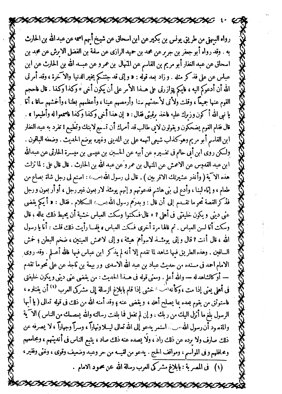 رَوَاهُ الْبَيْهَقِيُّ مِنْ طَرِيقِ يُونُسَ بْنِ بُكَيْرٍ عَنِ ابْنِ إِسْحَاقَ عَنْ شَيْخٍ أَبْهَمَ اسْمَهُ عَنْ عَبْدِ اللَّهِ بْنِ الْحَارِثِ بِهِ. وَقَدْ رَوَاهُ أَبُو جَعْفَرِ بْنُ جَرِيرٍ عَنْ مُحَمَّدِ بْنِ حُمَيْدٍ الرَّازِيِّ عَنْ سَلَمَةَ بْنِ الْفَضْلِ الْأَبْرَشِ عَنْ مُحَمَّدِ بْنِ إِسْحَاقَ عَنْ عَبْدِ الغفار أبو مَرْيَمَ بْنِ الْقَاسِمِ عَنِ الْمِنْهَالِ بْنِ عَمْرٍو عَنْ عَبْدِ اللَّهِ بْنِ الْحَارِثِ عَنِ ابْنِ عَبَّاسٍ عَنْ عَلِيٍّ فَذَكَرَ مِثْلَهُ. وَزَادَ بَعْدَ قوله: «وإني قد جثتكم بِخَيْرِ الدُّنْيَا وَالْآخِرَةِ، وَقَدْ أَمَرَنِي اللَّهُ أَنْ أَدْعُوَكُمْ إِلَيْهِ، فَأَيُّكُمْ يُؤَازِرُنِي عَلَى هَذَا الْأَمْرِ عَلَى أَنْ يَكُونَ أَخِي» وَكَذَا وَكَذَا. قَالَ فَأَحْجَمَ الْقَوْمُ عَنْهَا جَمِيعًا، وَقُلْتُ وَلَإِنِّي لَأَحْدَثُهُمْ سنا وأرمصهم عينا، وأعظمهم بطنا، وأخمشهم سَاقًا، أَنَا يَا نَبِيَّ اللَّهِ أَكُونُ وَزِيرَكَ عَلَيْهِ فَأَخَذَ بِرَقَبَتِي فَقَالَ: «إِنَّ هَذَا أَخِي وَكَذَا وَكَذَا فَاسْمَعُوا لَهُ وَأَطِيعُوا» . قَالَ فَقَامَ الْقَوْمُ يَضْحَكُونَ وَيَقُولُونَ لِأَبِي طَالِبٍ قَدْ أَمَرَكَ أَنْ تَسْمَعَ لِابْنِكَ وَتُطِيعَ! تَفَرَّدَ بِهِ عَبْدُ الغفار ابن الْقَاسِمِ أَبُو مَرْيَمَ وَهُوَ كَذَّابٌ شِيعِيٌّ اتَّهَمَهُ عَلِيُّ بْنُ الْمَدِينِيِّ وَغَيْرُهُ بِوَضْعِ الْحَدِيثِ. وَضَعَّفَهُ الْبَاقُونَ.