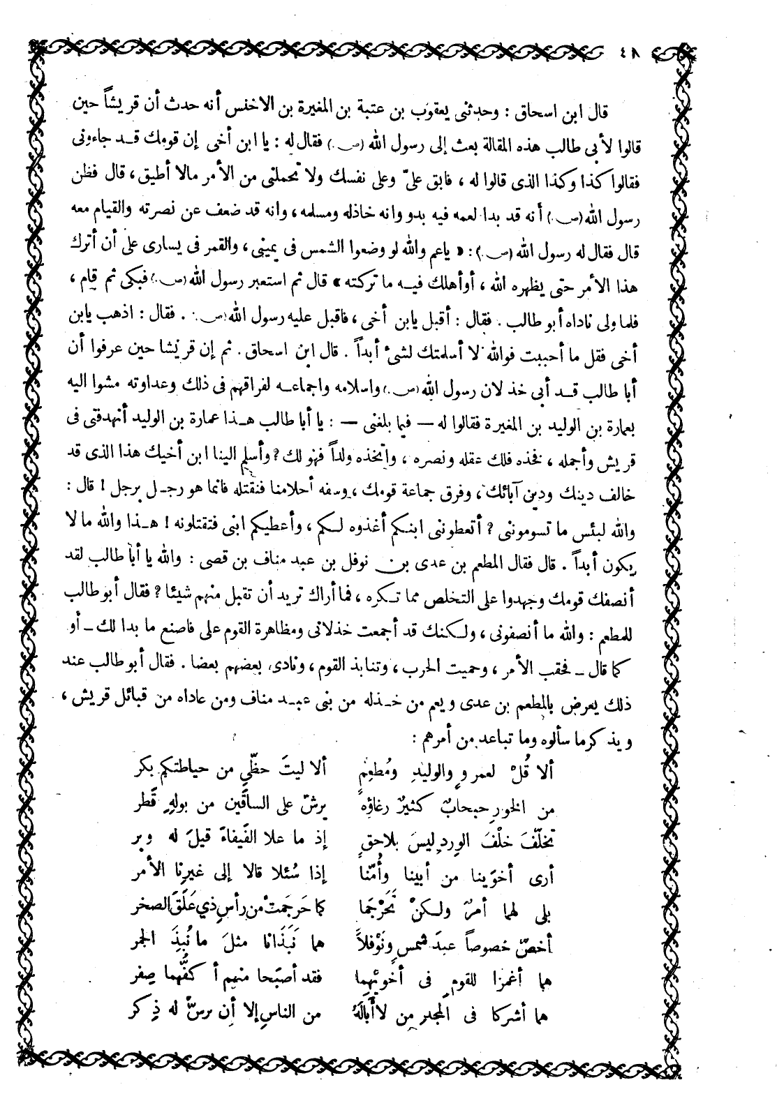 وَاللَّهِ لَبِئْسَ مَا تَسُومُونَنِي؟ أَتُعْطُونَنِي ابْنَكُمْ أَغْذُوهُ لَكُمْ، وأعطيكم ابني فتقتلونه! هَذَا وَاللَّهِ مَا لَا يَكُونُ أَبَدًا. قَالَ فَقَالَ الْمُطْعِمُ بْنُ عَدِيِّ بْنِ نَوْفَلِ بْنِ عَبْدِ مَنَافِ بْنِ قُصَيٍّ: وَاللَّهِ يَا أَبَا طَالِبٍ لَقَدْ أَنْصَفَكَ قَوْمُكَ وَجَهَدُوا عَلَى التَّخَلُّصِ مِمَّا تَكْرَهُ، فَمَا أَرَاكَ تُرِيدُ أَنْ تَقْبَلَ مِنْهُمْ شَيْئًا؟ فَقَالَ أَبُو طَالِبٍ لِلْمُطْعِمِ: وَاللَّهِ مَا أَنْصَفُونِي، وَلَكِنَّكَ قَدْ أَجْمَعْتَ خِذْلَانِي وَمُظَاهَرَةَ الْقَوْمِ عَلَيَّ فَاصْنَعْ مَا بَدَا لَكَ- أَوْ كَمَا قَالَ- فَحَقِبَ الْأَمْرُ، وَحَمِيَتِ الْحَرْبُ، وَتَنَابَذَ الْقَوْمُ، وَنَادَى بَعْضُهُمْ بَعْضًا. فَقَالَ أَبُو طَالِبٍ عِنْدَ ذَلِكَ يُعَرِّضُ بِالْمُطْعِمِ بْنِ عَدِيٍّ وَيَعُمُّ مَنْ خَذَلَهُ مِنْ بَنِي عَبْدِ مَنَافٍ وَمَنْ عَادَاهُ مِنْ قَبَائِلِ قُرَيْشٍ، وَيَذْكُرُ مَا سَأَلُوهُ وَمَا تَبَاعَدَ مِنْ أَمْرِهِمْ:
