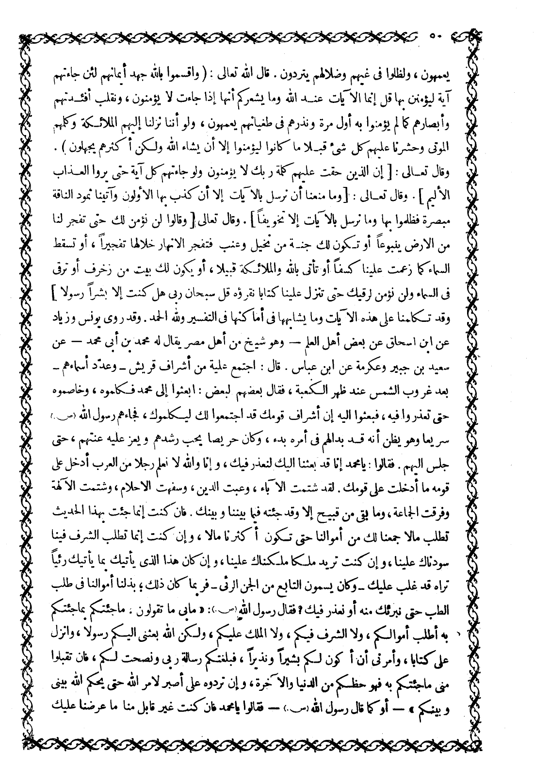 وقال تَعَالَى: إِنَّ الَّذِينَ حَقَّتْ عَلَيْهِمْ كَلِمَتُ رَبِّكَ لَا يُؤْمِنُونَ وَلَوْ جاءَتْهُمْ كُلُّ آيَةٍ حَتَّى يَرَوُا الْعَذابَ الْأَلِيمَ 10: 96- 97. وَقَالَ تَعَالَى: وَما مَنَعَنا أَنْ نُرْسِلَ بِالْآياتِ إِلَّا أَنْ كَذَّبَ بِهَا الْأَوَّلُونَ وَآتَيْنا ثَمُودَ النَّاقَةَ مُبْصِرَةً فَظَلَمُوا بِها وَما نُرْسِلُ بِالْآياتِ إِلَّا تَخْوِيفاً 17: 59. وَقَالَ تَعَالَى وَقالُوا لَنْ نُؤْمِنَ لَكَ حَتَّى تَفْجُرَ لَنا مِنَ الْأَرْضِ يَنْبُوعاً أَوْ تَكُونَ لَكَ جَنَّةٌ مِنْ نَخِيلٍ وَعِنَبٍ فَتُفَجِّرَ الْأَنْهارَ خِلالَها تَفْجِيراً، أَوْ تُسْقِطَ السَّماءَ كَما زَعَمْتَ عَلَيْنا كِسَفاً أَوْ تَأْتِيَ بِاللَّهِ وَالْمَلائِكَةِ قَبِيلًا، أَوْ يَكُونَ لَكَ بَيْتٌ مِنْ زُخْرُفٍ أَوْ تَرْقى فِي السَّماءِ وَلَنْ نُؤْمِنَ لِرُقِيِّكَ حَتَّى تُنَزِّلَ عَلَيْنا كِتاباً نَقْرَؤُهُ قُلْ سُبْحانَ رَبِّي هَلْ كُنْتُ إِلَّا بَشَراً رَسُولًا 17: 90- 93 وَقَدْ تَكَلَّمْنَا عَلَى هَذِهِ الْآيَاتِ وَمَا يُشَابِهُهَا فِي أَمَاكِنِهَا فِي التَّفْسِيرِ وللَّه الْحَمْدُ. وَقَدْ رَوَى يُونُسُ وَزِيَادٌ عَنِ ابْنِ إِسْحَاقَ عَنْ بَعْضِ أَهْلِ الْعِلْمِ- وَهُوَ شَيْخٌ مَنْ أَهْلِ مِصْرَ يُقَالُ لَهُ مُحَمَّدُ بْنُ أَبِي مُحَمَّدٍ- عَنْ سَعِيدِ بْنِ جُبَيْرٍ وَعِكْرِمَةَ عَنِ ابْنِ عَبَّاسٍ. قَالَ: اجْتَمَعَ عِلْيَةٌ مِنْ أَشْرَافِ قُرَيْشٍ- وَعَدَّدَ أَسْمَاءَهُمْ- بَعْدَ غُرُوبِ الشَّمْسِ عِنْدَ ظَهْرِ الْكَعْبَةِ، فَقَالَ بَعْضُهُمْ لِبَعْضٍ: ابْعَثُوا إِلَى مُحَمَّدٍ فَكَلِّمُوهُ، وَخَاصِمُوهُ حَتَّى تُعْذِرُوا فِيهِ، فَبَعَثُوا إِلَيْهِ إِنَّ أَشْرَافَ قَوْمِكَ قَدِ اجْتَمَعُوا لَكَ لِيُكَلِّمُوكَ، فَجَاءَهُمْ رَسُولُ اللَّهِ صَلَّى اللَّهُ عَلَيْهِ وَسَلَّمَ سَرِيعًا وَهُوَ يَظُنُّ أَنَّهُ قَدْ بَدَا لَهُمْ في أمره بدء، وَكَانَ حَرِيصًا يُحِبُّ رُشْدَهُمْ وَيَعِزُّ عَلَيْهِ عَنَتُهُمْ، حَتَّى جَلَسَ إِلَيْهِمْ. فَقَالُوا: يَا مُحَمَّدُ إِنَّا قَدْ بَعَثْنَا إِلَيْكَ لِنُعْذِرَ فِيكَ، وَإِنَّا وَاللَّهِ لَا نَعْلَمُ رَجُلًا مِنَ الْعَرَبِ أَدْخَلَ عَلَى قَوْمِهِ مَا أَدْخَلْتَ عَلَى قَوْمِكَ، لَقَدْ شَتَمْتَ الْآبَاءَ، وَعِبْتَ الدِّينَ، وَسَفَّهْتَ الْأَحْلَامَ، وَشَتَمْتَ الْآلِهَةَ وَفَرَّقْتَ الْجَمَاعَةَ، وَمَا بَقِيَ مِنْ قَبِيحٍ إِلَّا وَقَدْ جِئْتَهُ فِيمَا بَيْنَنَا وَبَيْنَكَ. فَإِنْ كُنْتَ إِنَّمَا جِئْتَ بِهَذَا الْحَدِيثِ تَطْلُبُ مَالًا جَمَعْنَا لَكَ مِنْ أَمْوَالِنَا حَتَّى تَكُونَ أَكْثَرَنَا مَالًا، وَإِنْ كُنْتَ إِنَّمَا تَطْلُبُ الشَّرَفَ فِينَا سَوَّدْنَاكَ عَلَيْنَا، وَإِنَّ كُنْتَ تُرِيدُ مُلْكًا مَلَّكْنَاكَ عَلَيْنَا، وإن كان هذا الّذي يأتيك بما يأتيك رئيا تراه قد غلب عليك- وكان يُسَمُّونَ التَّابِعَ مِنَ الْجِنِّ الرَّئِيَّ- فَرُبَّمَا كَانَ ذَلِكَ، بَذَلْنَا أَمْوَالَنَا فِي طَلَبِ الطِّبِّ حَتَّى نُبْرِئَكَ مِنْهُ أَوْ نُعْذِرَ فِيكَ؟ فَقَالَ رَسُولُ اللَّهِ صَلَّى اللَّهُ عَلَيْهِ وَسَلَّمَ: «مَا بِي مَا تَقُولُونَ، مَا جِئْتُكُمْ بِمَا جِئْتُكُمْ بِهِ أَطْلُبُ أَمْوَالَكُمْ، وَلَا الشَّرَفَ فِيكُمْ، وَلَا الْمُلْكَ عَلَيْكُمْ، وَلَكِنَّ اللَّهَ بَعَثَنِي إِلَيْكُمْ رَسُولًا، وَأَنْزَلَ عَلَيَّ كِتَابًا، وَأَمَرَنِي أَنْ أَكُونَ لَكُمْ بَشِيرًا ونذيرا، فَبَلَّغْتُكُمْ رِسَالَةَ رَبِّي وَنَصَحْتُ لَكُمْ، فَإِنْ تَقْبَلُوا مِنِّي مَا جِئْتُكُمْ بِهِ فَهُوَ حَظُّكُمْ مِنَ الدُّنْيَا وَالْآخِرَةِ، وَإِنْ تَرُدُّوهُ عَلَيَّ أَصْبِرُ لِأَمْرِ اللَّهِ حَتَّى يَحْكُمَ اللَّهُ بَيْنِي وَبَيْنَكُمْ» - أَوْ كَمَا قَالَ رَسُولُ اللَّهِ صَلَّى اللَّهُ 