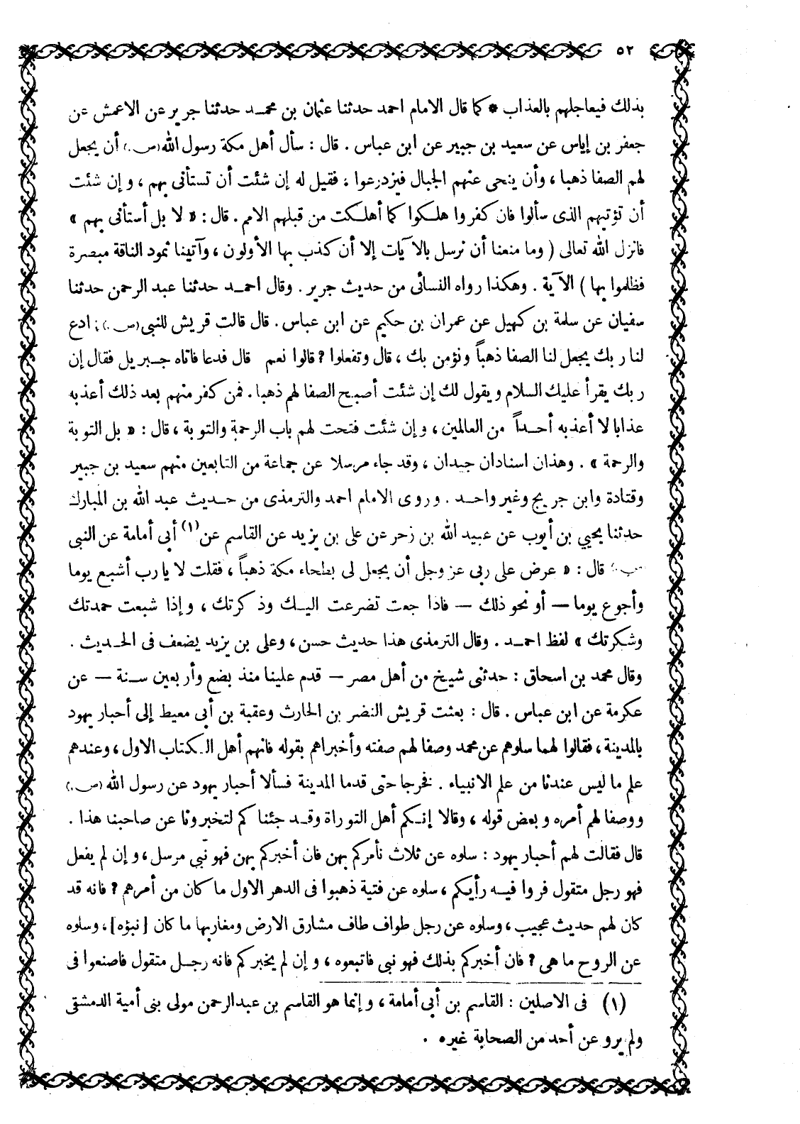 بِذَلِكَ فَيُعَاجِلُهُمْ بِالْعَذَابِ كَمَا قَالَ الْإِمَامُ أَحْمَدُ حَدَّثَنَا عُثْمَانُ بْنُ مُحَمَّدٍ حَدَّثَنَا جَرِيرٌ عَنِ الْأَعْمَشِ عَنْ جَعْفَرِ بْنِ إِيَاسٍ عَنْ سَعِيدِ بْنِ جُبَيْرٍ عَنِ ابْنِ عَبَّاسٍ. قَالَ: سَأَلَ أَهْلُ مَكَّةَ رَسُولَ اللَّهِ صَلَّى اللَّهُ عَلَيْهِ وَسَلَّمَ أَنْ يَجْعَلَ لَهُمُ الصَّفَا ذَهَبًا، وَأَنْ يُنَحِّيَ عَنْهُمُ الْجِبَالُ فَيَزْدَرِعُوا، فَقِيلَ لَهُ إِنْ شِئْتَ أَنْ تَسْتَأْنِيَ بِهِمْ، وَإِنْ شِئْتَ أَنْ تؤتيهم الّذي سألوا فان كفروا هلكوا كما أهلكت من قبلهم الأمم. قَالَ: «لَا بَلْ أَسَتَأْنِي بِهِمْ» فَأَنْزَلَ اللَّهُ تَعَالَى وَما مَنَعَنا أَنْ نُرْسِلَ بِالْآياتِ إِلَّا أَنْ كَذَّبَ بِهَا الْأَوَّلُونَ، وَآتَيْنا ثَمُودَ النَّاقَةَ مُبْصِرَةً فَظَلَمُوا بِها 17: 59 الْآيَةَ. وَهَكَذَا رَوَاهُ النَّسَائِيُّ مِنْ حَدِيثِ جَرِيرٍ. وَقَالَ أَحْمَدُ حَدَّثَنَا عَبْدُ الرَّحْمَنِ حَدَّثَنَا سُفْيَانُ عَنْ سَلَمَةَ بْنِ كُهَيْلٍ عَنْ عمران بن حكيم عَنِ ابْنِ عَبَّاسٍ. قَالَ قَالَتْ قُرَيْشٌ لِلنَّبِيِّ صَلَّى اللَّهُ عَلَيْهِ وَسَلَّمَ: ادْعُ لَنَا رَبَّكَ يجعل لنا الصفا ذهبا ونؤمن بك، وقال وتفعلوا؟ قَالُوا نَعَمْ قَالَ فَدَعَا فَأَتَاهُ جِبْرِيلُ فَقَالَ إِنَّ رَبَّكَ يَقْرَأُ عَلَيْكَ السَّلَامَ وَيَقُولُ لَكَ إِنْ شِئْتَ أَصْبَحَ الصَّفَا لَهُمْ ذَهَبًا. فَمَنْ كفر منهم بعد ذلك أُعَذِّبُهُ عَذَابًا لَا أُعَذِّبُهُ أَحَدًا مِنَ الْعَالَمِينَ، وَإِنْ شِئْتَ فَتَحْتُ لَهُمْ بَابَ الرَّحْمَةِ وَالتَّوْبَةِ، قَالَ: «بَلِ التَّوْبَةُ وَالرَّحْمَةُ» . وَهَذَانَ إِسْنَادَانِ جَيِّدَانِ، وَقَدْ جَاءَ مُرْسَلًا عَنْ جَمَاعَةٍ مِنَ التَّابِعِينَ مِنْهُمْ سَعِيدُ بْنُ جُبَيْرٍ وَقَتَادَةُ وَابْنُ جُرَيْجٍ وَغَيْرُ وَاحِدٍ. وَرَوَى الْإِمَامُ أَحْمَدُ وَالتِّرْمِذِيُّ مِنْ حَدِيثِ عَبْدِ اللَّهِ بْنِ الْمُبَارَكِ حَدَّثَنَا يَحْيَى بْنُ أَيُّوبَ عَنْ عُبَيْدِ اللَّهِ بْنِ زَحْرٍ عَنْ عَلِيِّ بْنِ يَزِيدَ عَنِ الْقَاسِمِ عَنْ [1] أَبِي أُمَامَةَ عَنِ النَّبِيِّ صَلَّى اللَّهُ عَلَيْهِ وَسَلَّمَ قَالَ: «عَرَضَ عَلَيَّ رَبِّي عَزَّ وَجَلَّ أَنْ يَجْعَلَ لِي بَطْحَاءَ مَكَّةَ ذَهَبًا، فَقُلْتُ لَا يَا رَبُّ أَشْبَعُ يَوْمًا وَأَجُوعُ يَوْمًا- أَوْ نَحْوَ ذَلِكَ- فَإِذَا جُعْتُ تَضَرَّعْتُ إِلَيْكَ وَذَكَرْتُكَ، وَإِذَا شَبِعْتُ حَمِدْتُكَ وَشَكَرْتُكَ» لَفْظُ أَحْمَدَ. وَقَالَ التِّرْمِذِيُّ هَذَا حَدِيثٌ حَسَنٌ، وَعَلِيُّ بْنُ يَزِيدَ يُضَعَّفُ فِي الْحَدِيثِ.