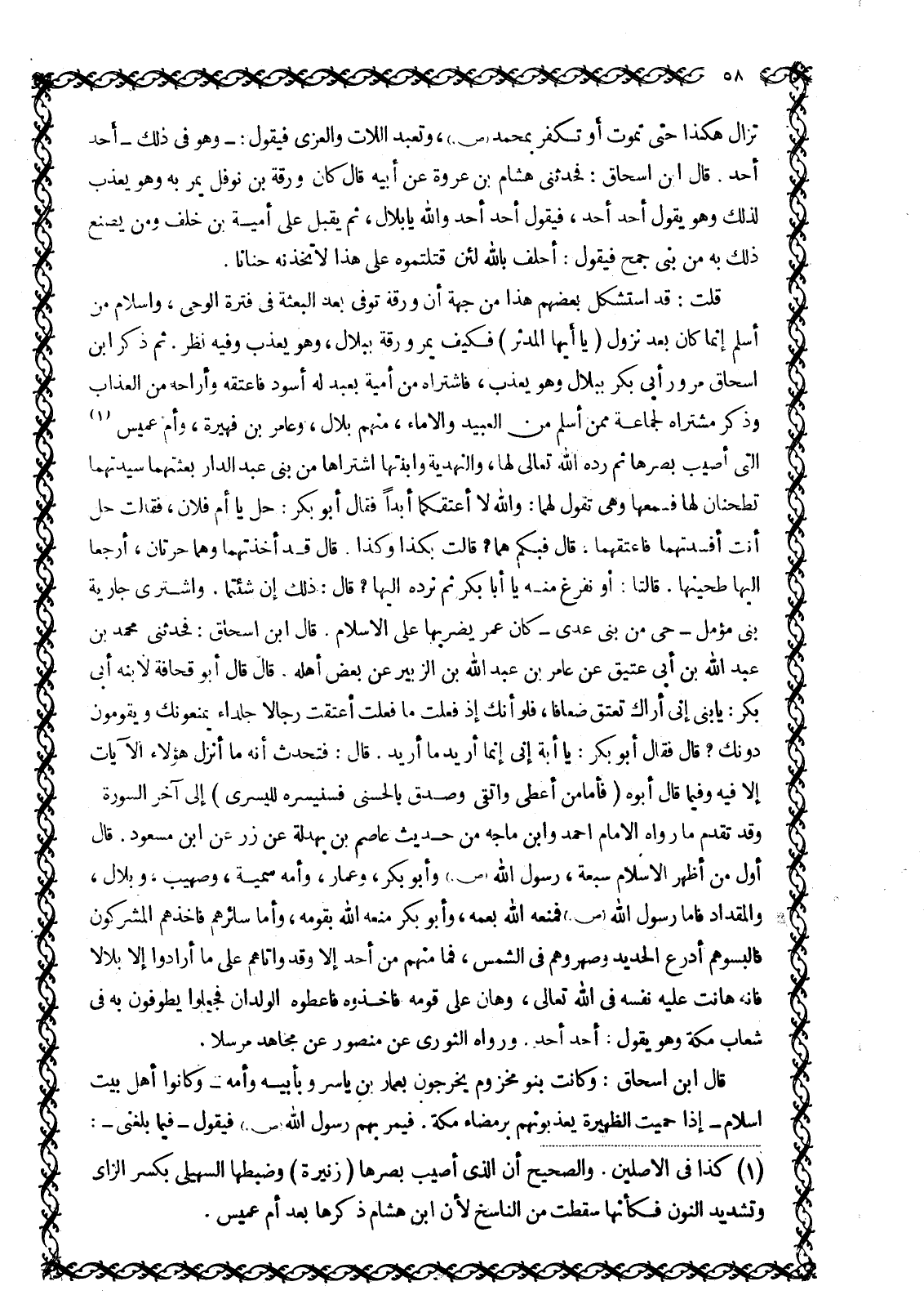 [1] كذا في الأصلين. والصحيح أن الّذي أصيب بصرها (زنيرة) وضبطها السهيليّ بكسر الزاى وتشديد النون فكأنها سقطت من الناسخ لأن ابن هشام ذكرها بعد أم عميس.
