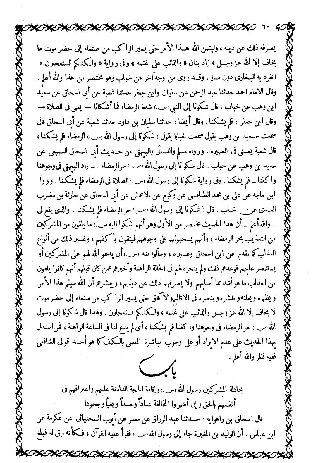 وَقَالَ الْإِمَامُ أَحْمَدُ حَدَّثَنَا عَبْدُ الرَّحْمَنِ عَنْ سفيان وَابْنُ جَعْفَرٍ حَدَّثَنَا شُعْبَةُ عَنْ أَبِي إِسْحَاقَ عن سعيد ابن وَهْبٍ عَنْ خَبَّابٍ. قَالَ شَكَوْنَا إِلَى النَّبِيِّ صَلَّى اللَّهُ عَلَيْهِ وَسَلَّمَ شِدَّةَ الرَّمْضَاءِ فَمَا أَشْكَانَا- يَعْنِي فِي الصَّلَاةِ- وَقَالَ ابْنُ جَعْفَرٍ: فَلَمْ يُشْكِنَا. وَقَالَ أَيْضًا: حَدَّثَنَا سُلَيْمَانُ بْنُ دَاوُدَ حَدَّثَنَا شُعْبَةُ عَنْ أَبِي إِسْحَاقَ قَالَ سَمِعْتُ سَعِيدَ بْنَ وَهْبٍ يَقُولُ سَمِعْتُ خَبَّابًا يقول: شَكَوْنَا إِلَى رَسُولِ اللَّهِ صَلَّى اللَّهُ عَلَيْهِ وَسَلَّمَ الرَّمْضَاءِ فَلَمْ يُشْكِنَا، قَالَ شُعْبَةُ يَعْنِي فِي الظهيرة. وَرَوَاهُ مُسْلِمٌ وَالنَّسَائِيُّ وَالْبَيْهَقِيُّ مِنْ حَدِيثِ أَبِي إِسْحَاقَ السَّبِيعِيِّ عَنْ سَعِيدِ بْنِ وَهْبٍ عَنْ خَبَّابٍ. قَالَ شَكَوْنَا إِلَى رَسُولِ اللَّهِ صَلَّى اللَّهُ عَلَيْهِ وَسَلَّمَ حَرَّ الرَّمْضَاءِ. - زَادَ الْبَيْهَقِيُّ فِي وُجُوهِنَا وَأَكُفِّنَا- فَلَمْ يُشْكِنَا. وَفِي رِوَايَةٍ شَكَوْنَا إِلَى رَسُولِ اللَّهِ صَلَّى اللَّهُ عَلَيْهِ وَسَلَّمَ الصَّلَاةَ فِي الرَّمْضَاءِ فَلَمْ يُشْكِنَا. وَرَوَاهُ ابْنُ مَاجَهْ عَنْ عَلِيِّ بْنِ مُحَمَّدٍ الطَّنَافِسِيِّ عَنْ وَكِيعٍ عَنِ الْأَعْمَشِ عَنْ أَبِي إِسْحَاقَ عَنْ حَارِثَةَ بْنِ مُضَرِّبٍ الْعَبْدِيِّ عَنْ خَبَّابٍ. قَالَ: شَكَوْنَا إِلَى رَسُولِ اللَّهِ صَلَّى اللَّهُ عَلَيْهِ وَسَلَّمَ حَرَّ الرَّمْضَاءِ فَلَمْ يُشْكِنَا. وَالَّذِي يَقَعُ لِي- وَاللَّهُ أَعْلَمُ- أَنَّ هَذَا الْحَدِيثَ مُخْتَصَرٌ مِنَ الْأَوَّلِ وَهُوَ أَنَّهُمْ شَكَوْا إِلَيْهِ صَلَّى اللَّهُ عَلَيْهِ وَسَلَّمَ مَا يَلْقَوْنَ مِنَ الْمُشْرِكِينَ مِنَ التَّعْذِيبِ بِحَرِّ الرَّمْضَاءِ، وَأَنَّهُمْ يَسْحَبُونَهُمْ عَلَى وُجُوهِهِمْ فَيَتَّقُونَ بِأَكُفِّهِمْ، وَغَيْرِ ذَلِكَ مِنْ أَنْوَاعِ الْعَذَابِ كَمَا تَقَدَّمَ عَنِ ابْنِ إِسْحَاقَ وَغَيْرِهِ، وَسَأَلُوا مِنْهُ صَلَّى اللَّهُ عَلَيْهِ وَسَلَّمَ أَنْ يَدْعُوَ اللَّهَ لَهُمْ عَلَى الْمُشْرِكِينَ أَوْ يَسْتَنْصِرَ عَلَيْهِمْ فَوَعَدَهُمْ ذَلِكَ وَلَمْ يُنْجِزْهُ لَهُمْ فِي الْحَالَةِ الرَّاهِنَةِ وَأَخْبَرَهُمْ عَمَّنْ كَانَ قَبْلَهُمْ أَنَّهُمْ كَانُوا يَلْقَوْنَ مِنَ الْعَذَابِ مَا هُوَ أَشَدُّ مِمَّا أَصَابَهُمْ وَلَا يَصْرِفُهُمْ ذَلِكَ عَنْ دِينِهِمْ، وَيُبَشِّرُهُمْ أَنَّ اللَّهَ سَيُتِمُّ هَذَا الْأَمْرَ ويظهره ويعلنه وَيَنْشُرُهُ وَيَنْصُرُهُ فِي الْأَقَالِيمِ وَالْآفَاقِ حَتَّى يَسِيرَ الراكب من صنعاء إلى حضر موت لَا يَخَافُ إِلَّا اللَّهَ عَزَّ وَجَلَّ وَالذِّئْبَ عَلَى غَنَمِهِ، وَلَكِنَّكُمْ تَسْتَعْجِلُونَ. وَلِهَذَا قَالَ شَكَوْنَا إِلَى رَسُولِ اللَّهِ صَلَّى اللَّهُ عَلَيْهِ وَسَلَّمَ حَرَّ الرَّمْضَاءِ فِي وُجُوهِنَا وَأَكُفِّنَا فَلَمْ يُشْكِنَا، أَيْ لَمْ يَدْعُ لَنَا فِي السَّاعَةِ الرَّاهِنَةِ، فمن استدل بهذا الحديث على عدم الإيراد أَوْ عَلَى وُجُوبِ مُبَاشَرَةِ الْمُصَلِّي بِالْكَفِّ كَمَا هُوَ أَحَدُ قَوْلَيِ الشَّافِعِيِّ فَفِيهِ نَظَرٌ وَاللَّهُ أَعْلَمُ.