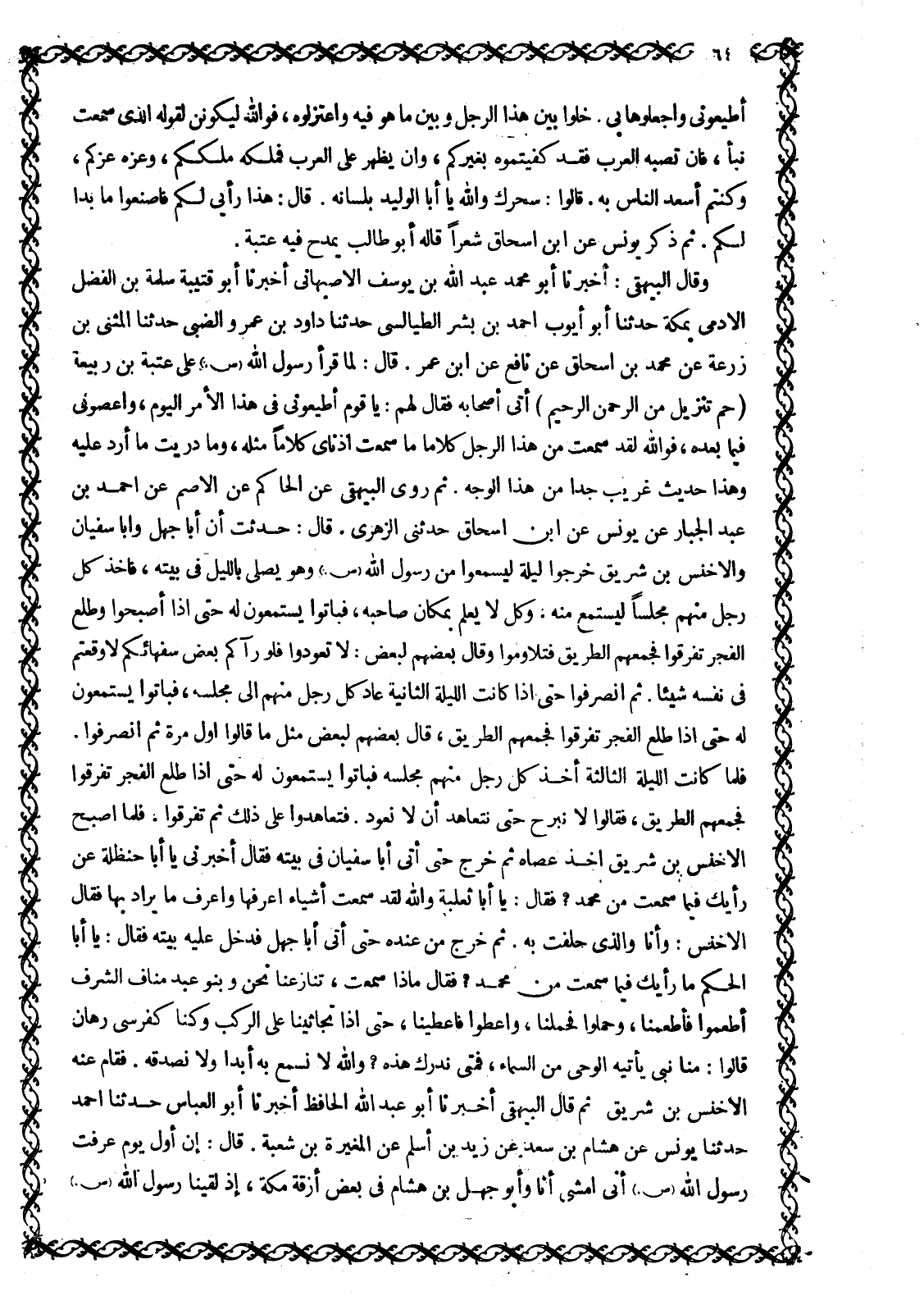 وَقَالَ الْبَيْهَقِيُّ: أَخْبَرَنَا أَبُو مُحَمَّدٍ عَبْدُ اللَّهِ بْنُ يُوسُفَ الْأَصْبَهَانِيُّ أَخْبَرَنَا أَبُو قُتَيْبَةَ سَلَمَةُ بْنُ الْفَضْلِ الْآدَمِيُّ بِمَكَّةَ حَدَّثَنَا أَبُو أَيُّوبَ أَحْمَدُ بْنُ بِشْرٍ الطَّيَالِسِيُّ حَدَّثَنَا دَاوُدُ بْنُ عَمْرٍو الضَّبِّيُّ حَدَّثَنَا الْمُثَنَّى بْنُ زُرْعَةَ عَنْ مُحَمَّدِ بْنِ إِسْحَاقَ عَنْ نَافِعٍ عَنِ ابْنِ عُمَرَ. قَالَ: لَمَّا قَرَأَ رَسُولُ اللَّهِ صَلَّى اللَّهُ عَلَيْهِ وَسَلَّمَ عَلَى عُتْبَةَ بْنِ رَبِيعَةَ (حم تَنْزِيلٌ مِنَ الرَّحْمنِ الرَّحِيمِ) 41: 1- 2 أَتَى أَصْحَابَهُ فَقَالَ لَهُمْ: يَا قَوْمِ أَطِيعُونِي فِي هَذَا الْأَمْرِ الْيَوْمَ، وَاعْصُونِي فِيمَا بَعْدَهُ، فو الله لَقَدْ سَمِعْتُ مِنْ هَذَا الرَّجُلِ كَلَامًا مَا سَمِعَتْ أُذُنَايَ كَلَامًا مِثْلَهُ، وَمَا دَرَيْتُ مَا أَرُدُّ عَلَيْهِ وَهَذَا حَدِيثٌ غَرِيبٌ جِدًّا مِنْ هَذَا الْوَجْهِ. ثُمَّ رَوَى الْبَيْهَقِيُّ عَنِ الْحَاكِمِ عَنِ الْأَصَمِّ عَنْ أَحْمَدَ بْنِ عَبْدِ الْجَبَّارِ عَنْ يُونُسَ عَنِ ابْنِ إِسْحَاقَ حَدَّثَنِي الزُّهْرِيُّ. قَالَ: حُدِّثْتُ أَنَّ أَبَا جَهْلٍ وَأَبَا سُفْيَانَ وَالْأَخْنَسَ بْنَ شَرِيقٍ خَرَجُوا لَيْلَةً لِيَسْمَعُوا مِنْ رَسُولِ اللَّهِ صَلَّى اللَّهُ عَلَيْهِ وَسَلَّمَ وَهُوَ يُصَلِّي بِاللَّيْلِ فِي بَيْتِهِ، فَأَخَذَ كُلُّ رَجُلٍ مِنْهُمْ مَجْلِسًا لِيَسْتَمِعَ مِنْهُ، وَكُلٌّ لَا يَعْلَمُ بِمَكَانِ صَاحِبِهِ، فَبَاتُوا يَسْتَمِعُونَ لَهُ حَتَّى إِذَا أَصْبَحُوا وَطَلَعَ الْفَجْرُ تَفَرَّقُوا فَجَمَعَهُمُ الطَّرِيقُ فَتَلَاوَمُوا وَقَالَ بَعْضُهُمْ لِبَعْضٍ: لَا تَعُودُوا فَلَوْ رَآكُمْ بعض سفهائكم لا وقعتم فِي نَفْسِهِ شَيْئًا. ثُمَّ انْصَرَفُوا حَتَّى إِذَا كَانَتِ اللَّيْلَةُ الثَّانِيَةُ عَادَ كُلُّ رَجُلٍ مِنْهُمْ إِلَى مَجْلِسِهِ، فَبَاتُوا يَسْتَمِعُونَ لَهُ حَتَّى إِذَا طلع الفجر تفرقوا فجمعهم الطريق، قال بَعْضُهُمْ لِبَعْضٍ مِثْلَ مَا قَالُوا أَوَّلَ مَرَّةٍ ثُمَّ انْصَرَفُوا.
