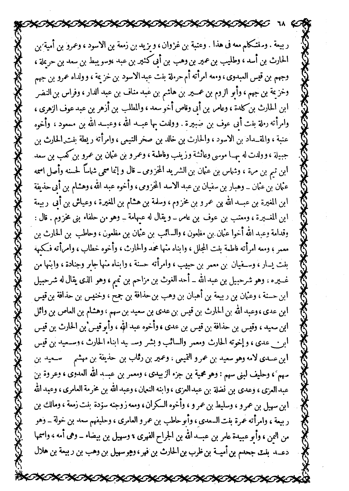 رَبِيعَةَ. وَسَنَتَكَلَّمُ مَعَهُ فِي هَذَا. وَعُتْبَةُ بْنُ غَزْوَانَ، وَيَزِيدُ بْنُ زَمْعَةَ بْنِ الْأَسْوَدِ، وَعَمْرُو بْنُ أُمَيَّةَ بْنِ الْحَارِثِ بْنِ أَسَدٍ، وَطُلَيْبُ بْنُ عُمَيْرِ بْنِ وَهْبِ بْنِ أَبِي كَثِيرِ بن عبد، وسويبط بن سعد بن حريملة، وجهم بن قيس العبدوي، وَمَعَهُ امْرَأَتُهُ أُمُّ حَرْمَلَةَ بِنْتُ عَبْدِ الْأَسْوَدِ بْنِ خُزَيْمَةَ، وَوَلَدَاهُ عَمْرُو بْنُ جَهْمٍ وَخُزَيْمَةُ بْنُ جَهْمٍ، وَأَبُو الرُّومِ بْنُ عُمَيْرِ بْنِ هَاشِمِ بْنِ عَبْدِ مَنَافِ بْنِ عَبْدِ الدَّارِ، وفراس بن النضر ابن الْحَارِثِ بْنِ كَلَدَةَ، وَعَامِرُ بْنُ أَبِي وَقَّاصٍ أَخُو سَعْدٍ، وَالْمُطَّلِبُ بْنُ أَزْهَرَ بْنِ عَبْدِ عَوْفٍ الزُّهْرِيُّ، وَامْرَأَتُهُ رَمْلَةُ بِنْتُ أَبِي عَوْفِ بن صبيرة. وولدت بِهَا عَبْدَ اللَّهِ وَعَبْدُ اللَّهِ بْنُ مَسْعُودٍ، وَأَخُوهُ عُتْبَةُ، وَالْمِقْدَادُ بْنُ الْأَسْوَدِ، وَالْحَارِثُ بْنُ خَالِدِ بْنِ صَخْرٍ التَّيْمِيُّ، وَامْرَأَتُهُ رَيْطَةُ بِنْتُ الْحَارِثِ بْنِ جُبَيْلَةَ، وَوَلَدَتْ لَهُ بِهَا مُوسَى وَعَائِشَةَ وَزَيْنَبَ وَفَاطِمَةَ، وَعَمْرُو بْنُ عُثْمَانَ بْنِ عَمْرِو بْنِ كَعْبِ بْنِ سعد ابن تَيْمِ بْنِ مُرَّةَ، وَشَمَّاسُ بْنُ عُثْمَانَ بْنِ الشَّرِيدِ الْمَخْزُومِيُّ- قَالَ وَإِنَّمَا سُمِّيَ شَمَّاسًا لِحُسْنِهِ وَأَصْلُ اسْمِهِ عُثْمَانُ بْنُ عُثْمَانَ- وَهُبَّارُ بْنُ سُفْيَانَ بْنِ عَبْدِ الْأَسَدِ الْمَخْزُومِيُّ، وَأَخُوهُ عَبْدُ الله، وهشام بن أبى حذيفة ابن الْمُغِيرَةُ بْنُ عَبْدِ اللَّهِ بْنِ عَمْرِو بْنِ مَخْزُومٍ، وَسَلَمَةُ بْنُ هِشَامِ بْنِ الْمُغِيرَةِ، وَعَيَّاشُ بن أبى ربيعة ابن الْمُغِيرَةِ، وَمُعَتِّبُ بْنُ عَوْفِ بْنِ عَامِرٍ- وَيُقَالُ لَهُ عَيْهَامَةُ- وَهُوَ مِنْ حُلَفَاءِ بَنِي مَخْزُومٍ. قَالَ: